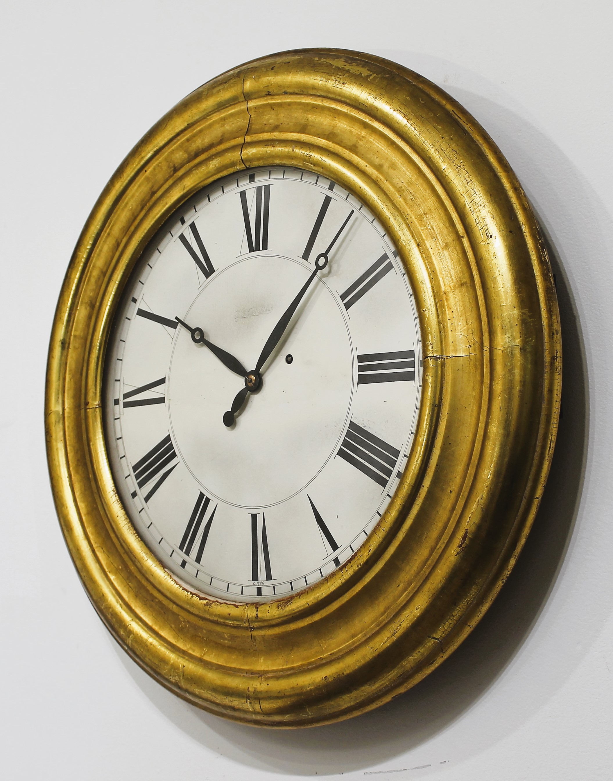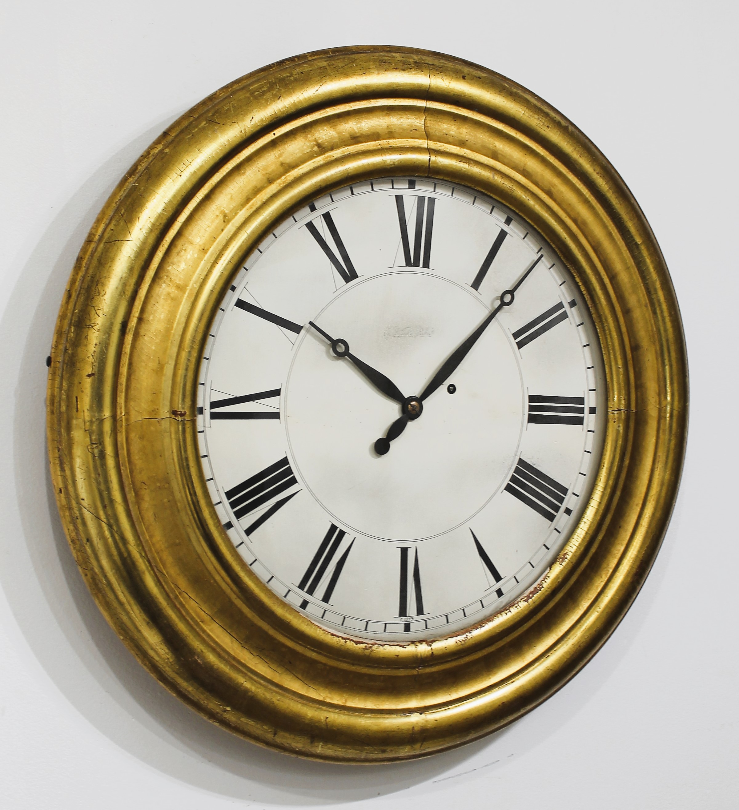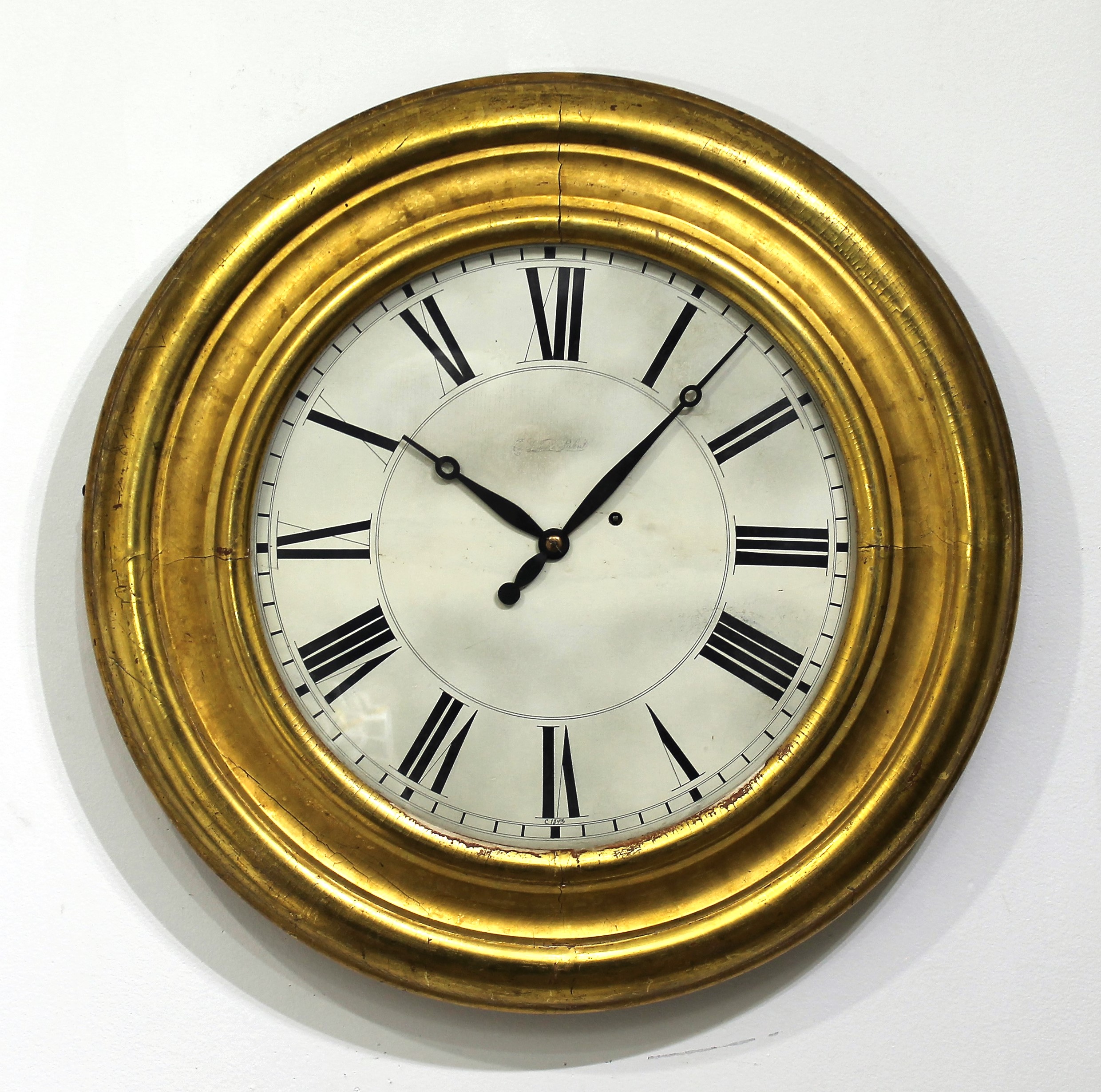 made gallery clocks in several sizes and many (all?) were gilded. This one is 26 inches in diameter with a 16-inch dial. The gilding is well preserved, the flat glass is period and possibly original; the dial is wood, repainted across the middle but it