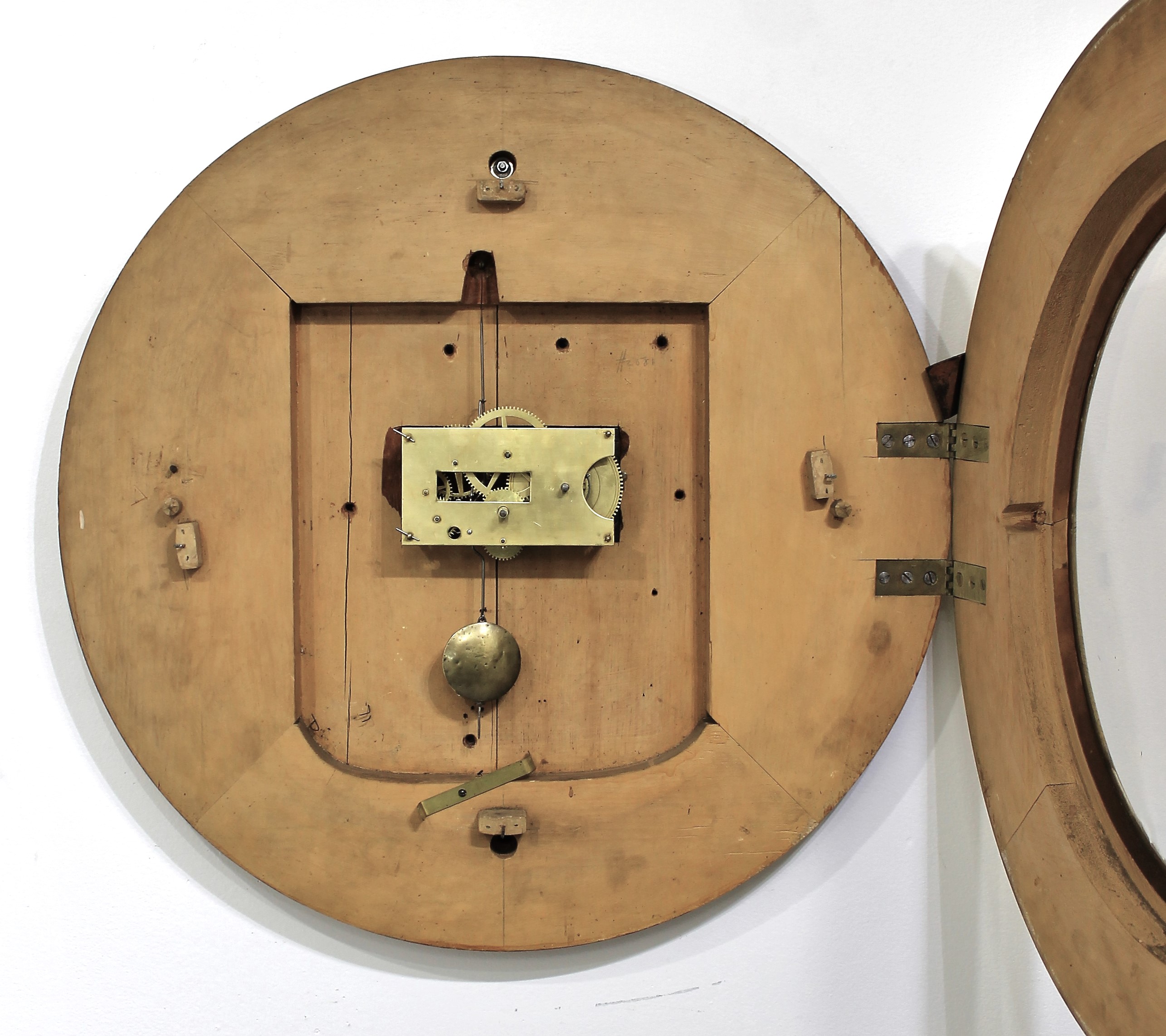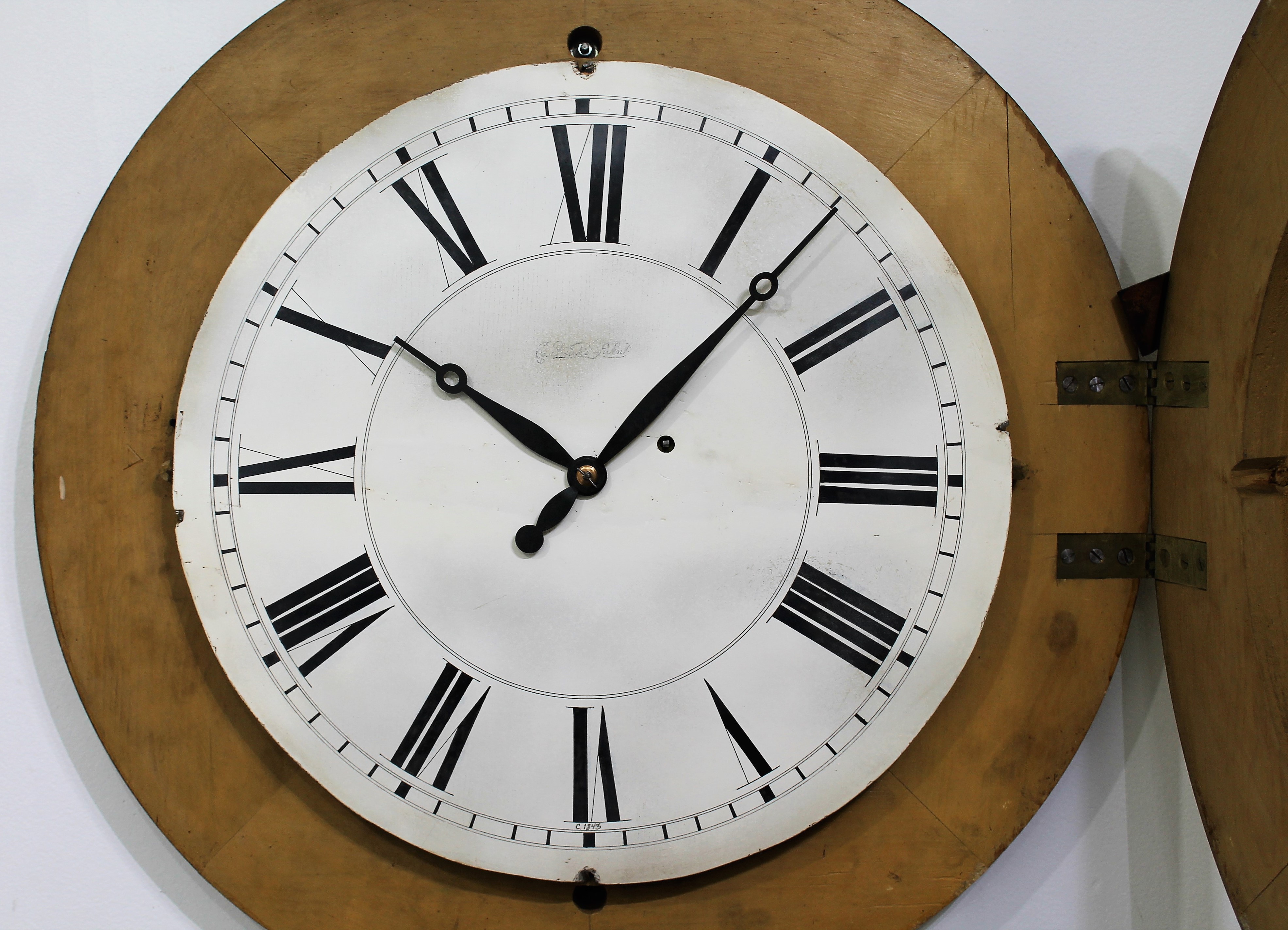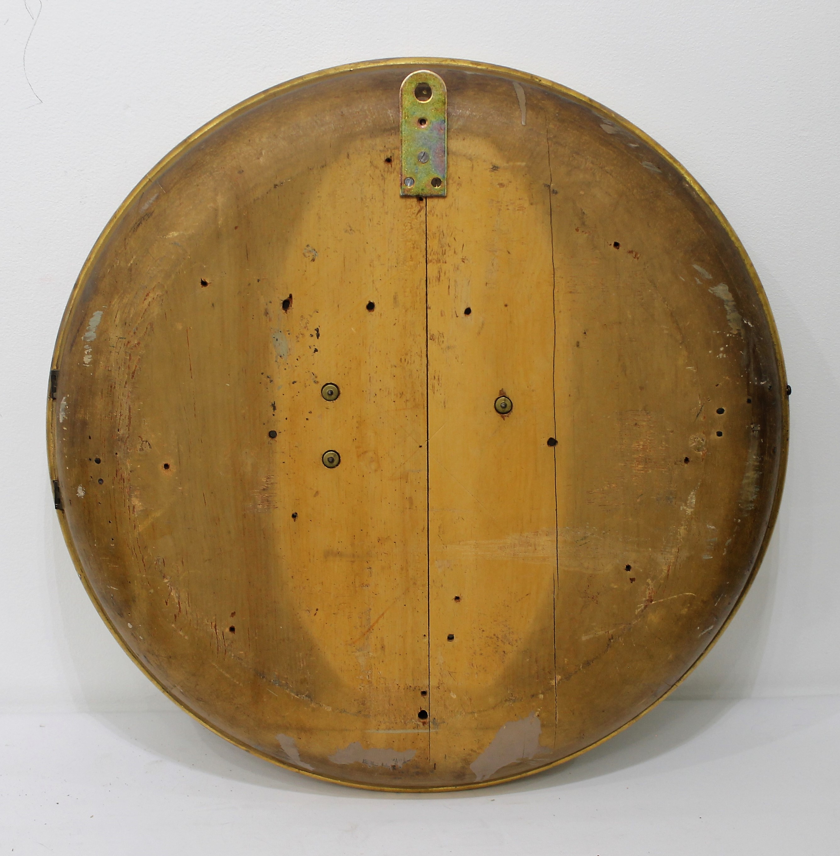 made gallery clocks in several sizes and many (all?) were gilded. This one is 26 inches in diameter with a 16-inch dial. The gilding is well preserved, the flat glass is period and possibly original; the dial is wood, repainted across the middle but it