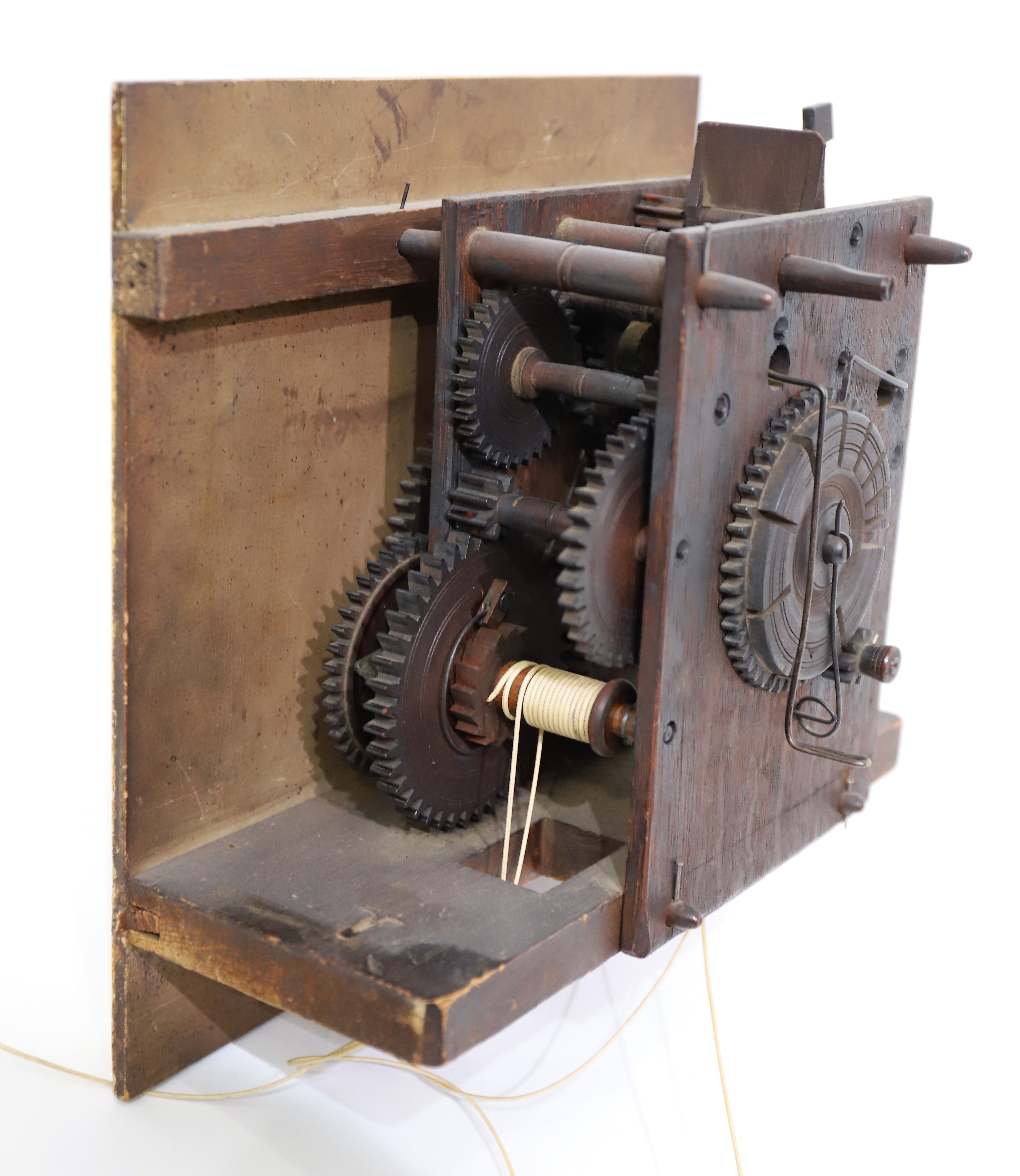 dial is old but perhaps not original. The wooden dial is clean, the hands are cast spelter metal, and the seconds bit is old. I hung the weights but it wasn’t agreeable to running; the bell that should be on top of the movement is gone so it won’t strike. There is a remarkable paper label inside behind a sheet of plastic, and a pendulum bob and rod. There are no sales of Boardman