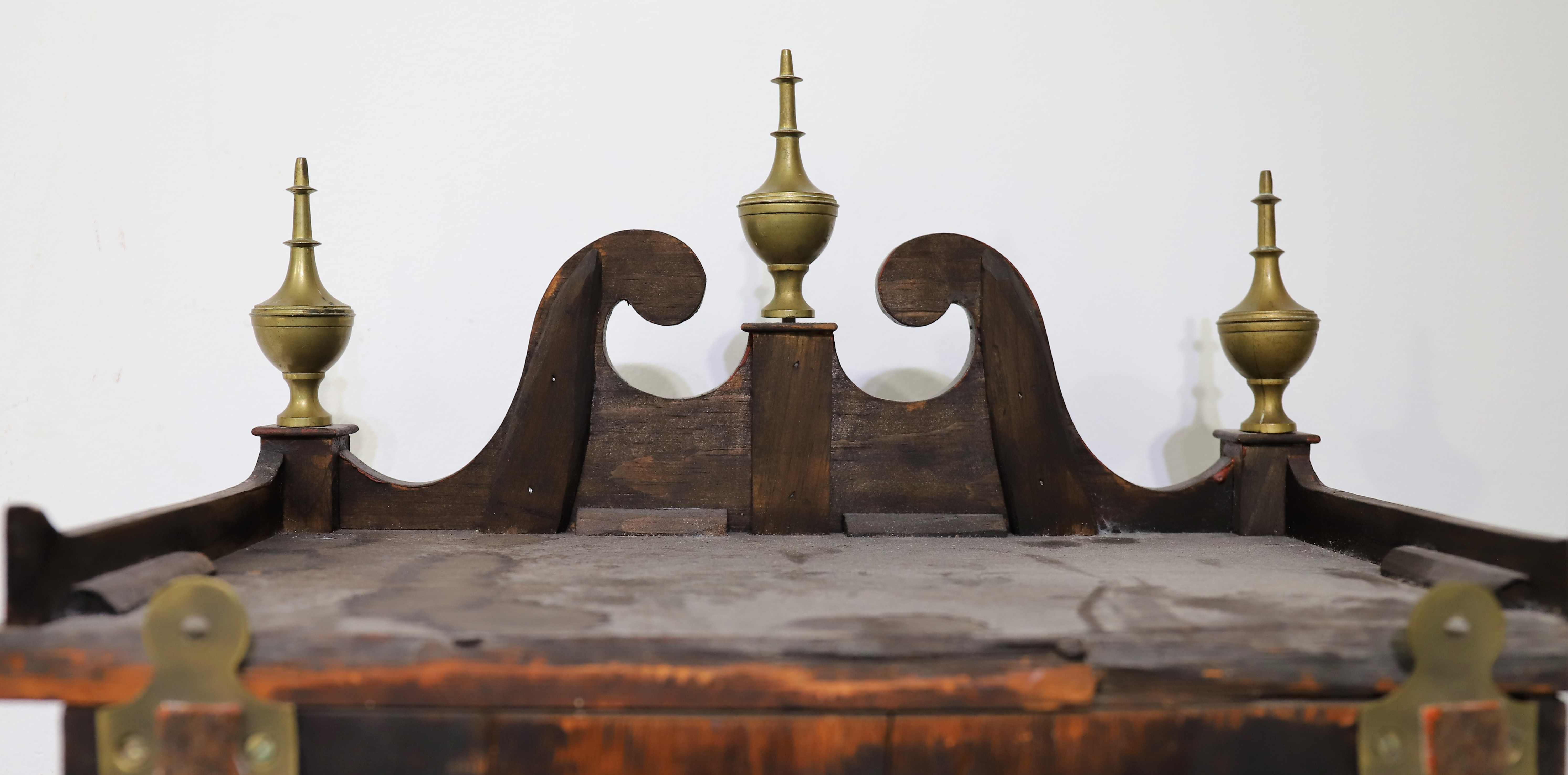 finials, has a 30-hour time-and-strike, pull-up movement with two sand-filled tin weights. The case may have been made by Chauncey