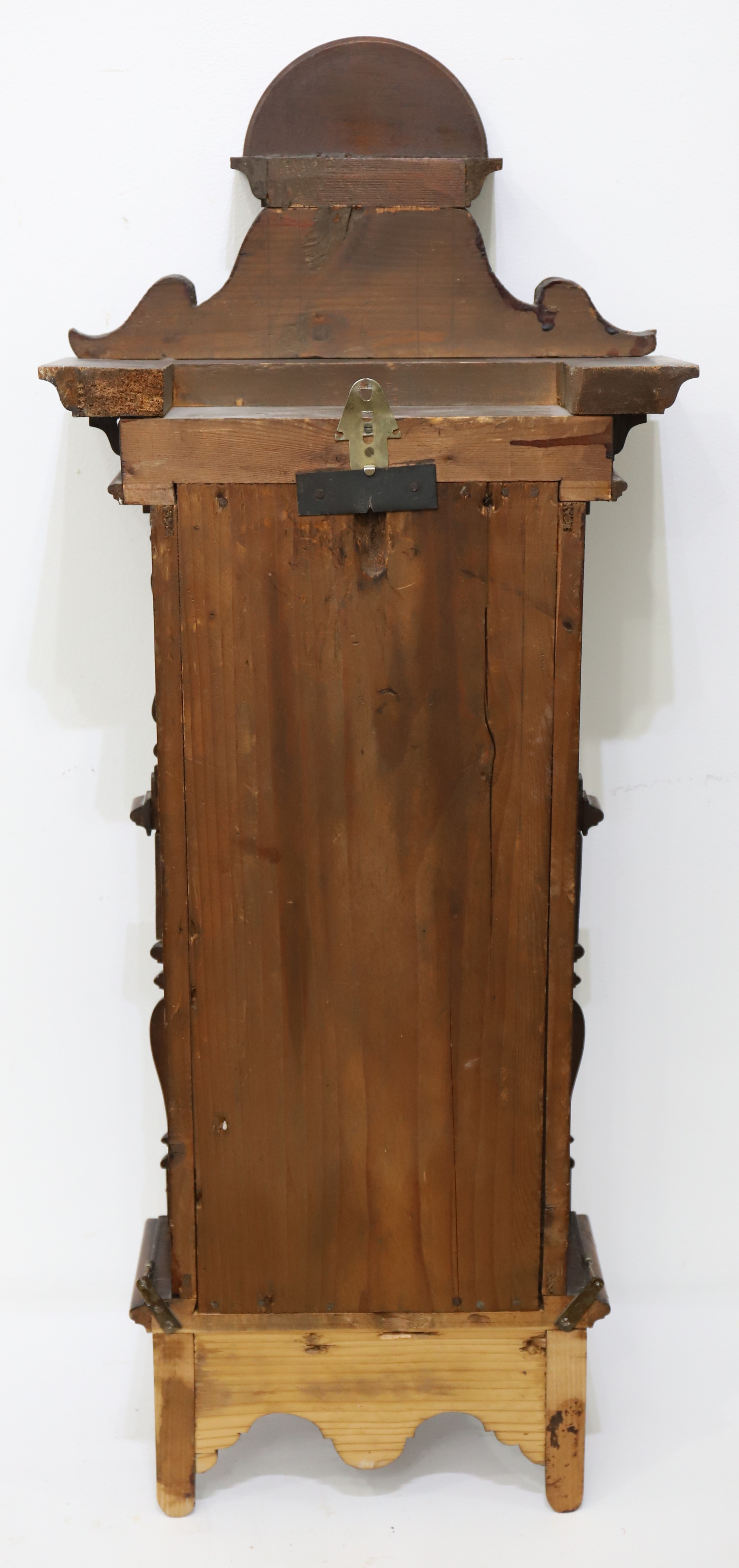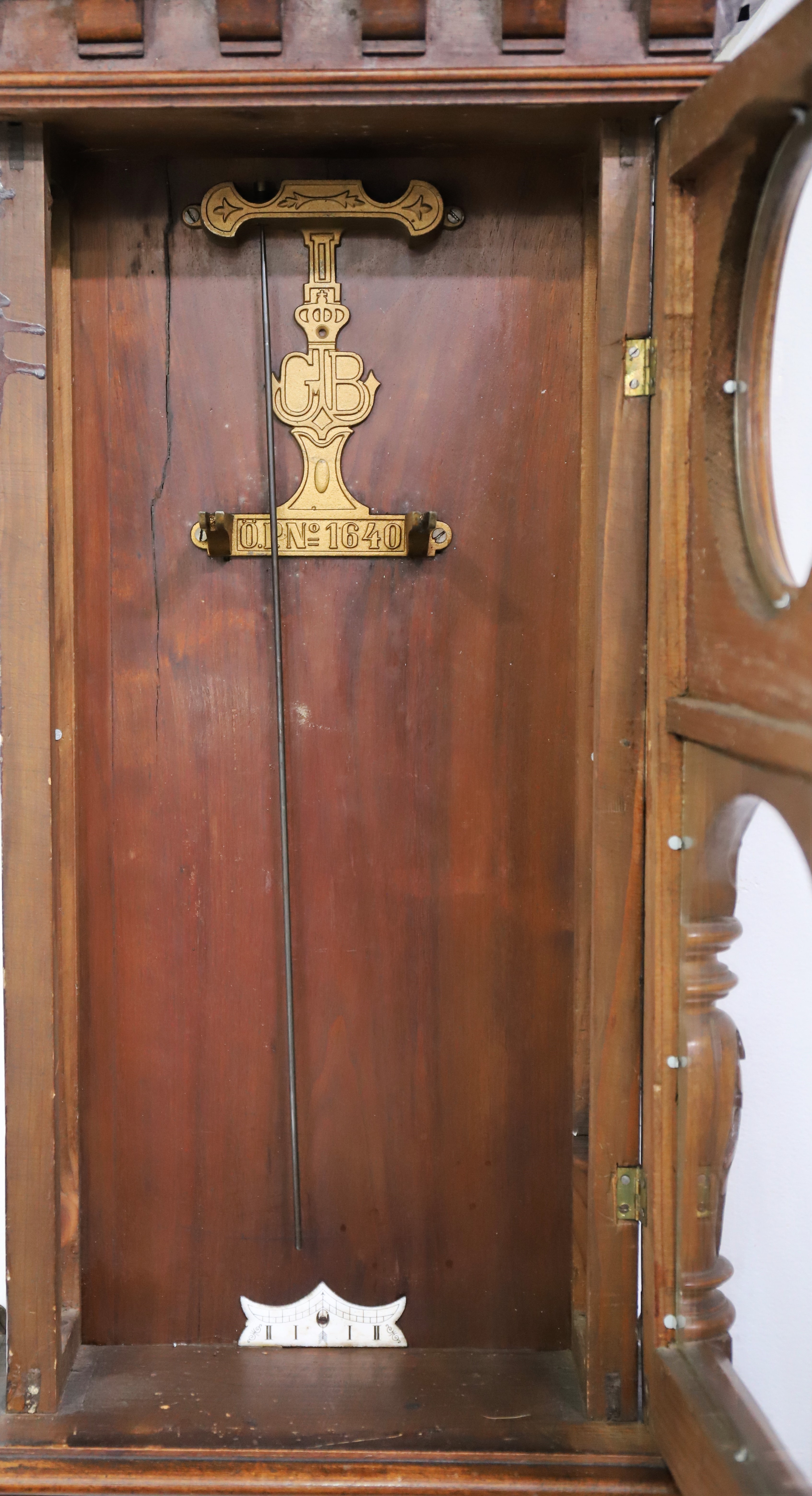 case with a full-length door and “portico” for the pendulum. The case has lots of carved elements and metal trim pieces and