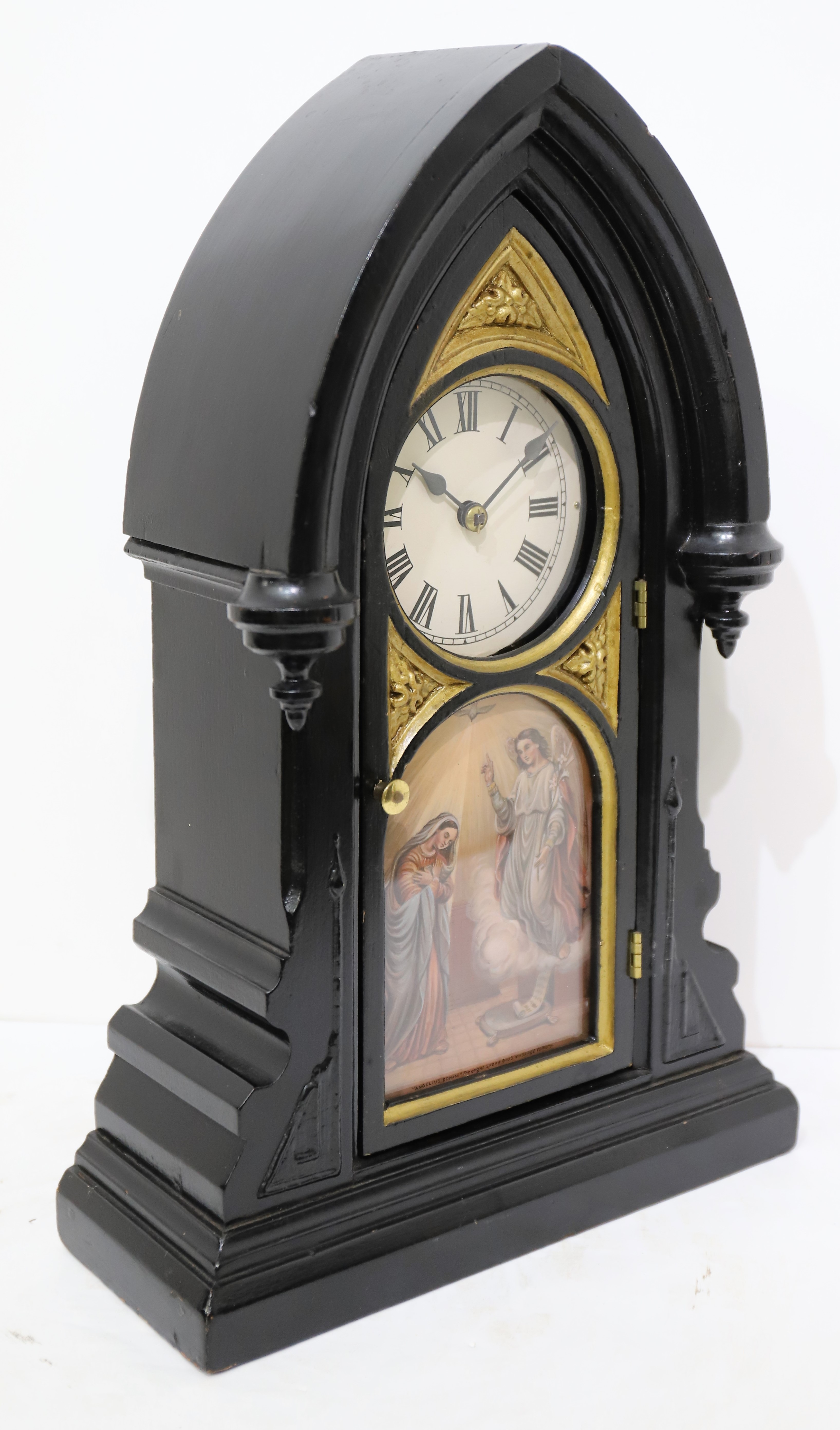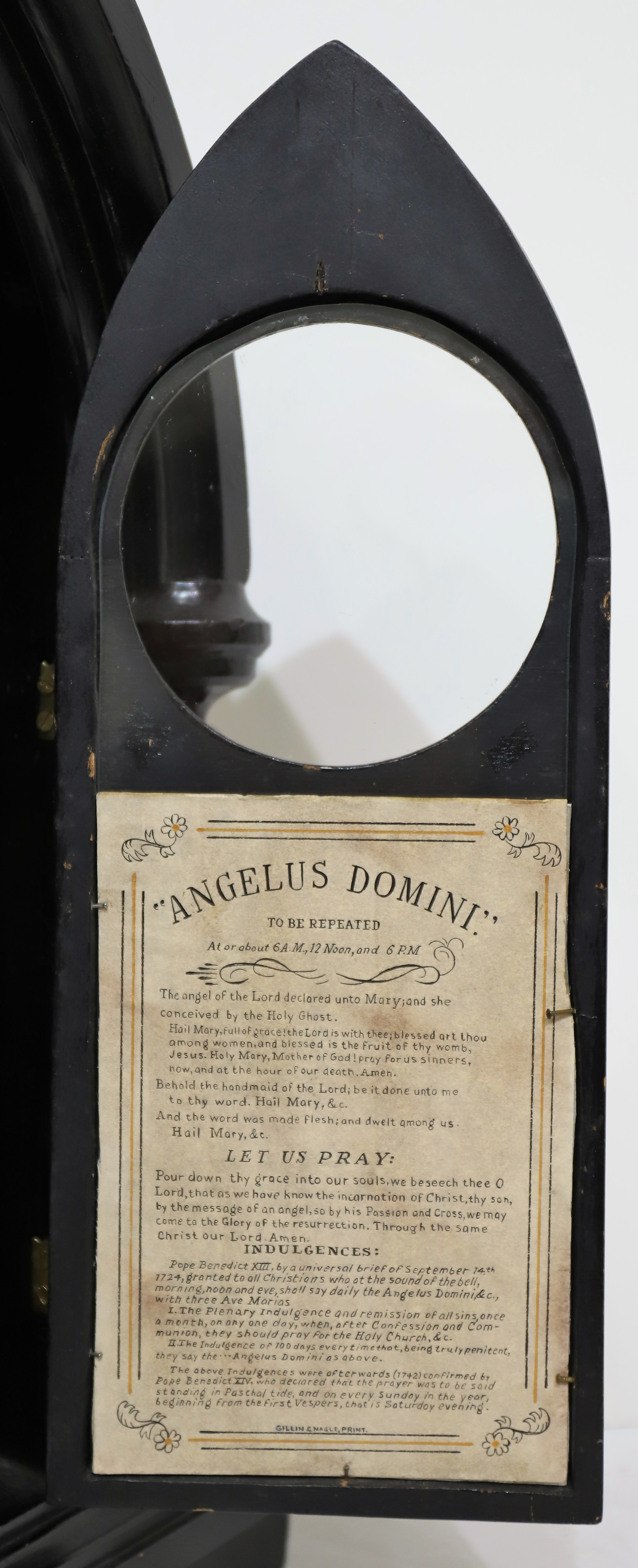 example of this unusual and rare clock, this one in black lacquer with gold trim in the door around the dial; it has been repainted. A picture of the angel Gabriel announcing the coming of Christ to Mary is shown in the door; this picture is found in most Angelus