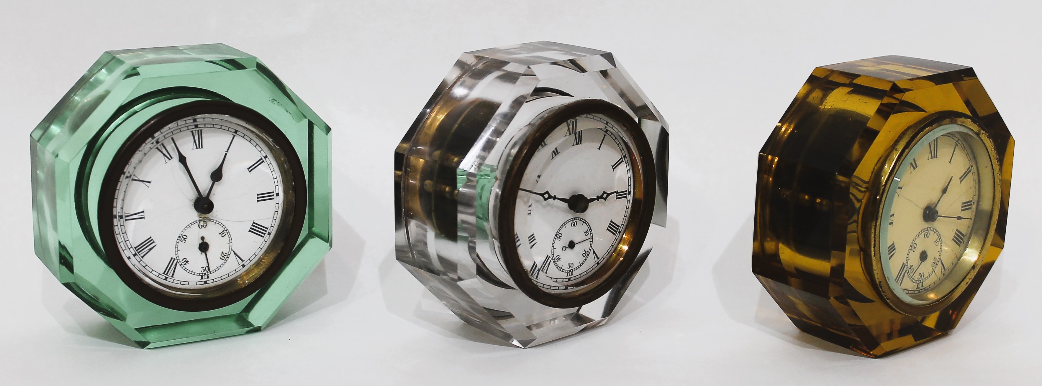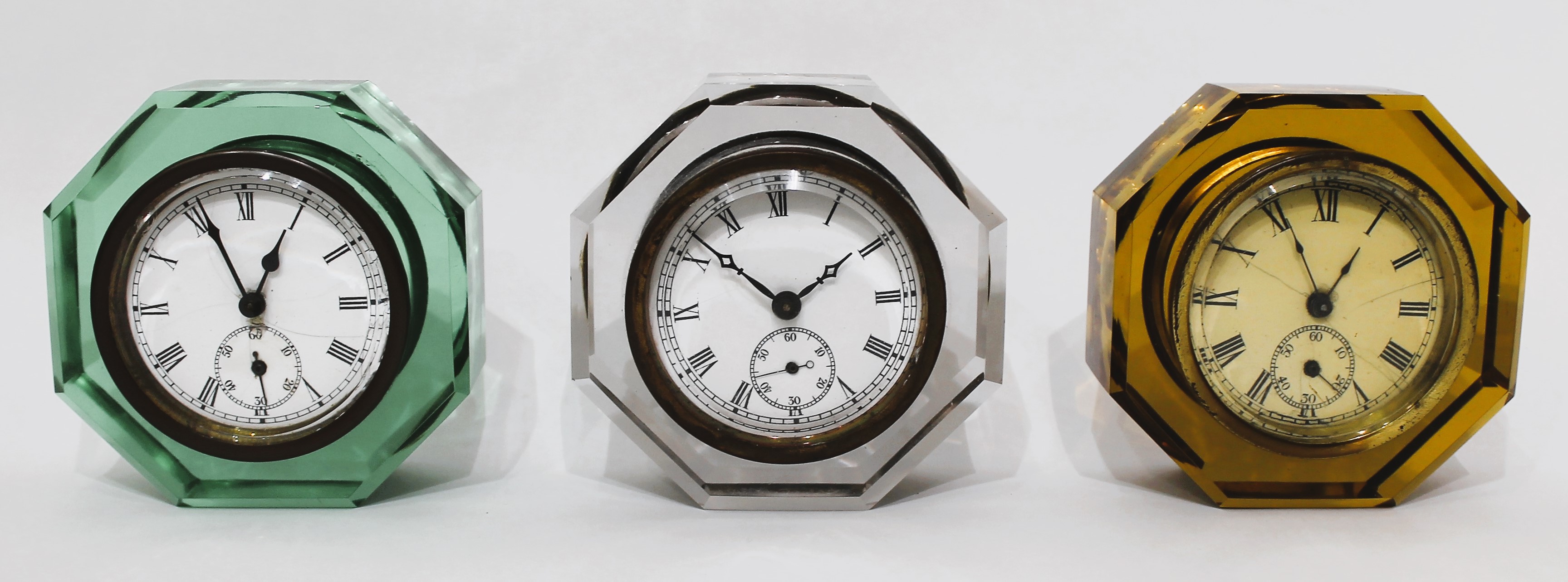 free of chips and cracks, with little wear. Each has a beveled glass over the porcelain dial; the green and amber clock dials