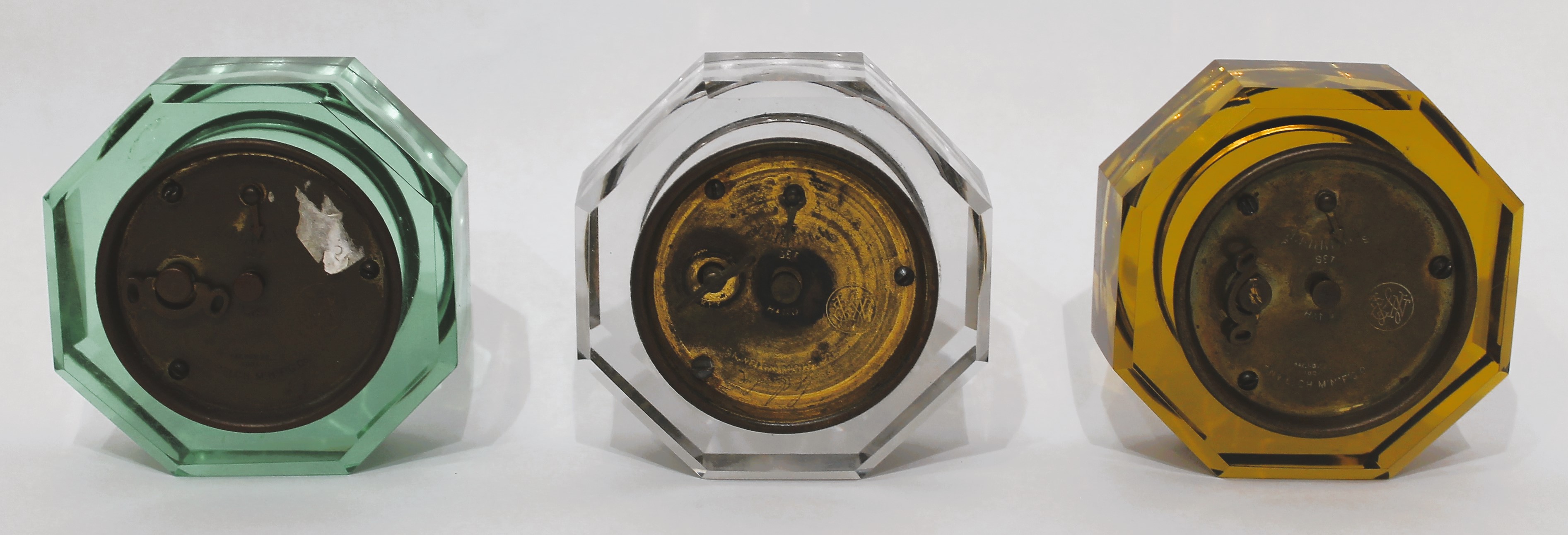 E.N. Welch Manufacturing Co. “Jewel” paperweight timepieces, ca. 1885. Four-inch cut-glass cases containing a 1-day time-only backwind lever movement in green, clear, and amber glass. The cases are