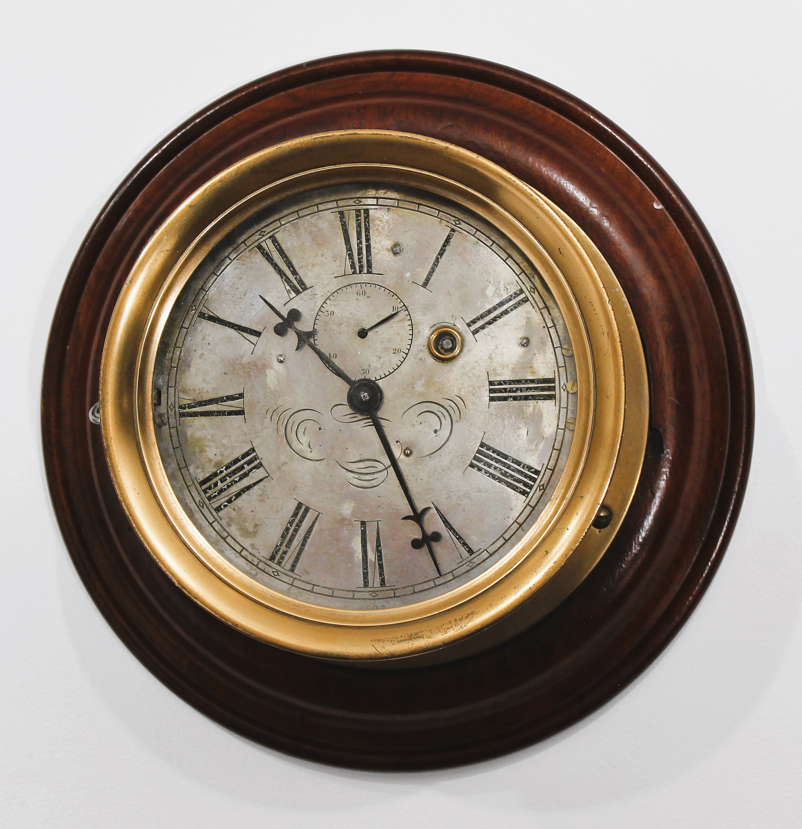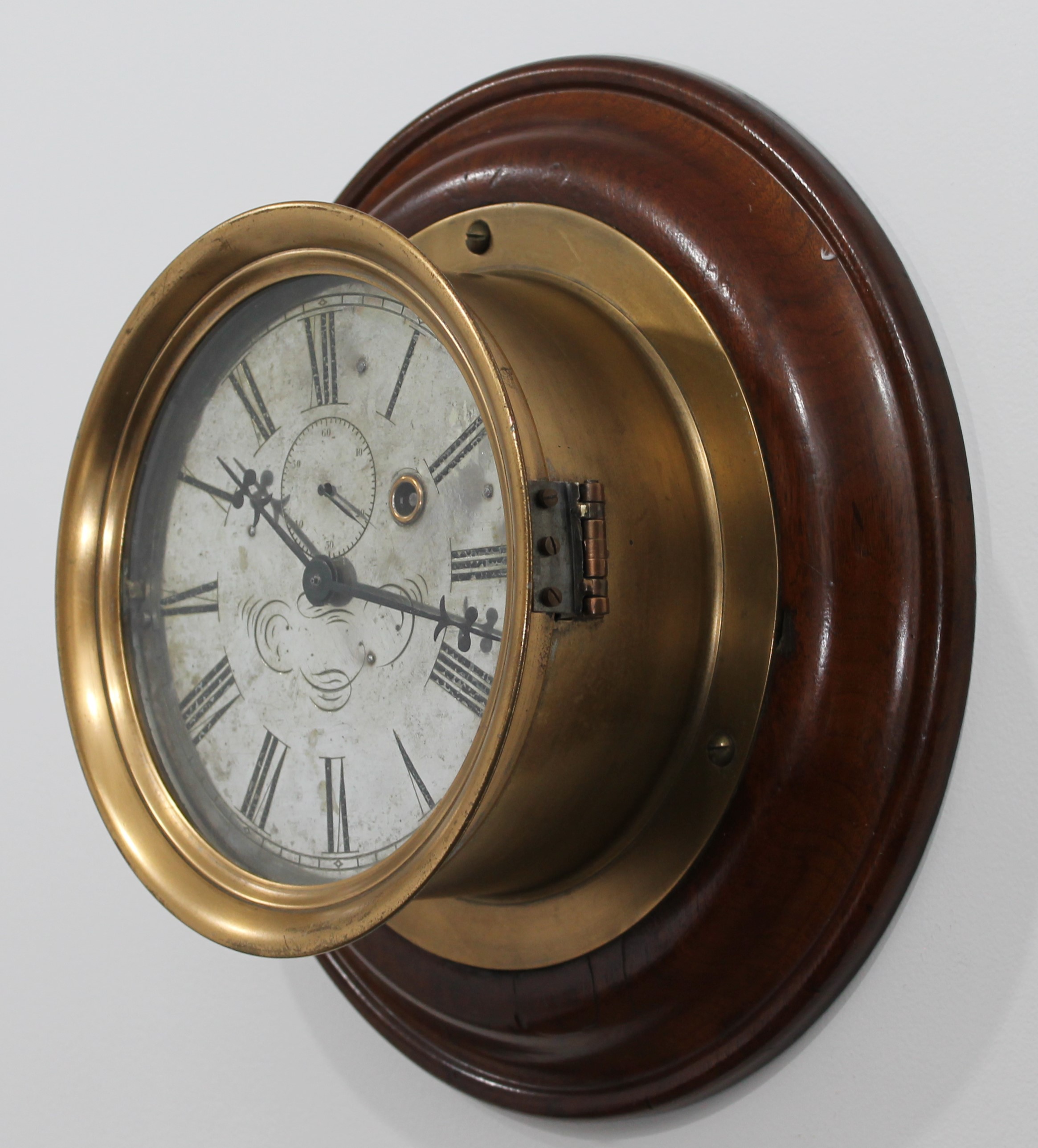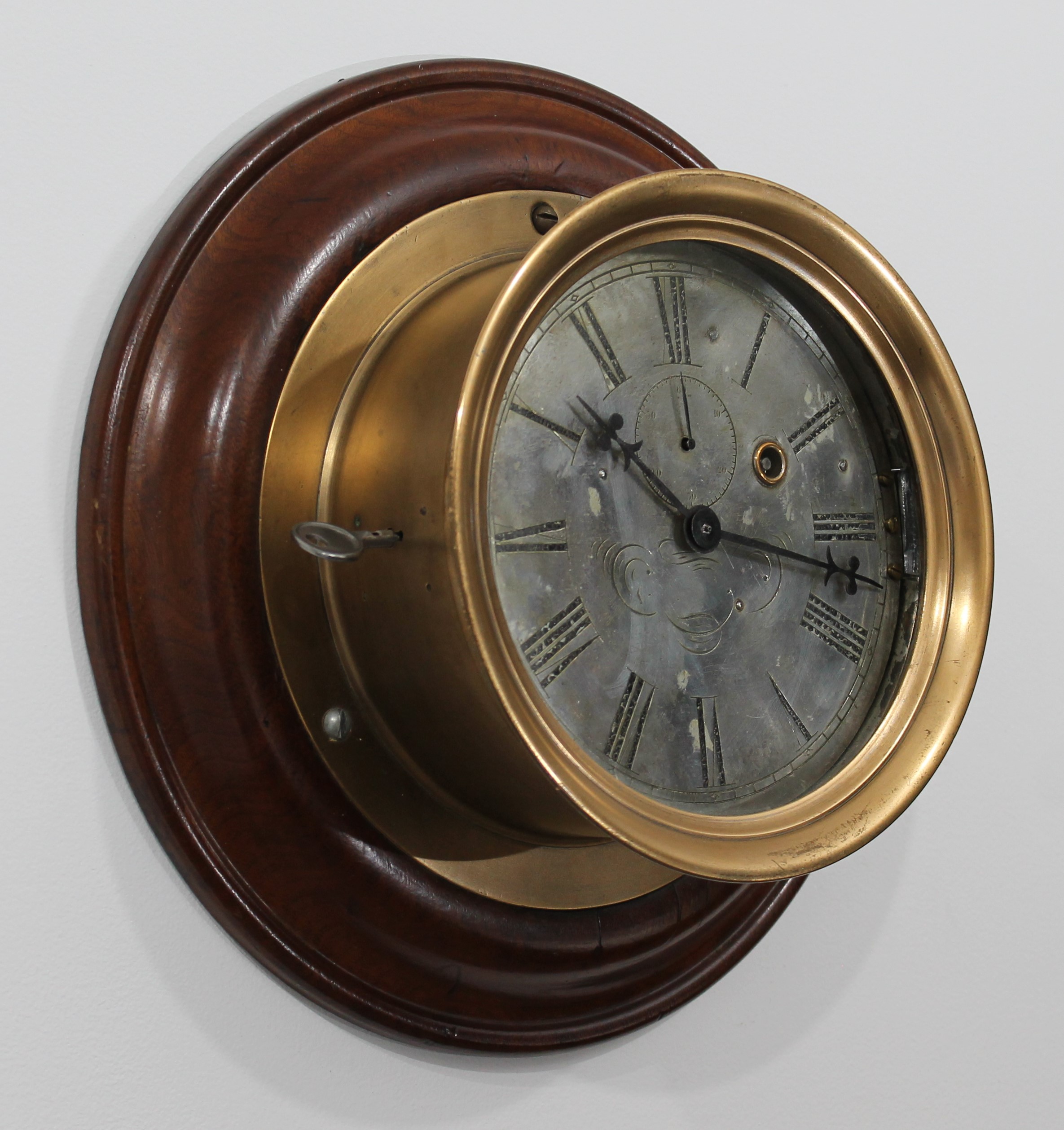 E. Howard & Co. “No. 69 Marine and Locomotive Clock”, ca. 1900. A rare marine clock in a 10-inch brass housing mounted on a 15-inch mahogany base. The 8-inch silvered (almost mirrored) dial