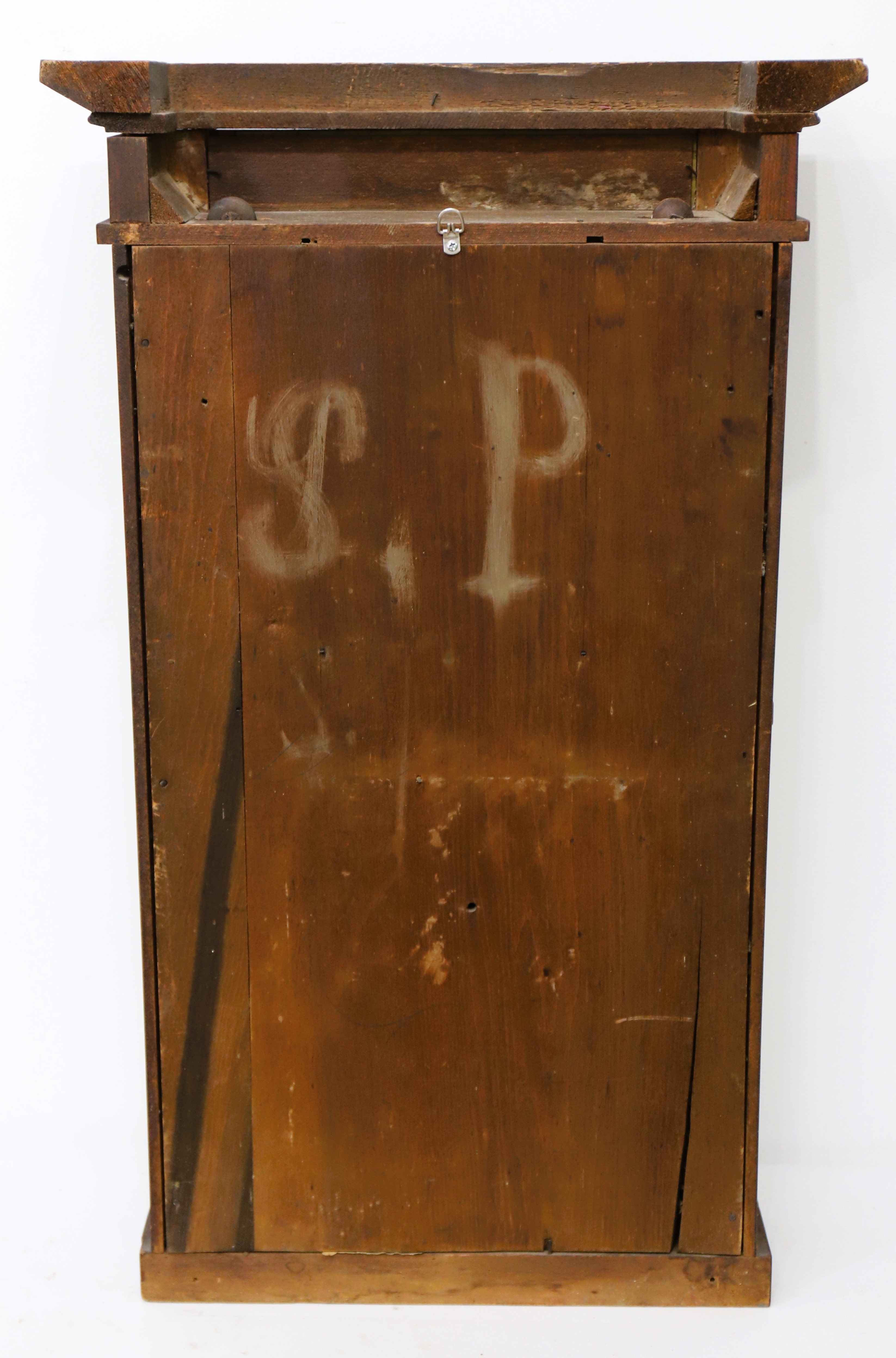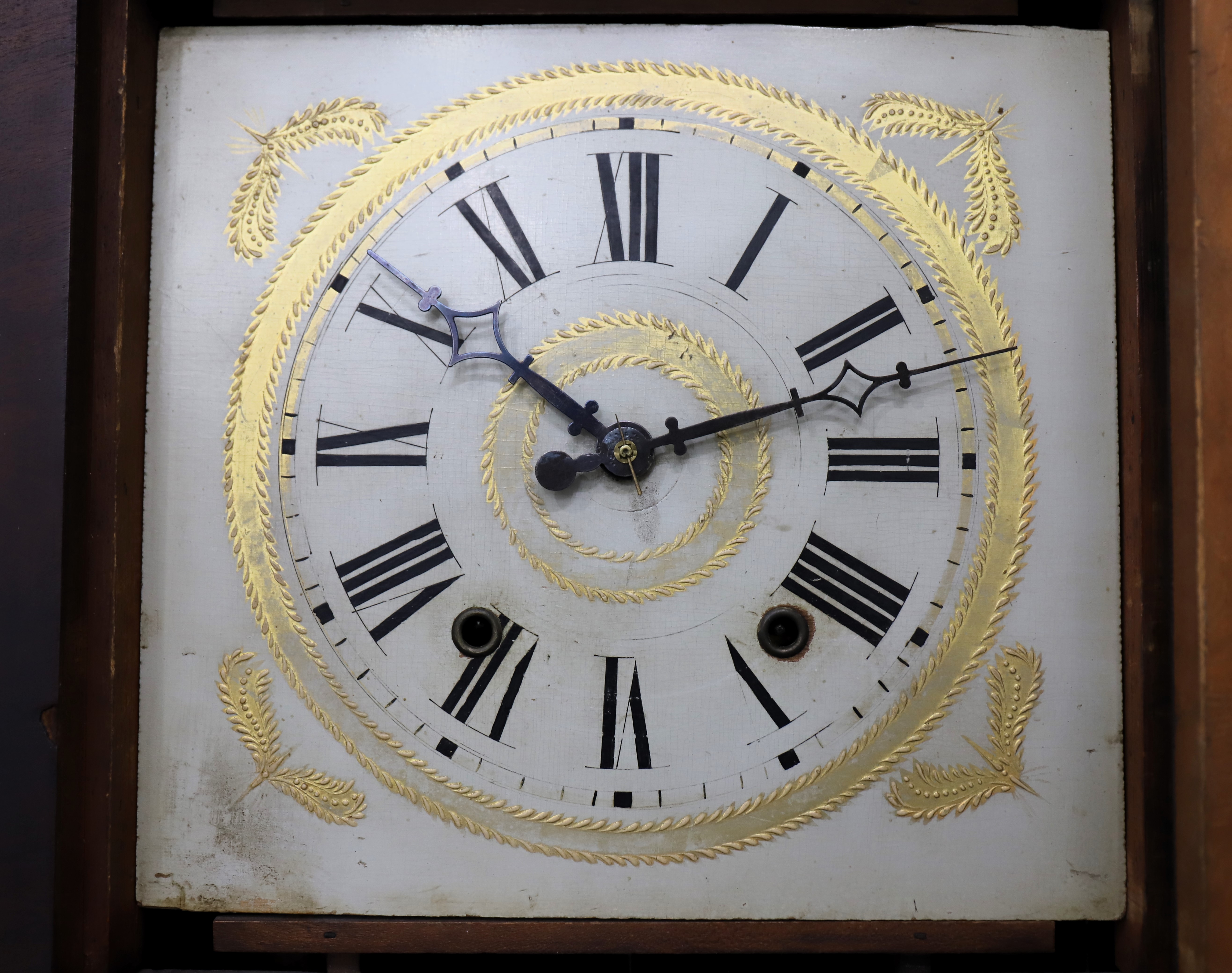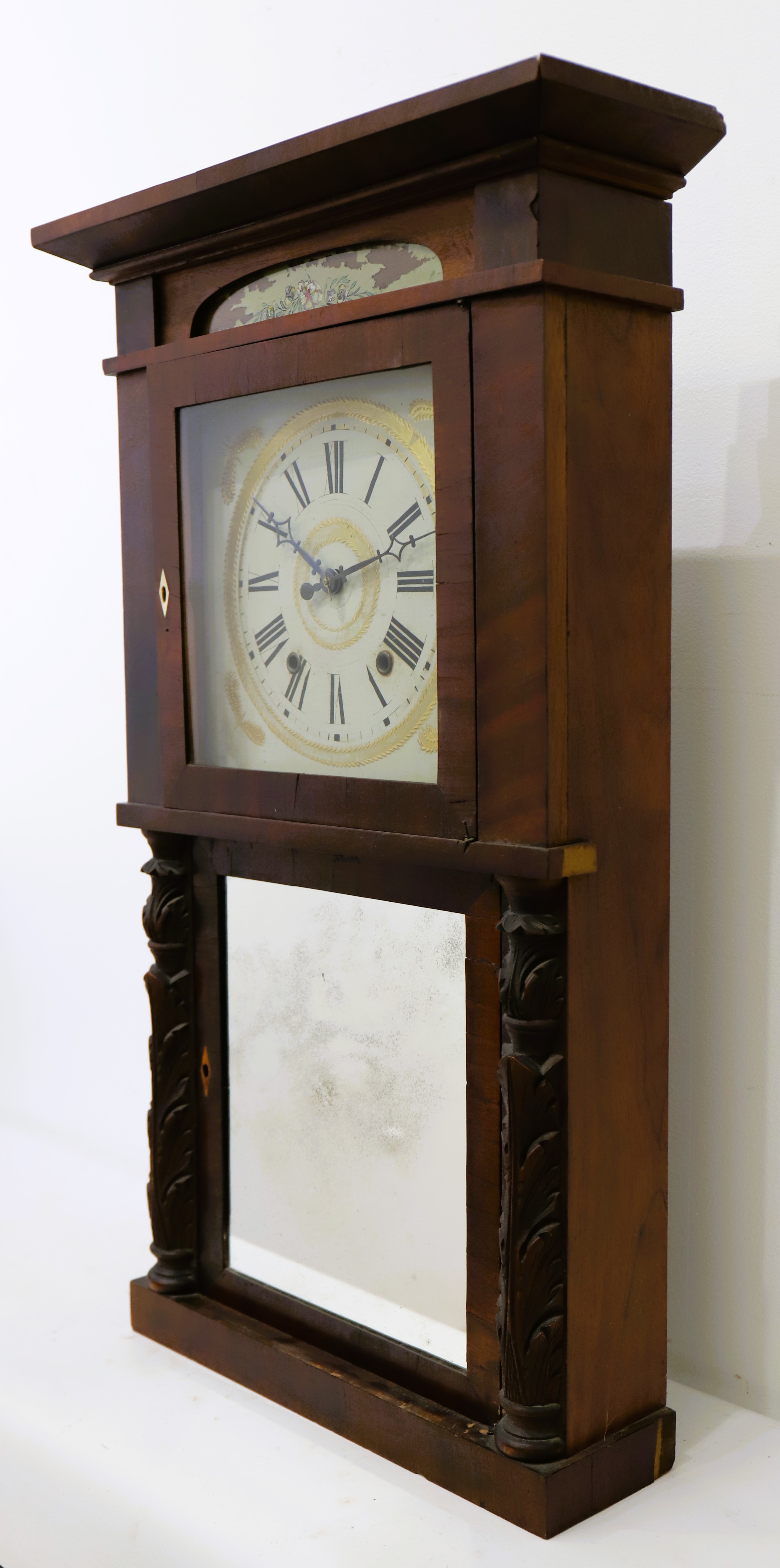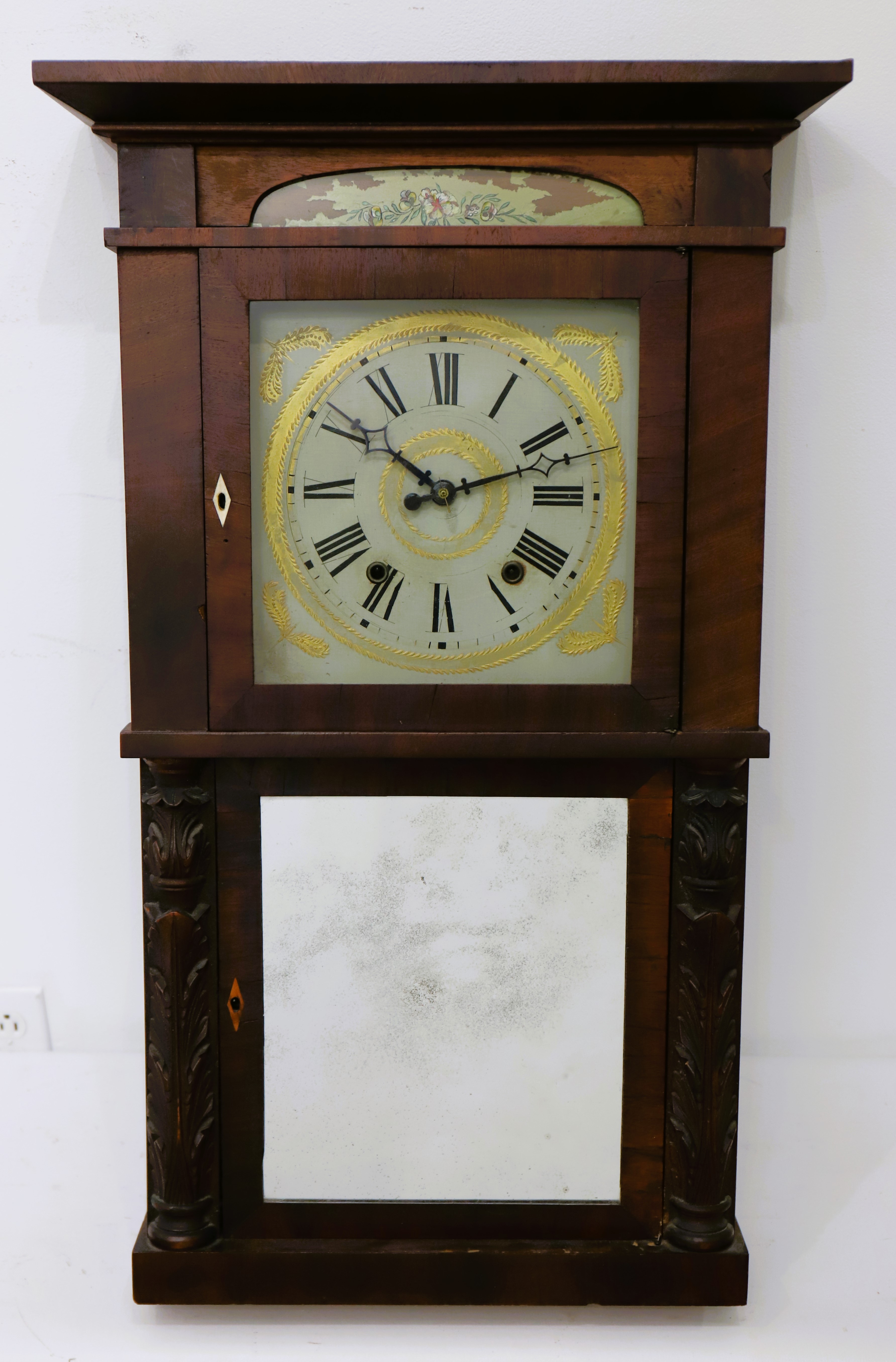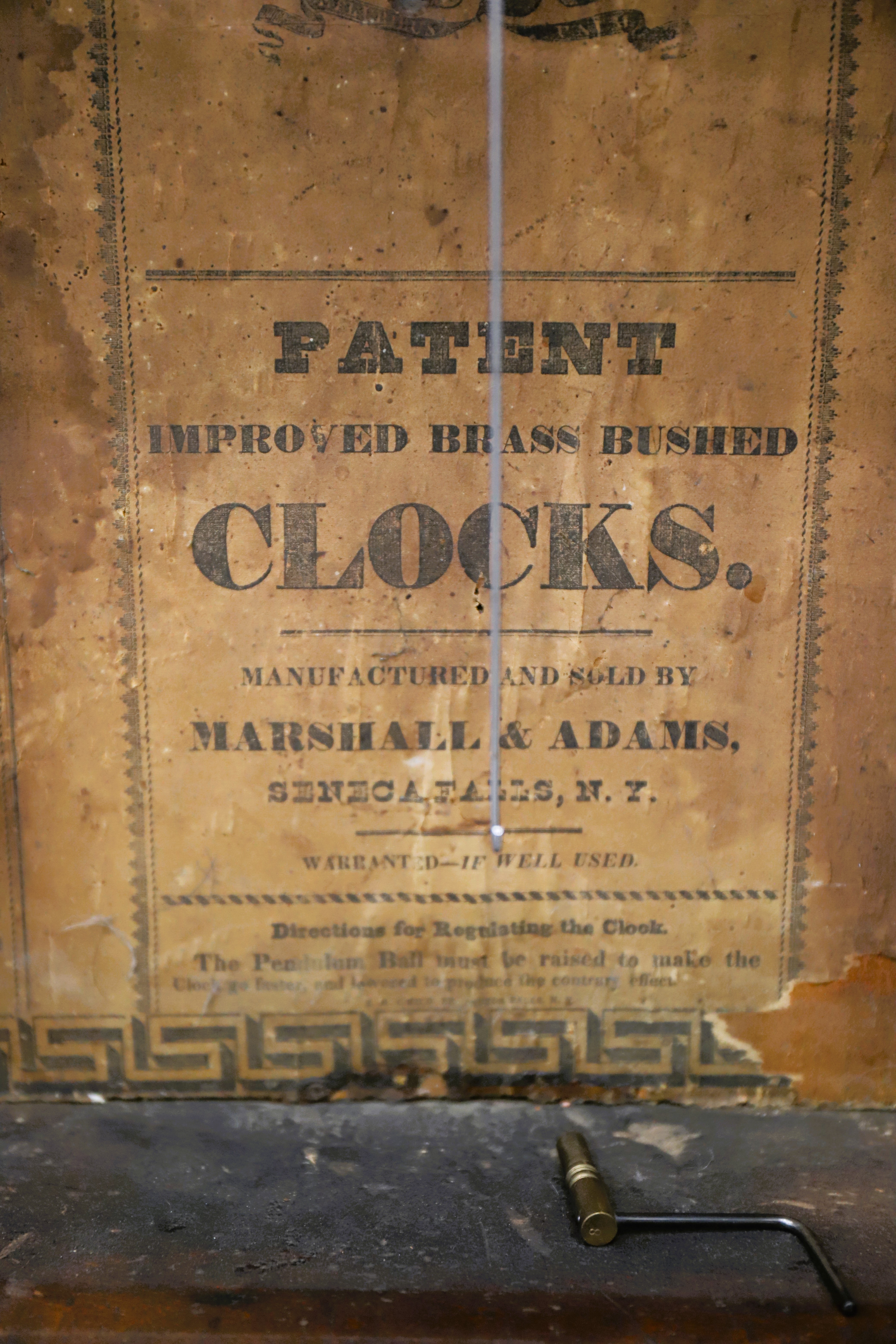 with either wooden works or brass-strap movements. This example contains a 30-hour wooden movement that is running and