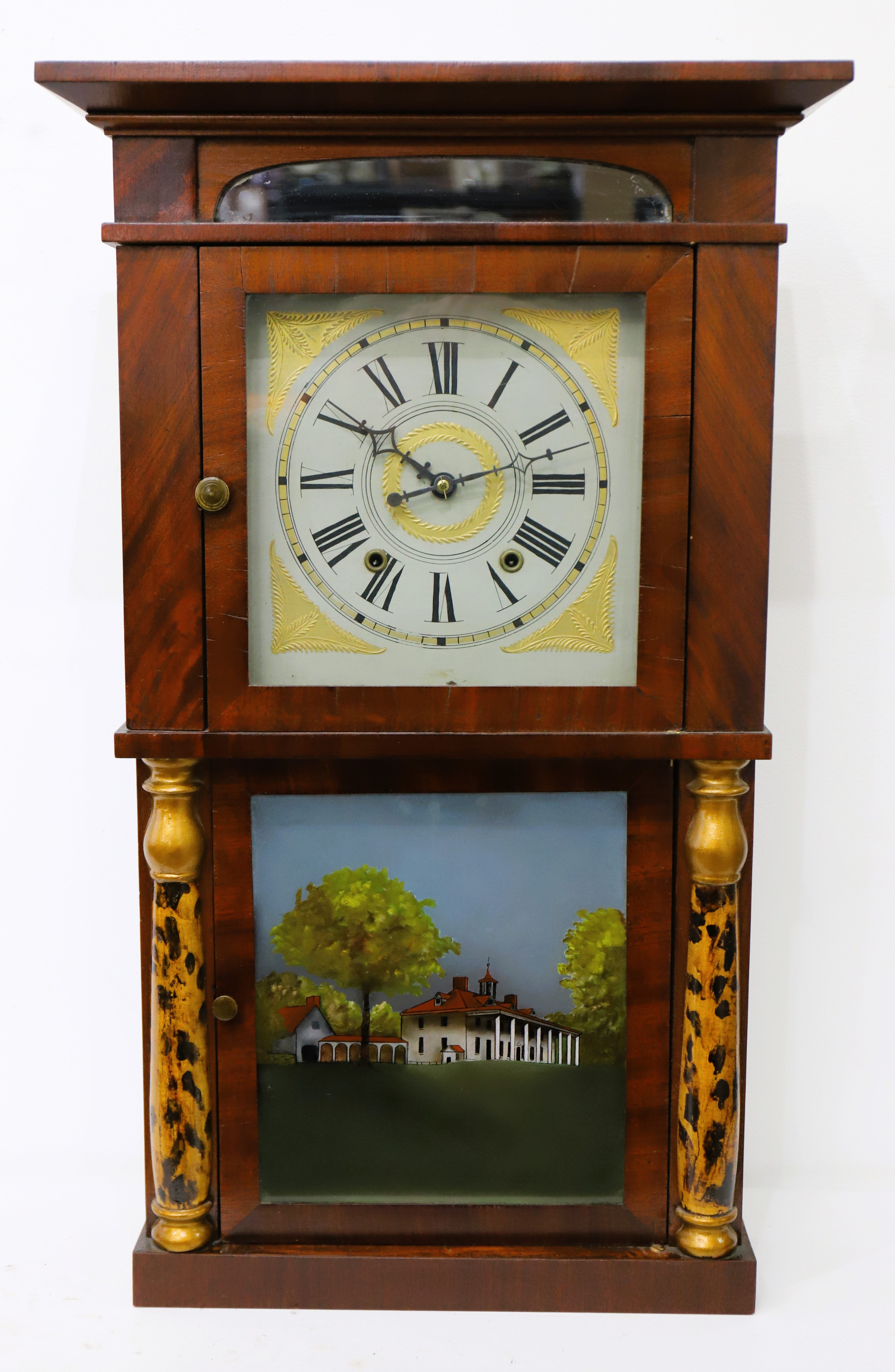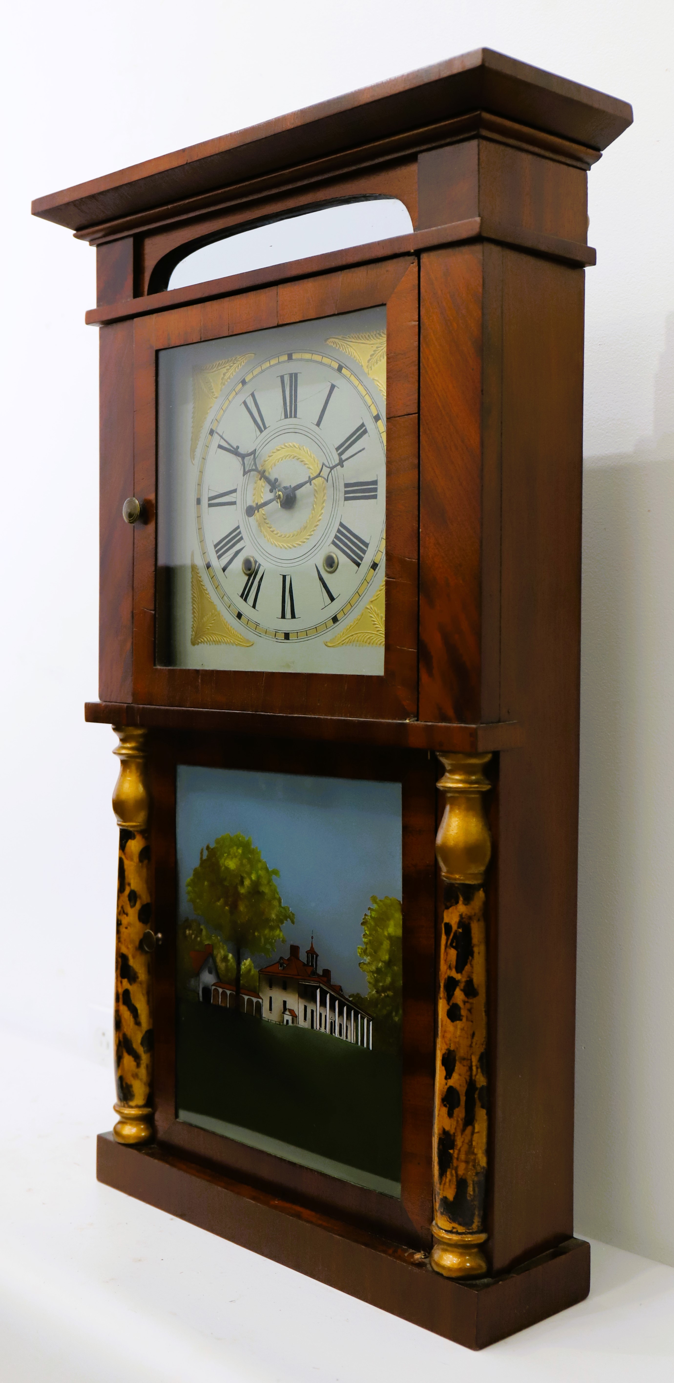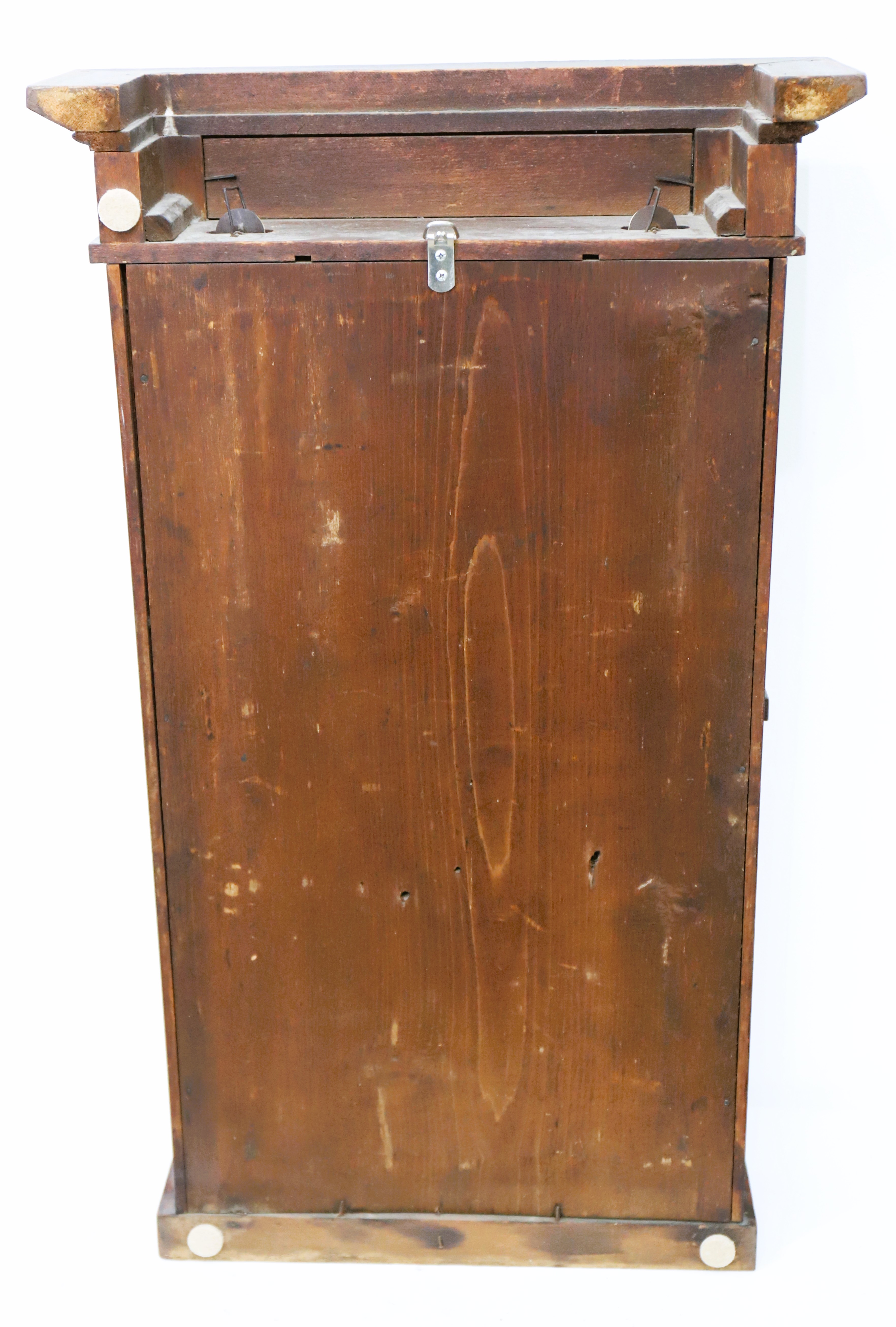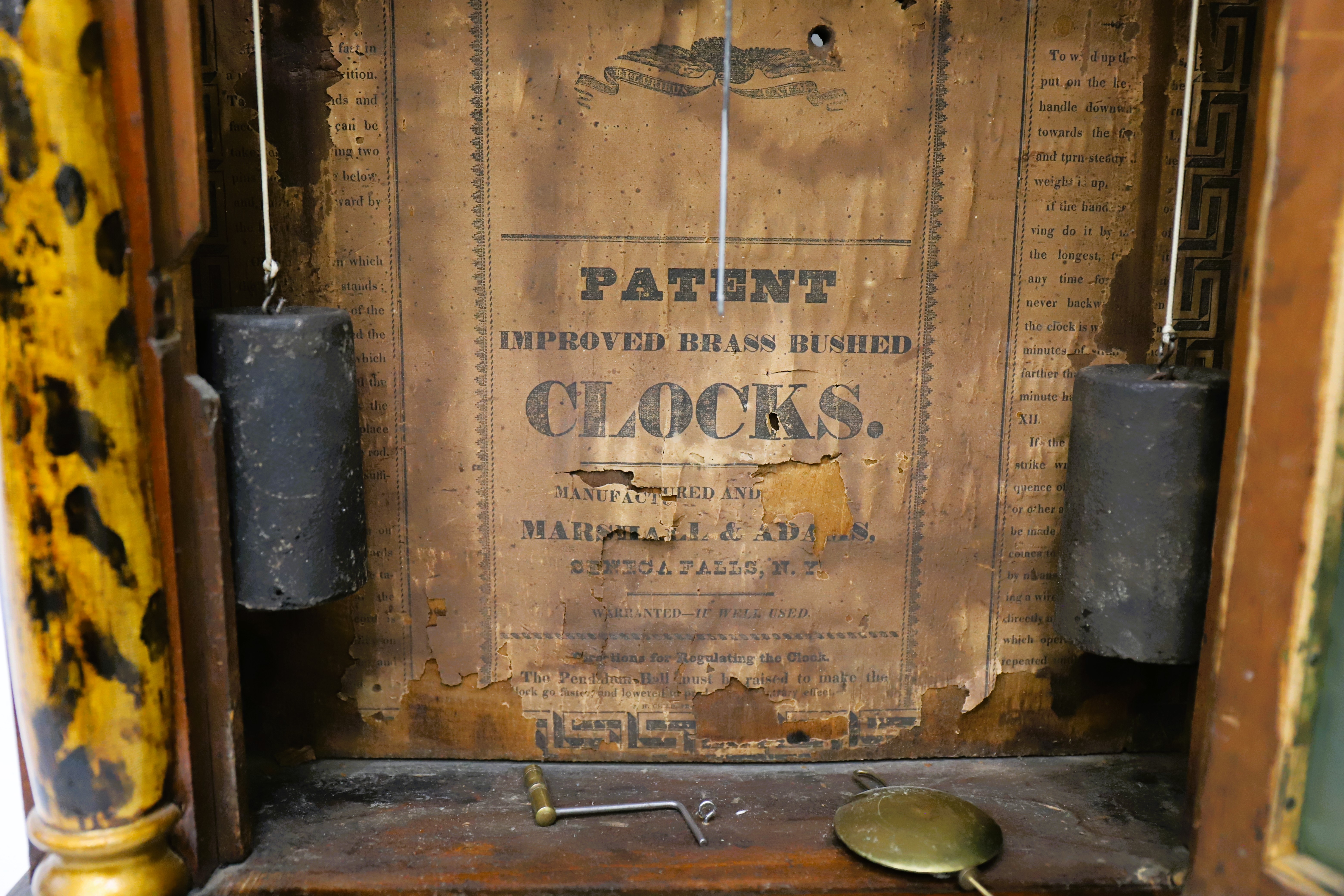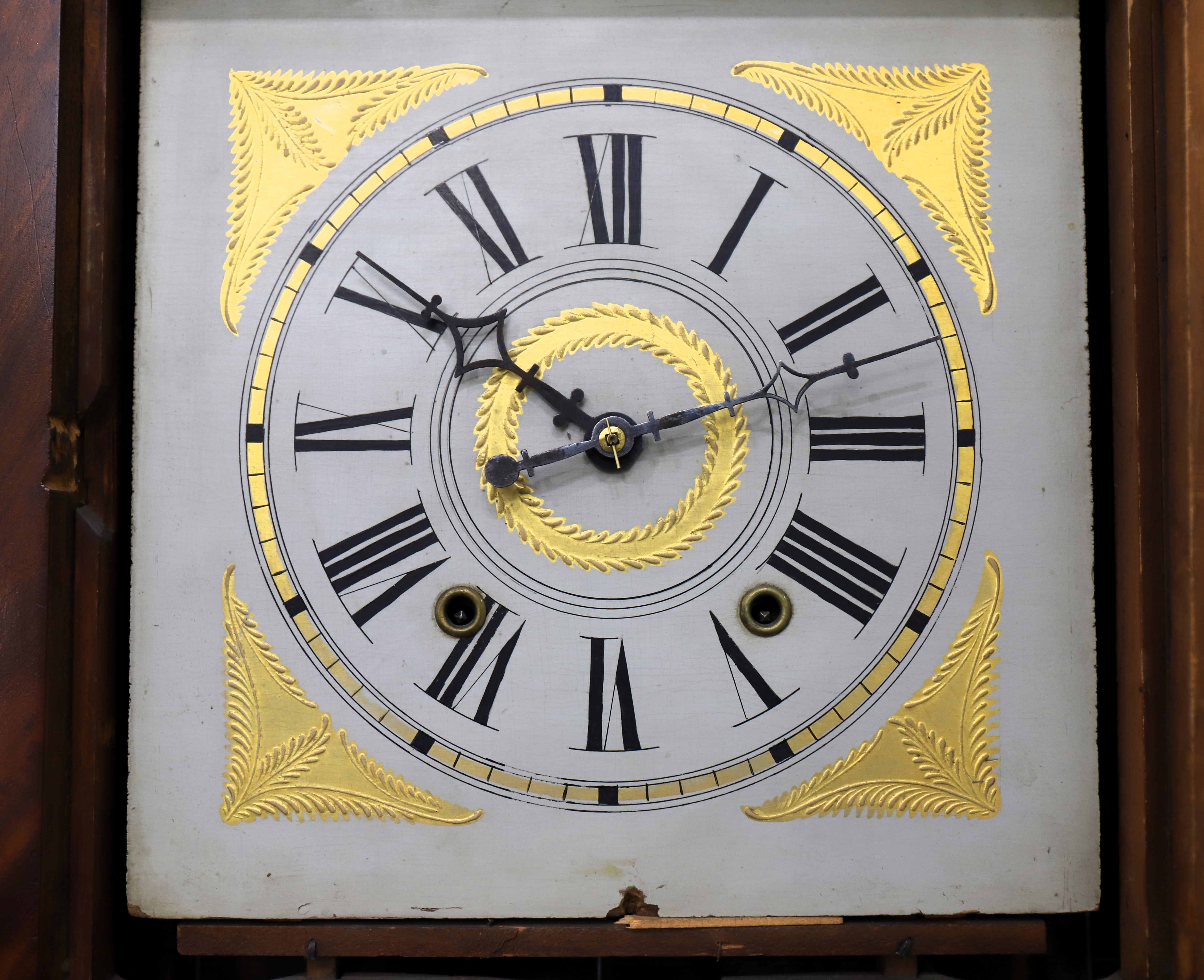 in the cornice and a repainted tablet. The dial glass looks original; the wooden dial is clean with proper hands. The
