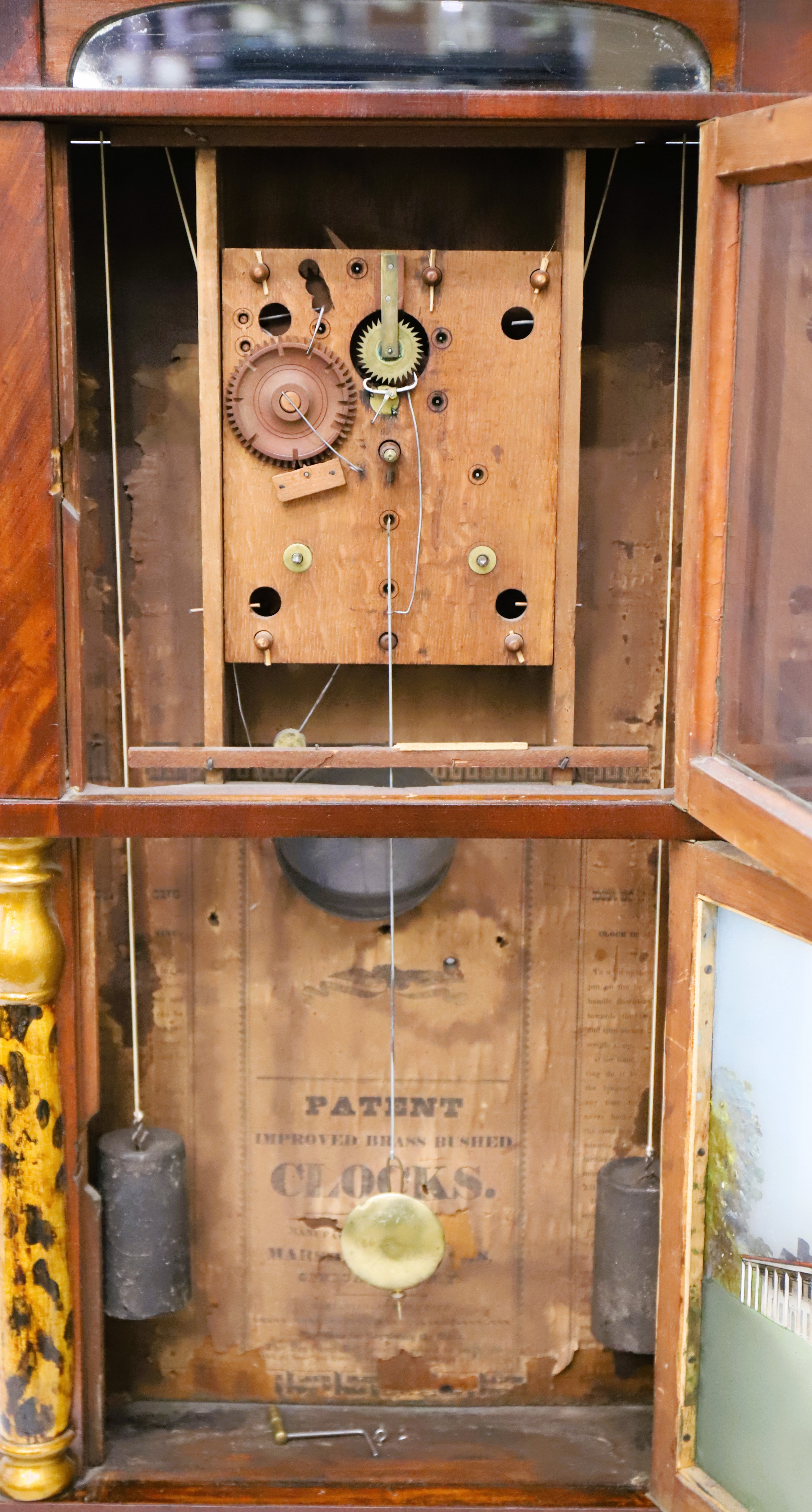 30-hour wooden movement has brass bushings throughout, as specified in the label. It is running and striking. The label