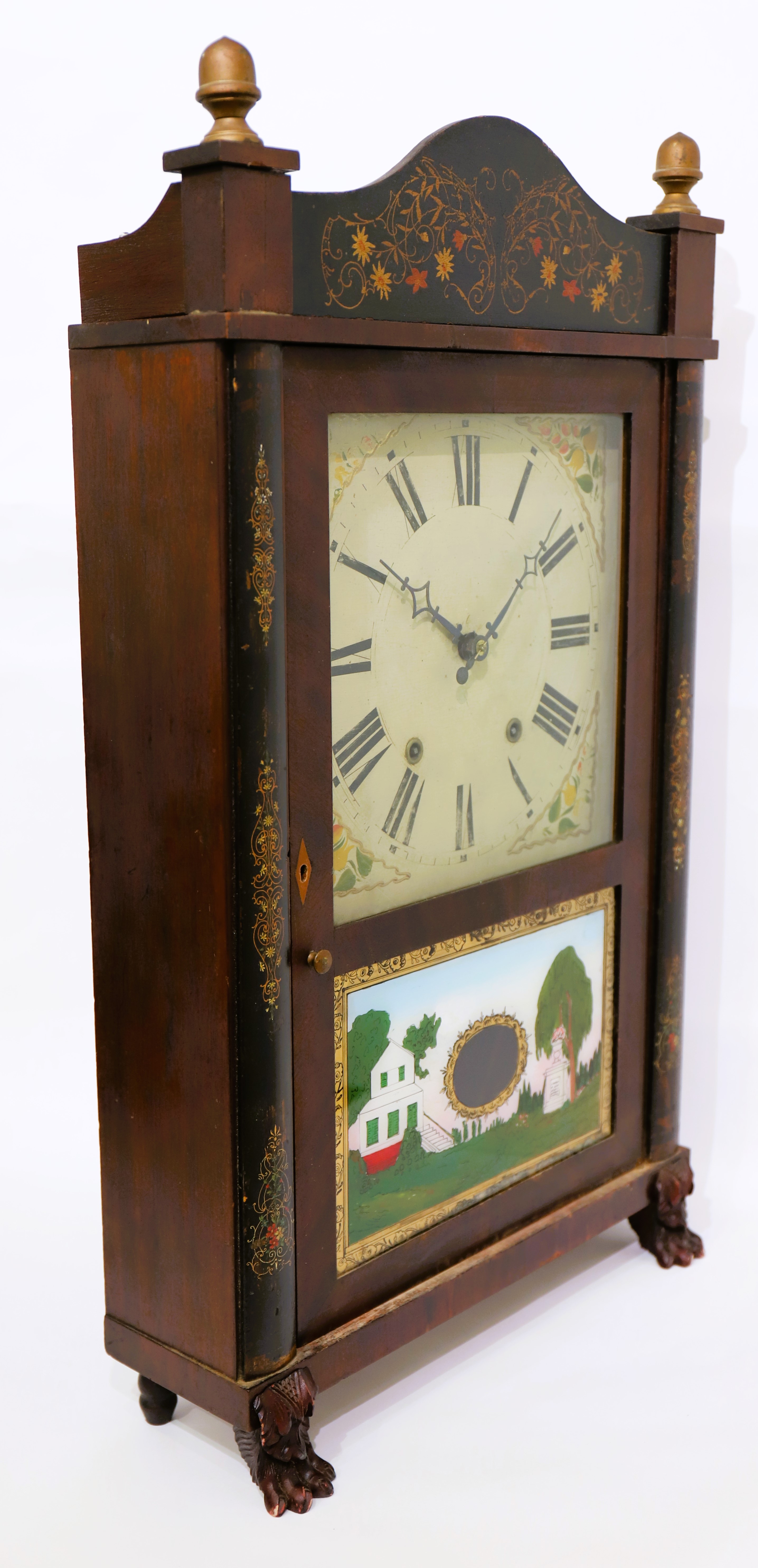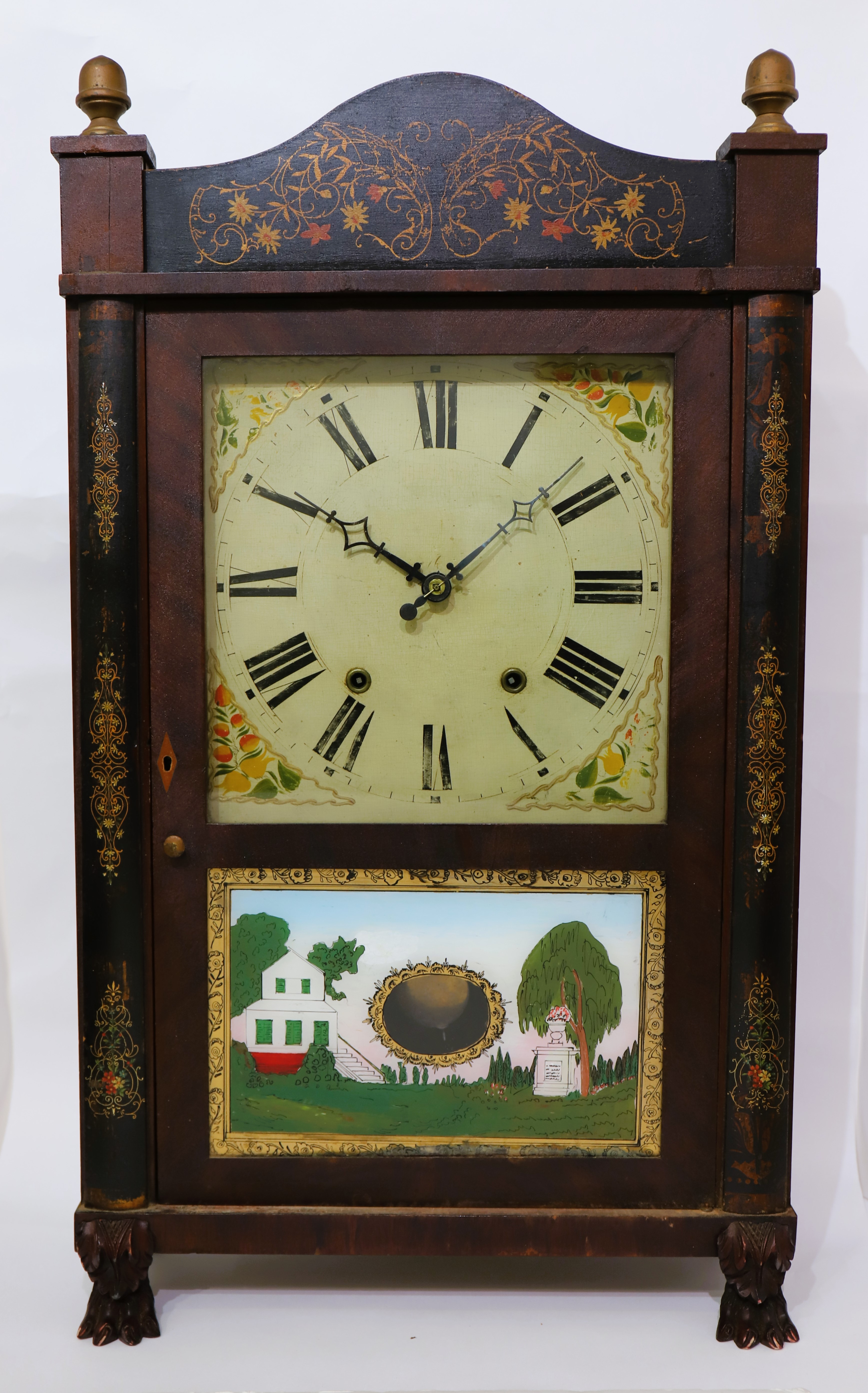 replacement and the lower glass is modern, with a good reverse-painted tablet. The wooden dial is clean with colorful spandrels,