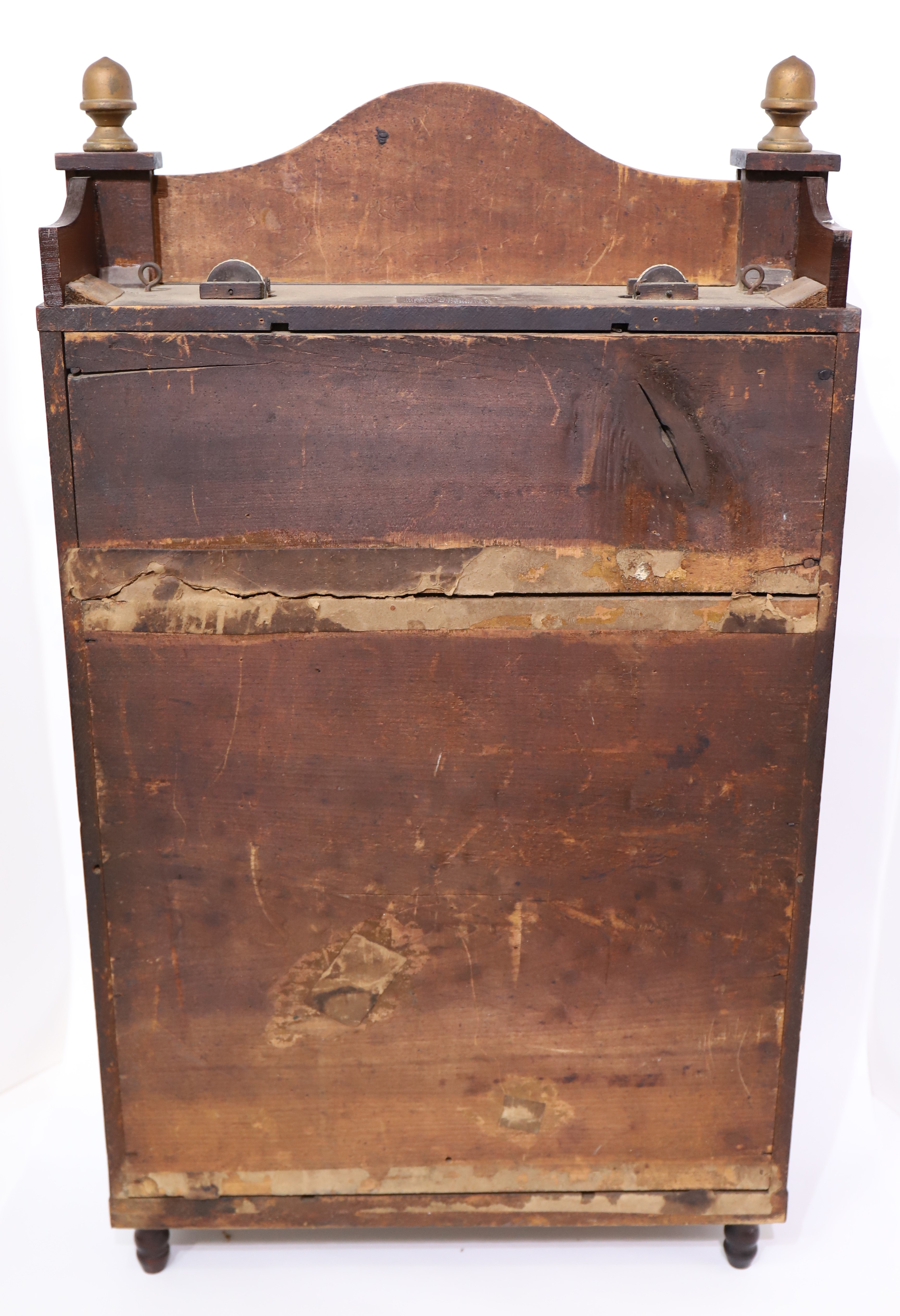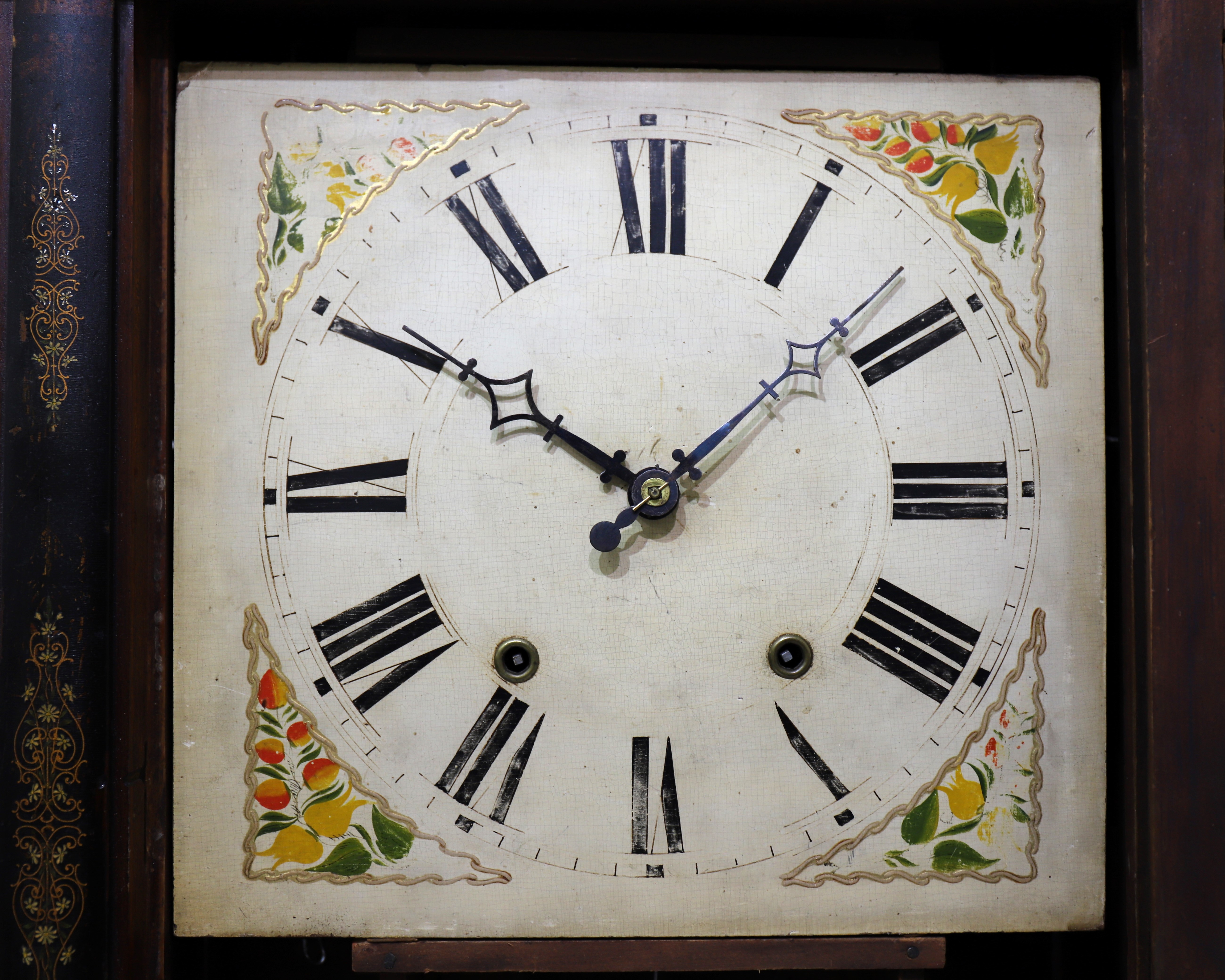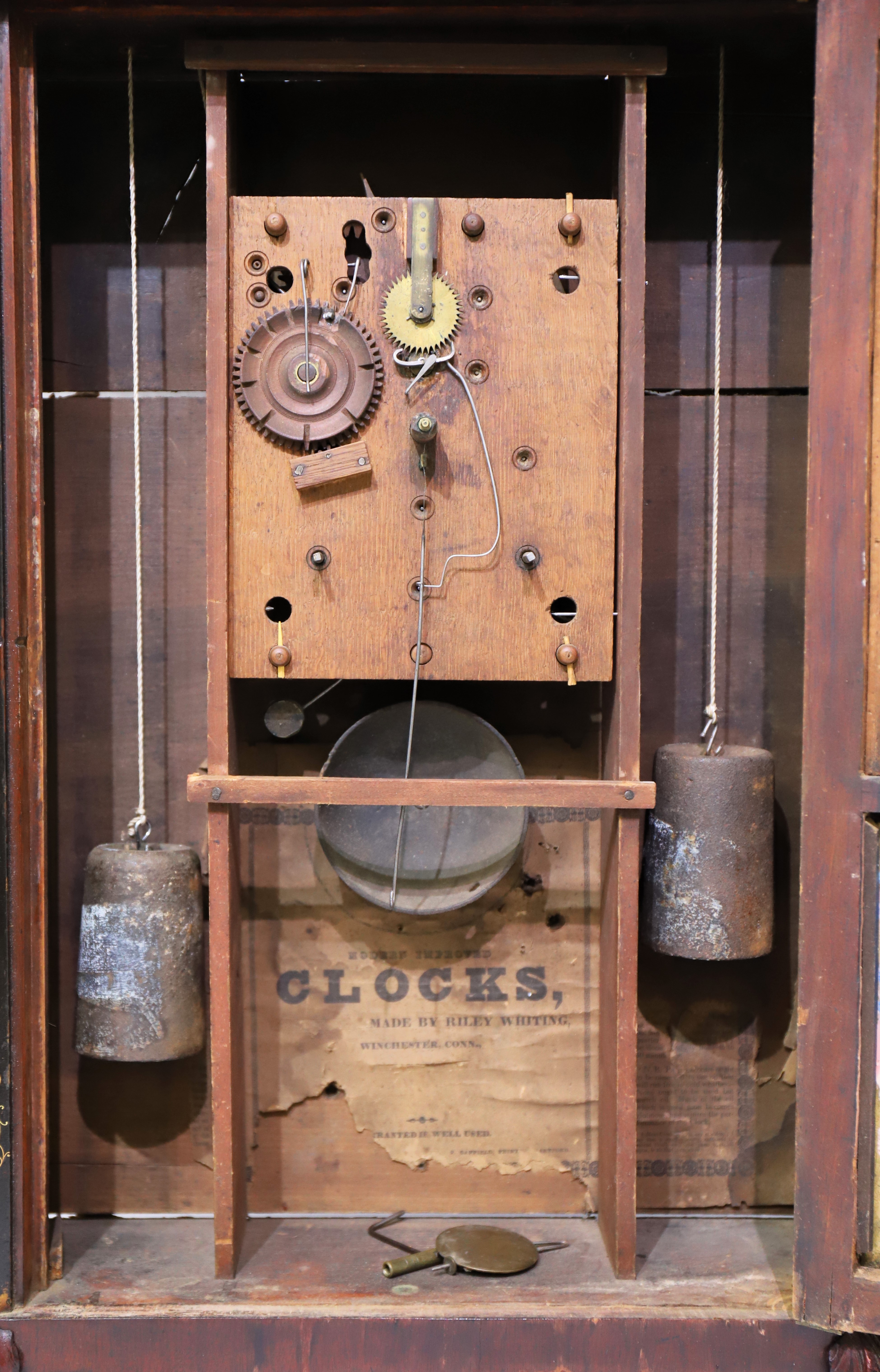 the hands are period. The 30-hour wooden movement will not run but will strike with some reluctance. There are proper