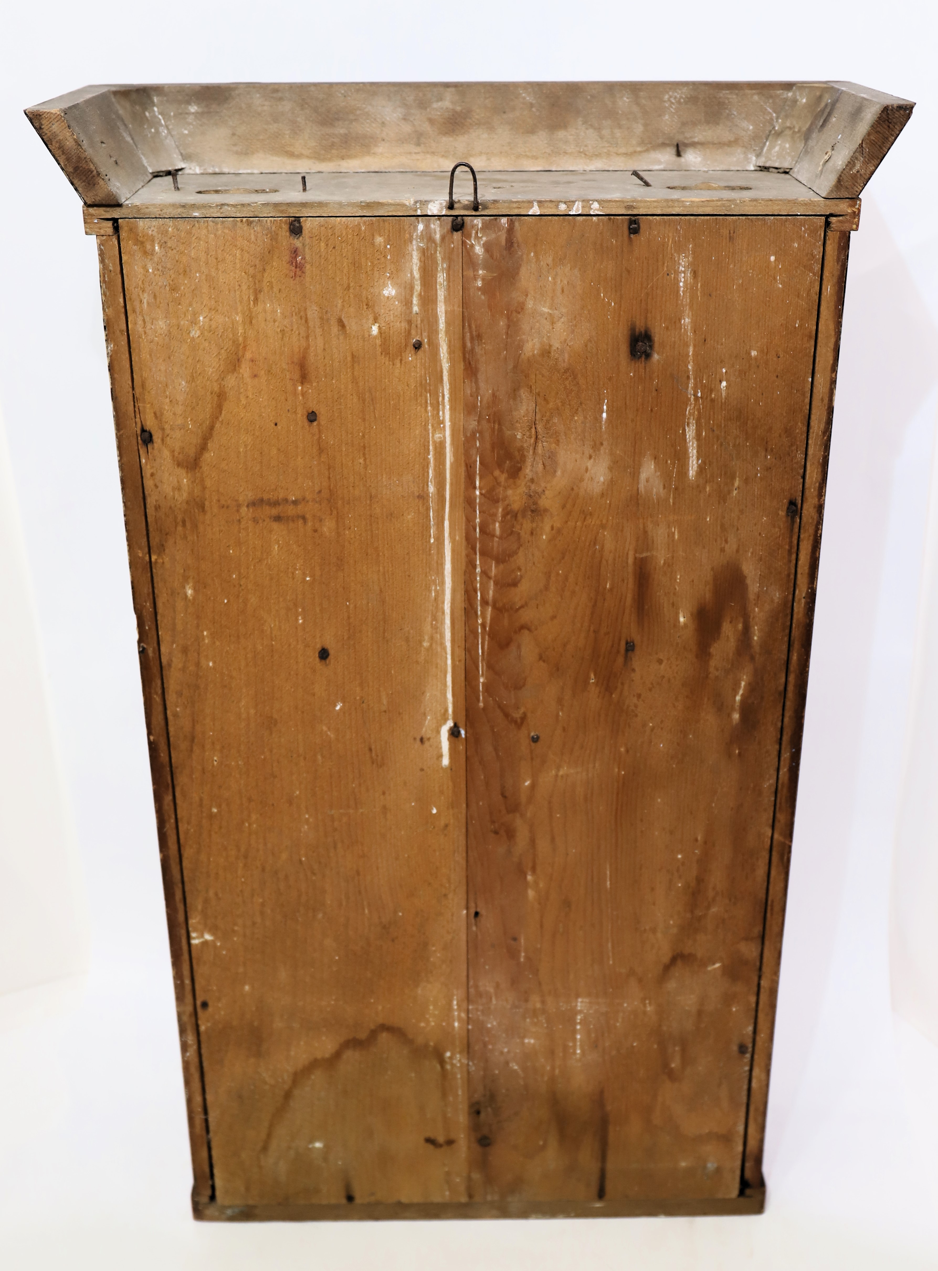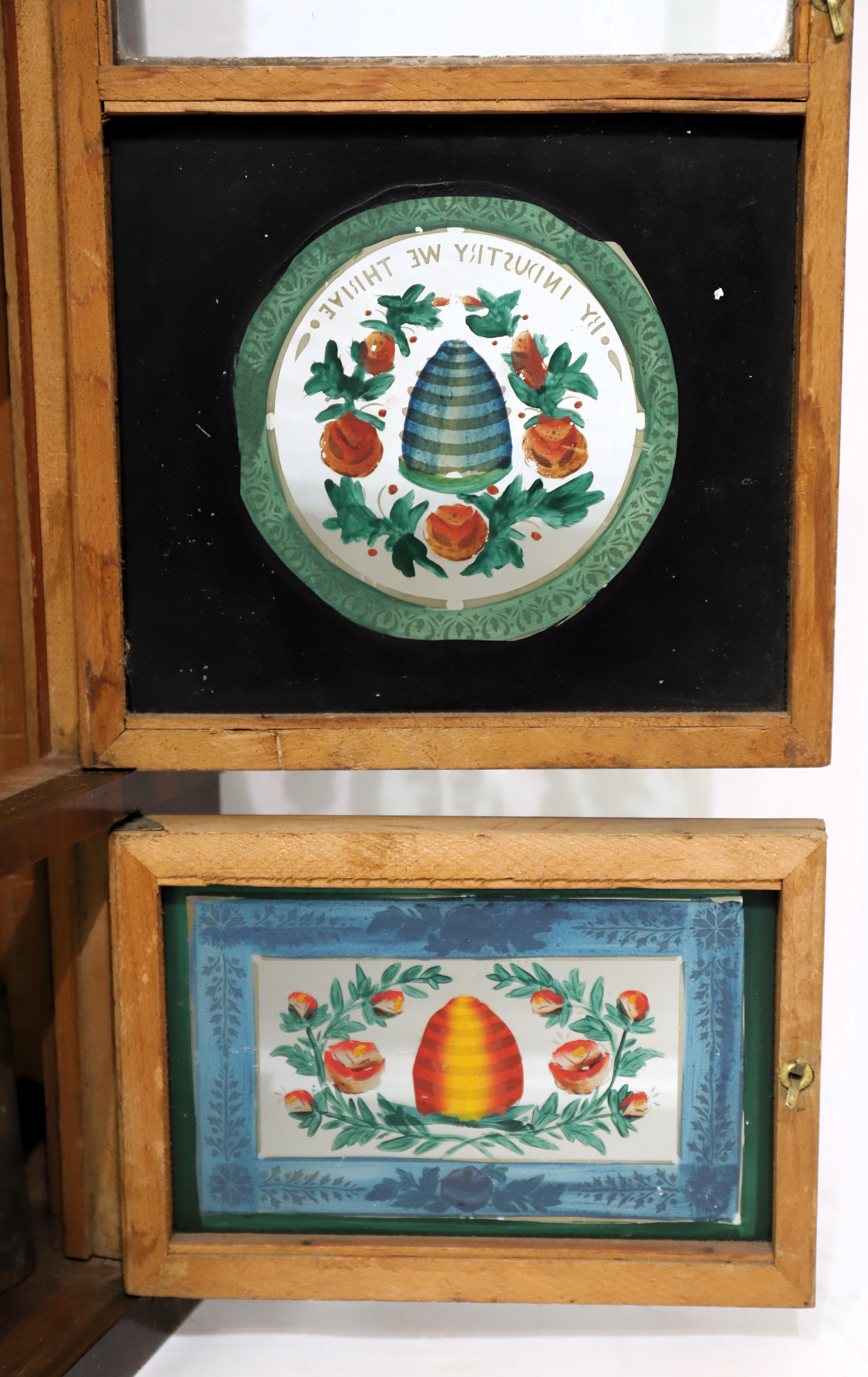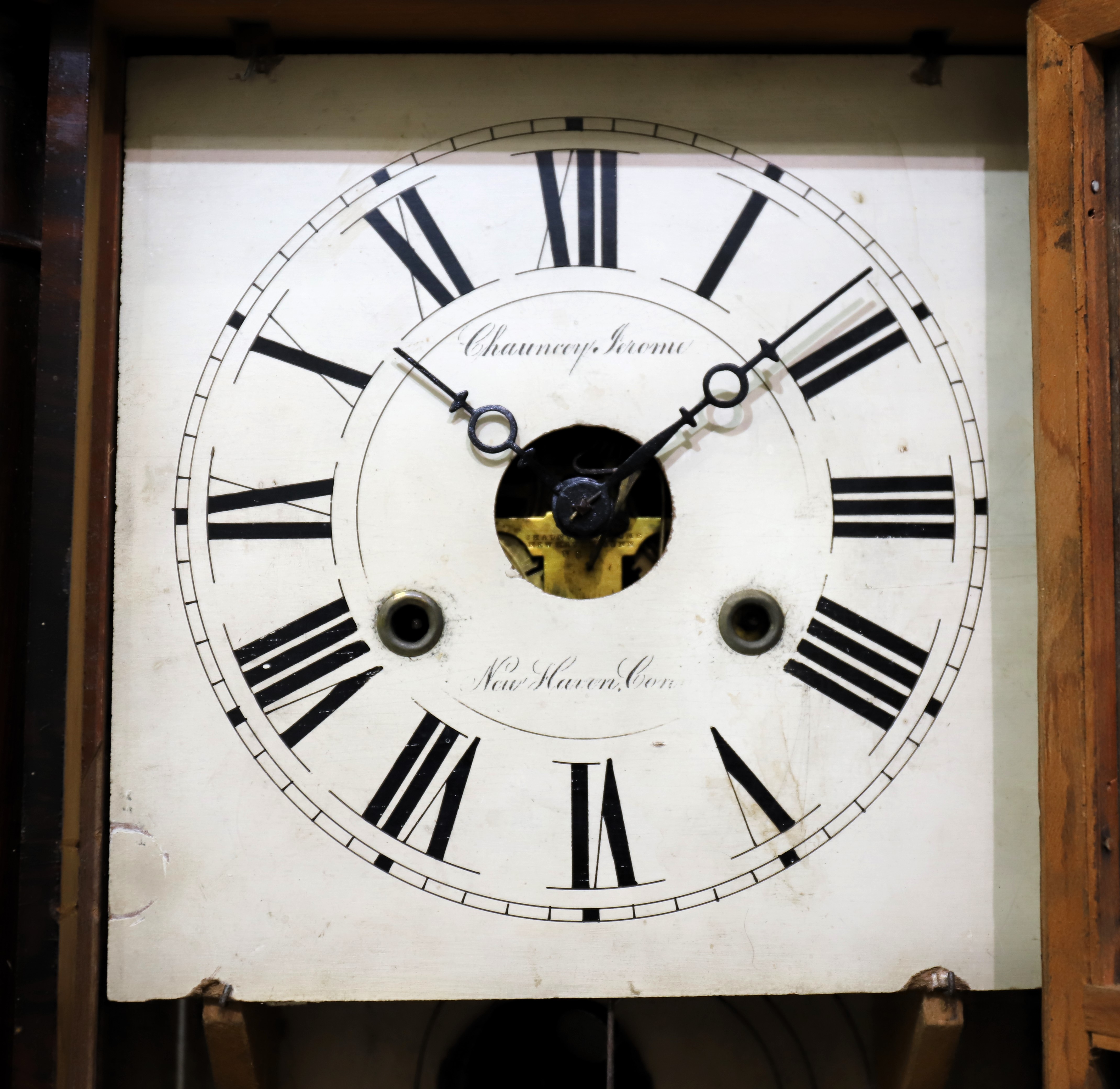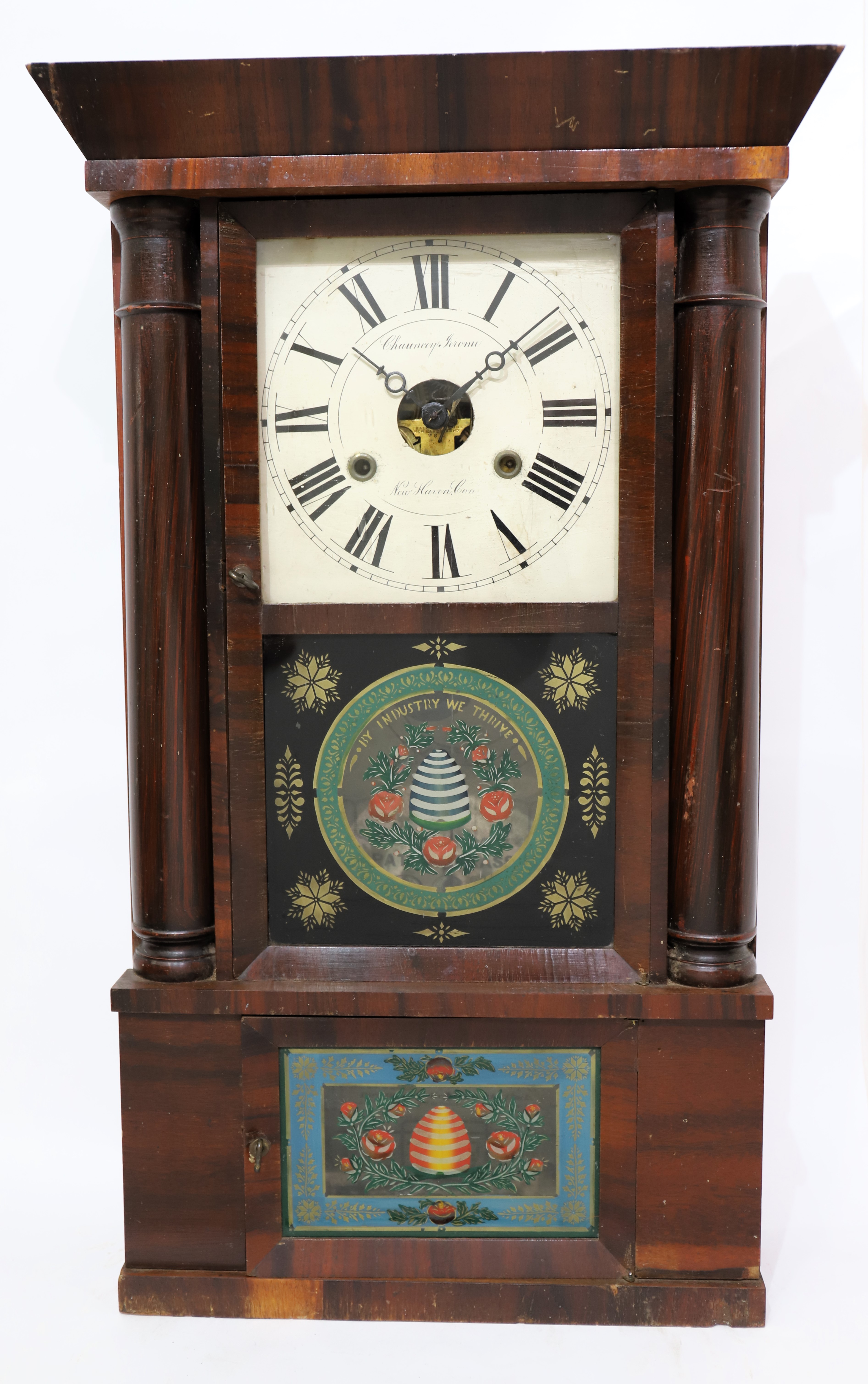 are grain-painted. The glasses are period and may be original; the tablets are outstanding – “By industry we thrive”. The wood dial is clean and signed, “Chauncey Jerome, New Haven Conn”; the hands are period/original and found on similar examples. The 30-hour weight-driven movement is signed, time-and-strike on a wire gong; it runs only briefly and will need service. There