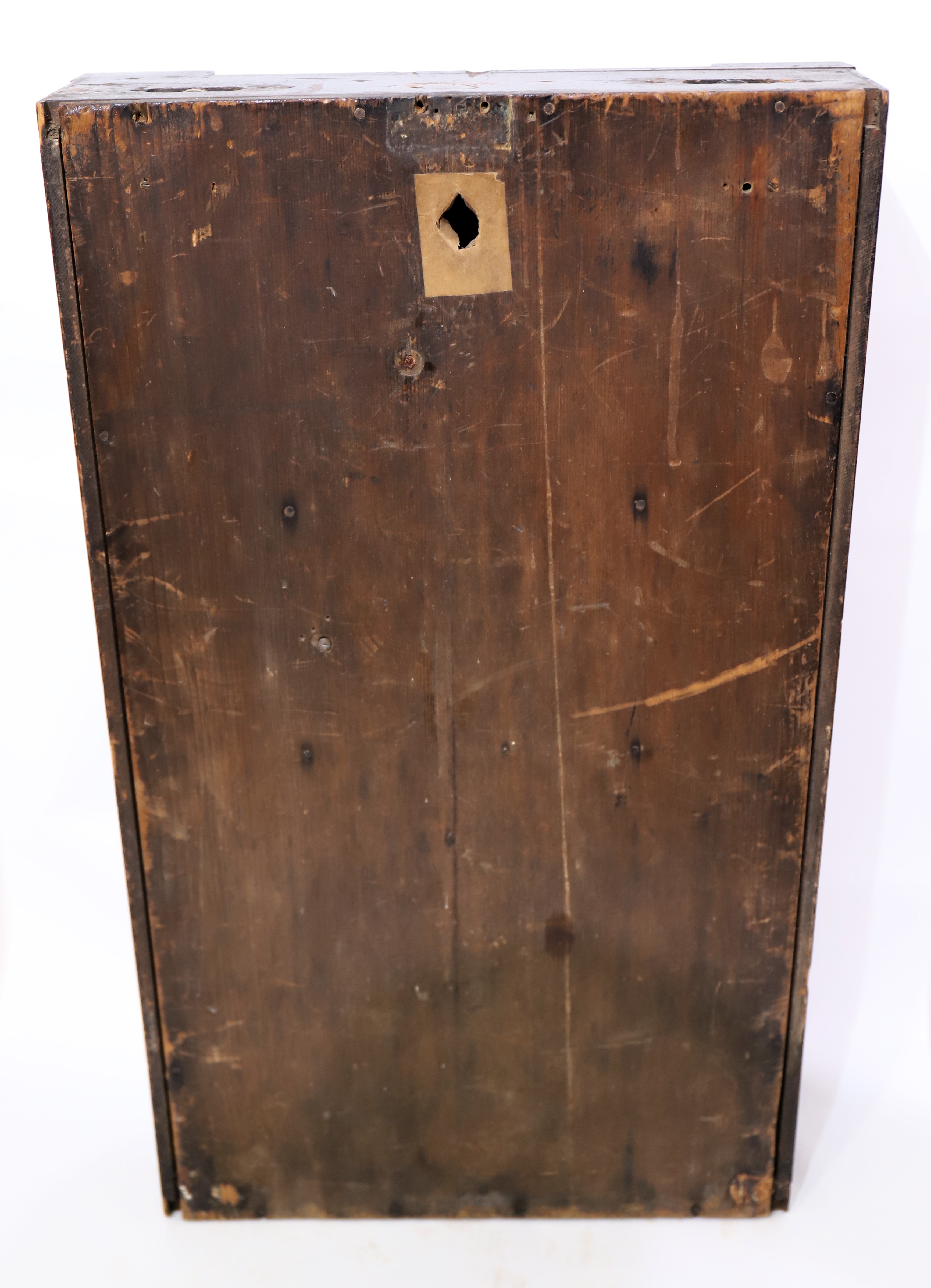 tall, while the miniatures are 21 inches tall. I can find only one other sale of this larger model, way back in 2009. The veneer is flame mahogany on the front, with turned corner decorations and flat columns. The dial glass is original, the