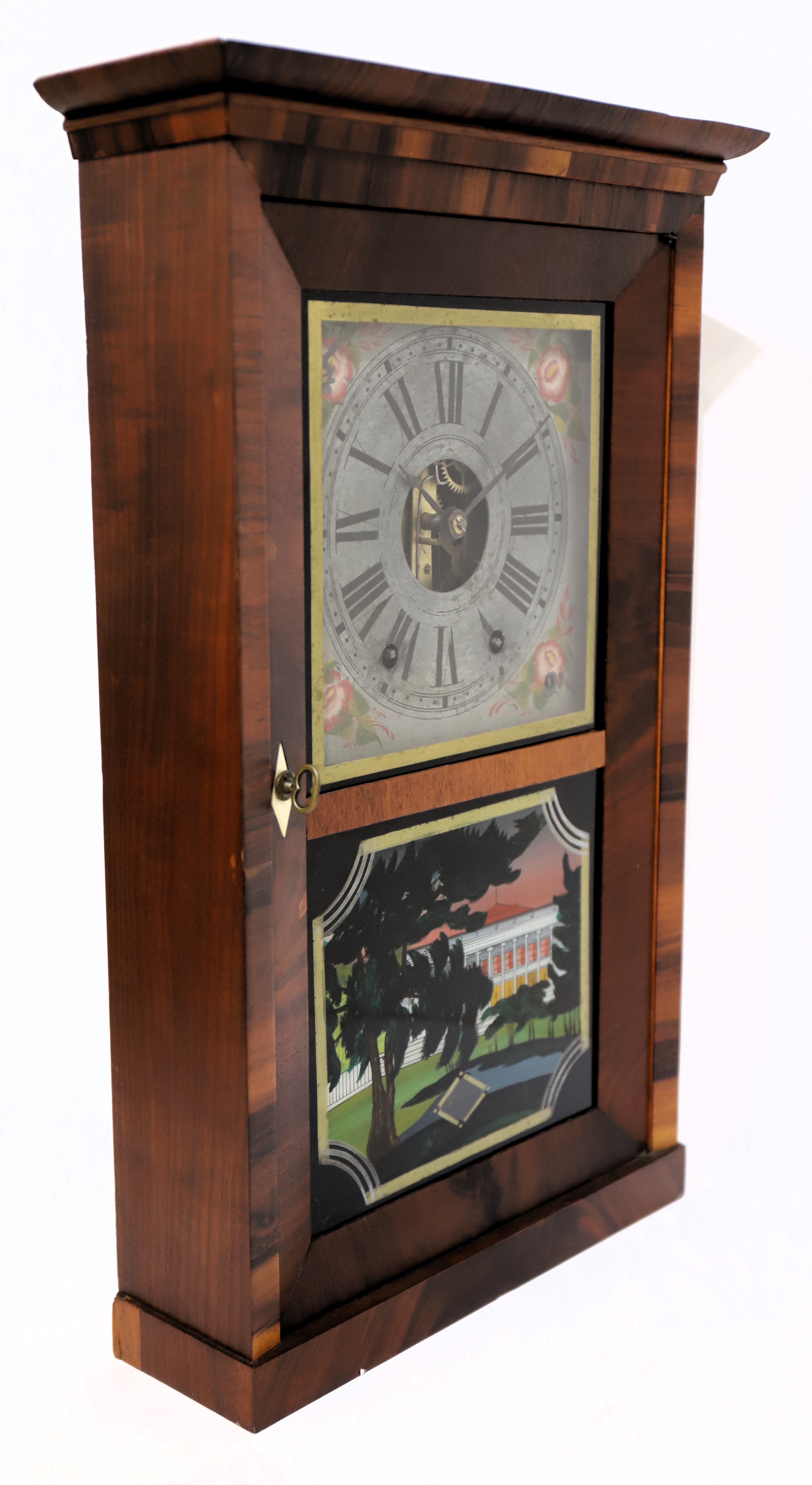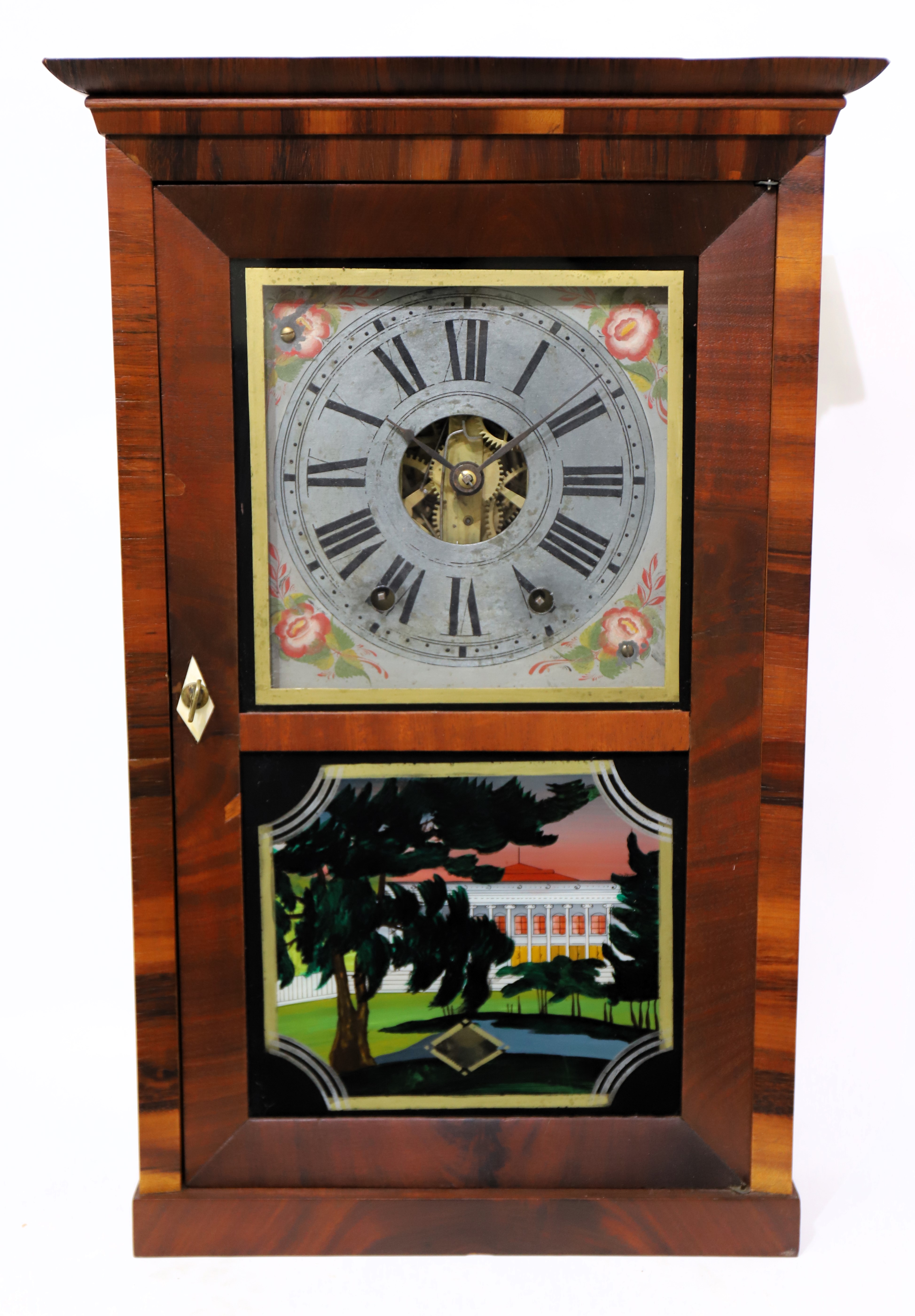 & Co. spring-driven shelf clock, 1840–1843. A 20.25-inch case with a beveled-front in rosewood veneer. Both glasses