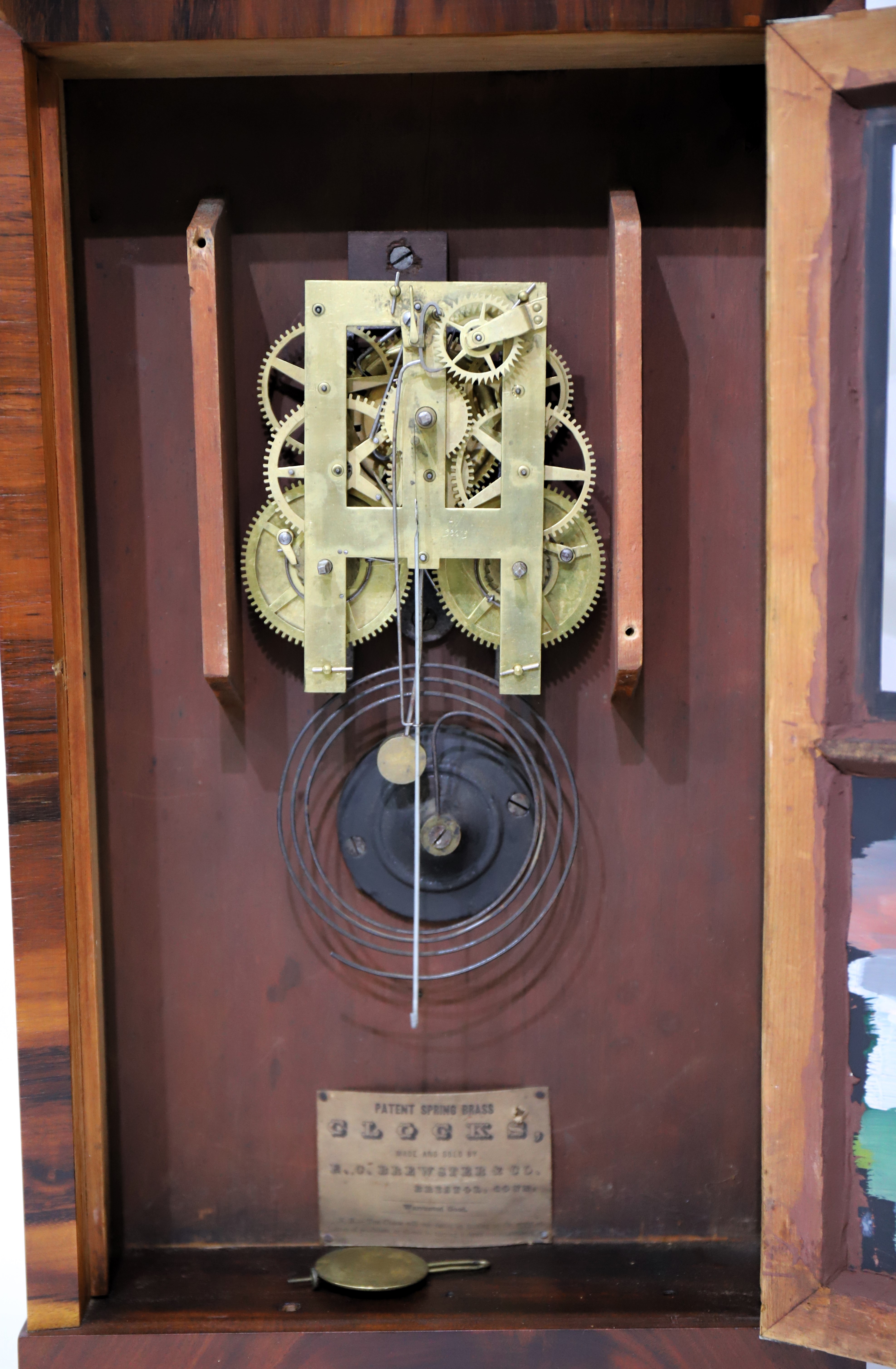 movement is spring-driven and unsigned, but clearly of Brewster/Kirk origin, with an iron backplate and enclosed springs. It