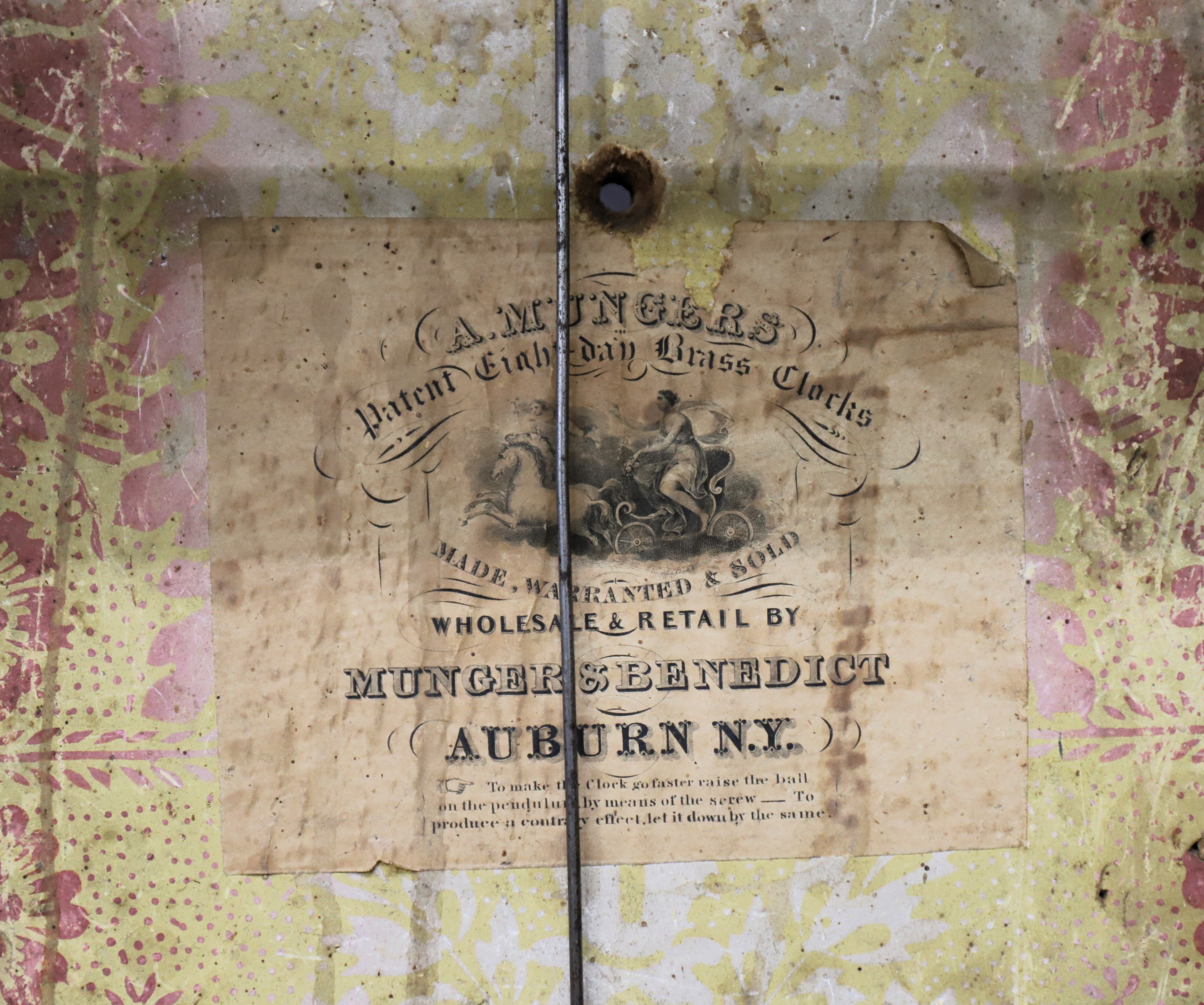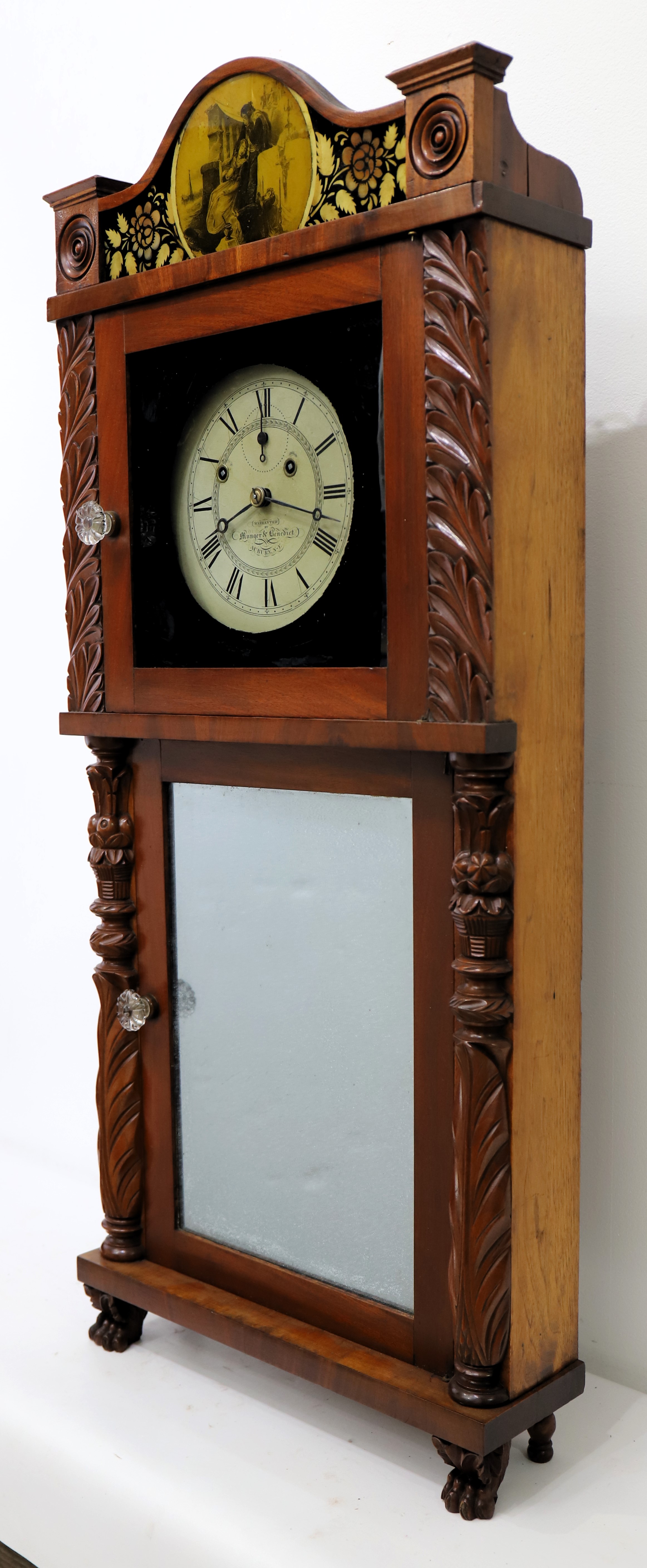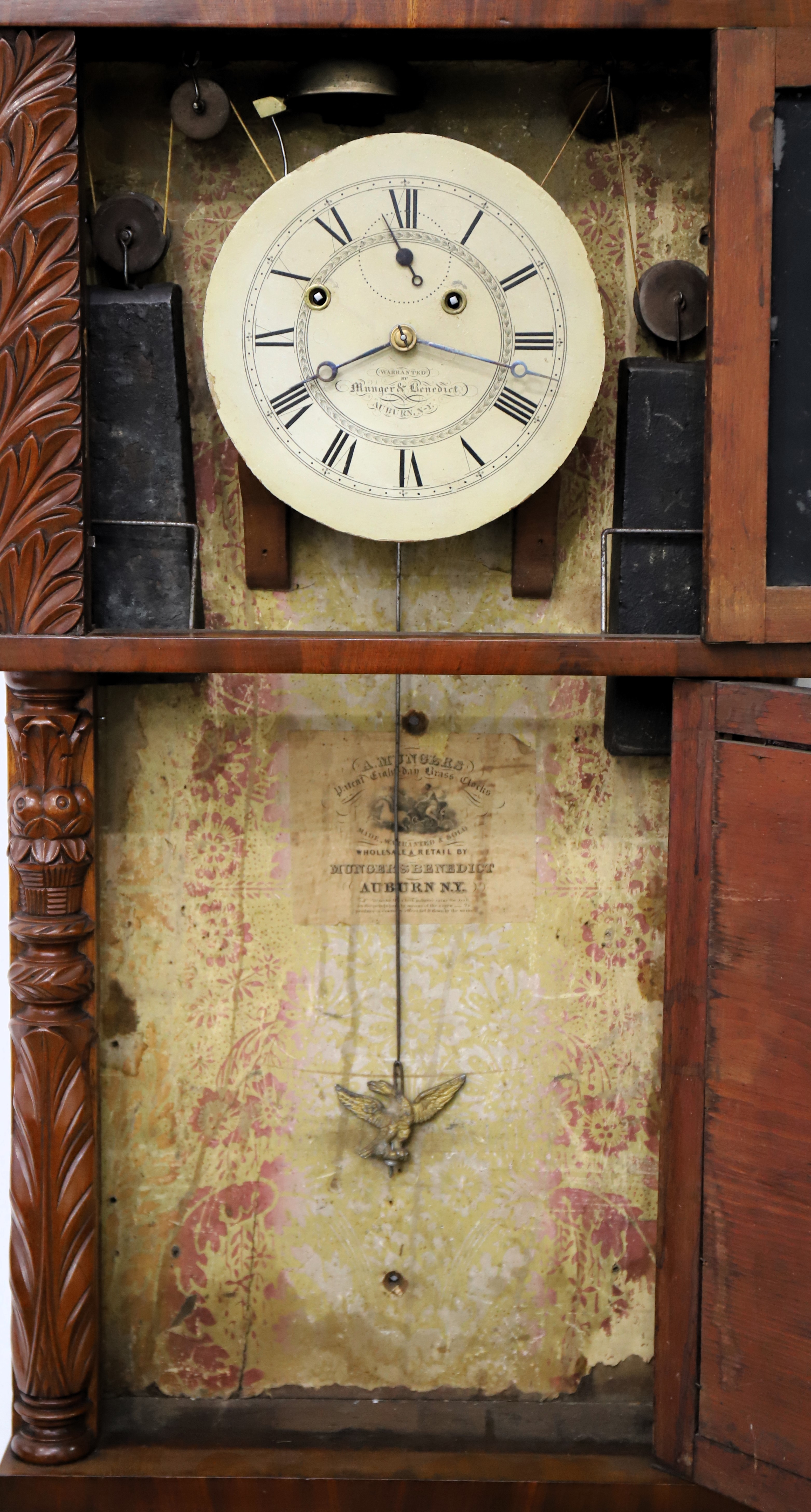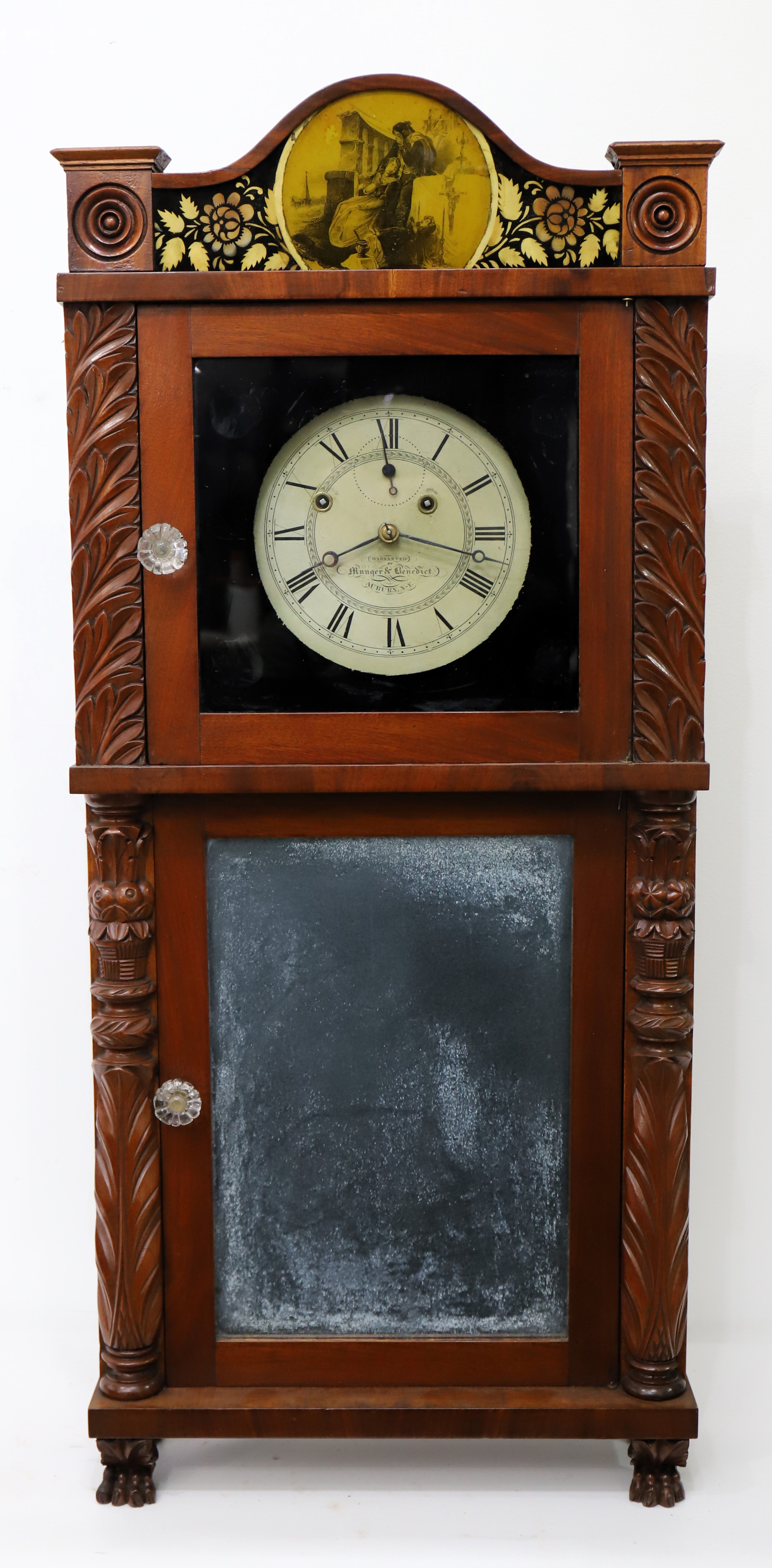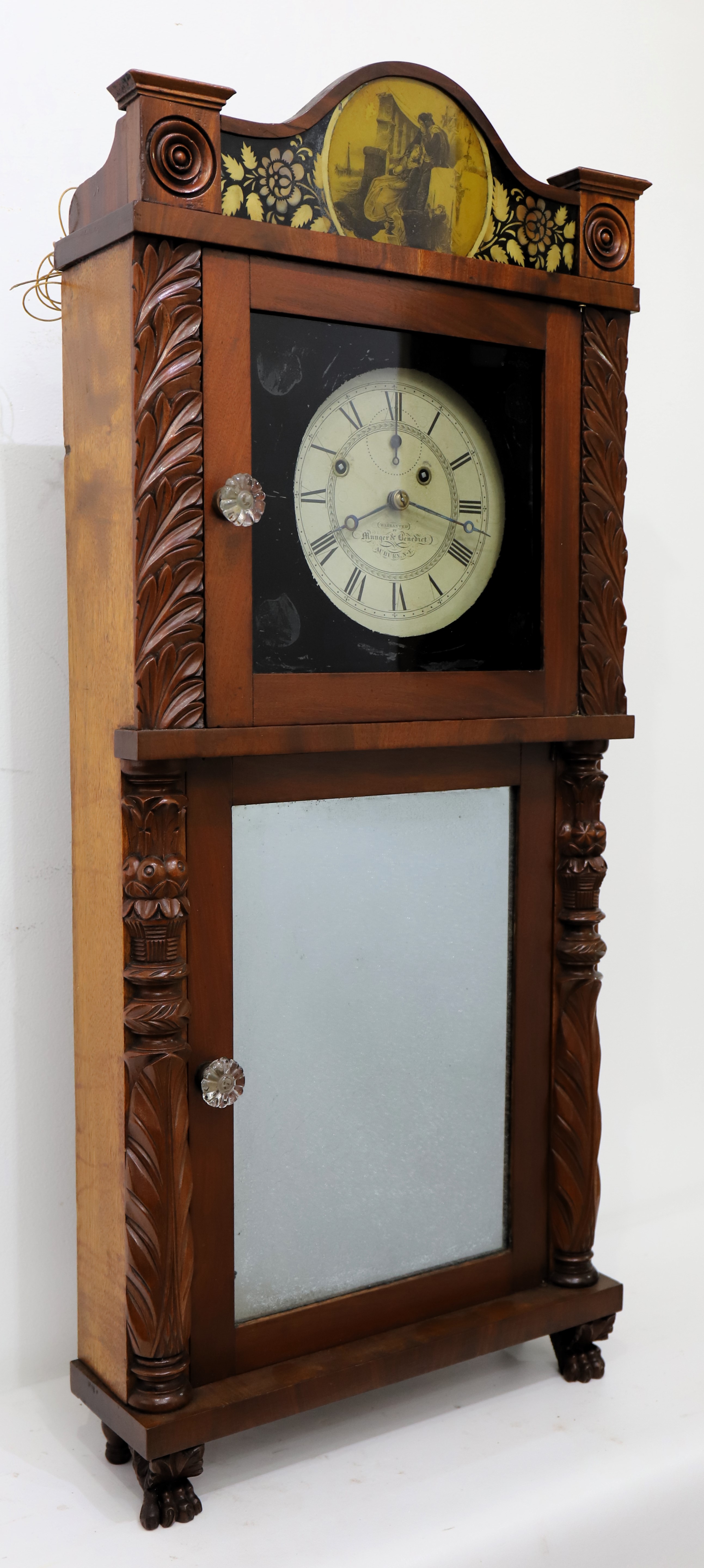 Munger & Benedict “Patent Eight-day Brass Clock”, 1831-1833. Asa and Thaddeus formed a partnership in 1825 but didn’t include Benedict on the label until 1831; after 1833 Clark Hotchkiss joined the group and it was renamed Munger & Co. The 41-inch case is veneered in mahogany with carved half-columns top and bottom. The sides are lighter in color, perhaps a different wood. Note the unusual reverse-painted glass splat depicting, I think, a couple lamenting the death of their daughter. The dial glass is original with the original paint, but the decorations in the corners are no longer well defined. The lower mirror certainly appears to be original. The painted dial is also original, signed ‘Warranted by Munger & Benedict, Auburn N-Y’, and with three proper and possibly original hands. The 8-day time-and-strike brass movement is unsigned and unnumbered; it will strike on the hour on the brass overhead bell, but I can’t persuade it to run. I didn’t try too hard. There are two correct weights and a correct and original flying eagle pendulum bob; the interior retains the original wallpaper and a good label in the middle. There are four wooden pulleys and two glass door pulls. Other examples have the same door pulls. AAC sold a similar example in 2021 for $1100; I note that it also had lighter colored veneer on the sides. Schmidt’s Antiques sold a nice example last fall for $1000. $600–$1000.