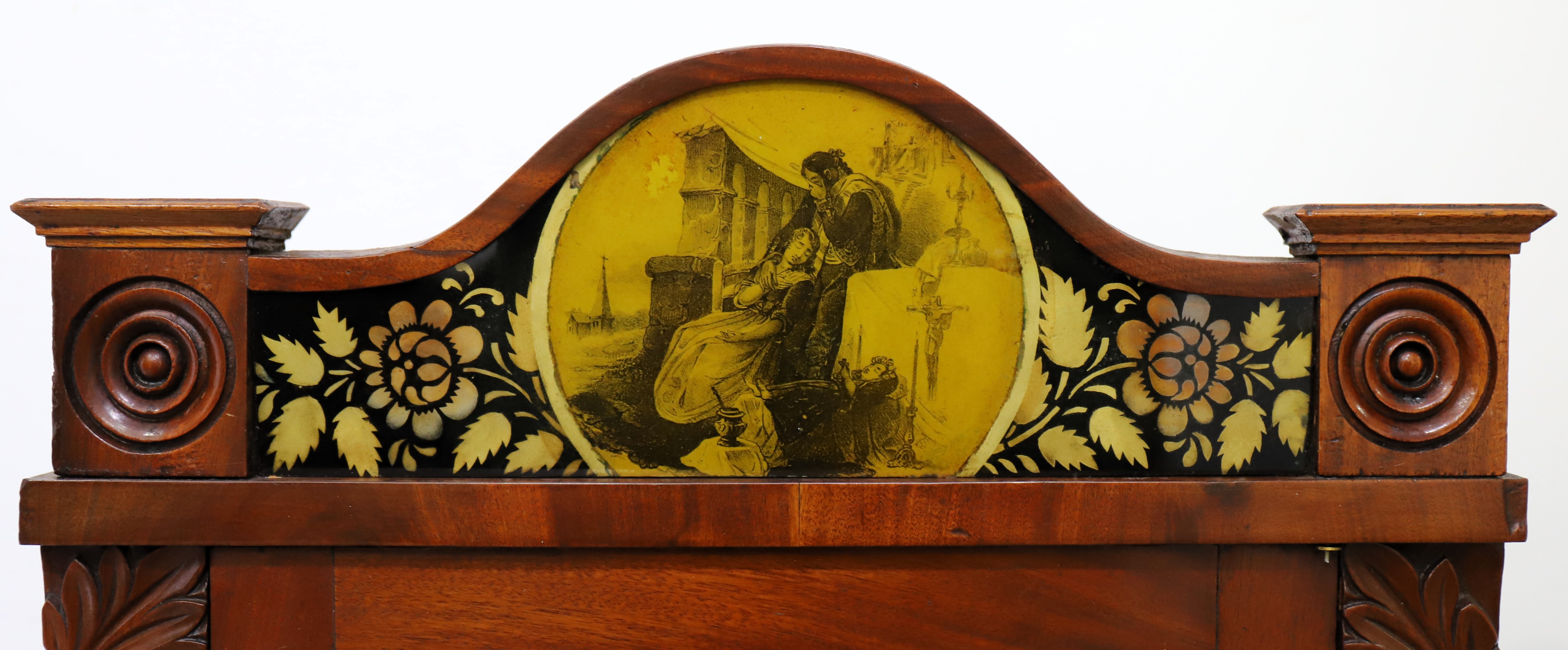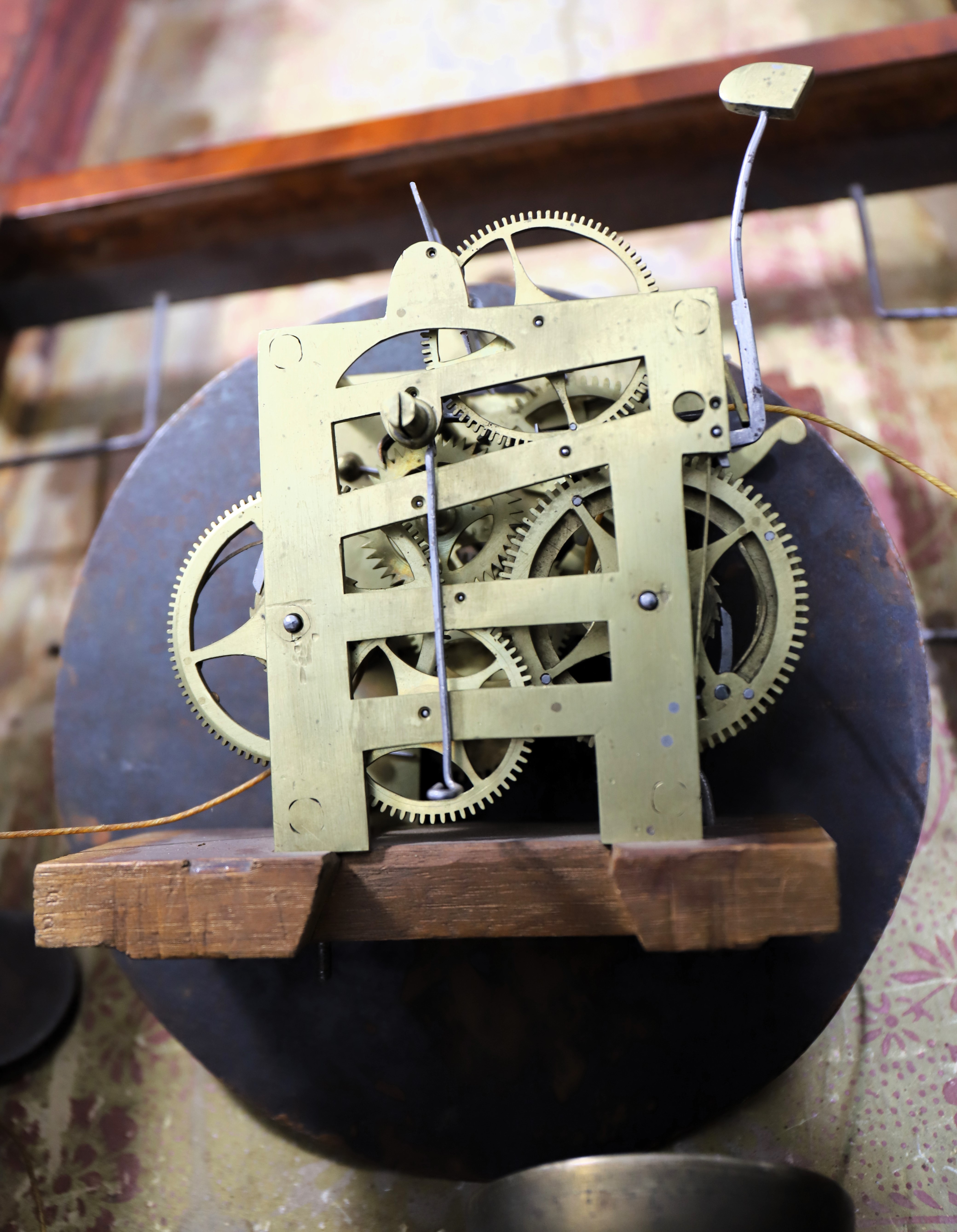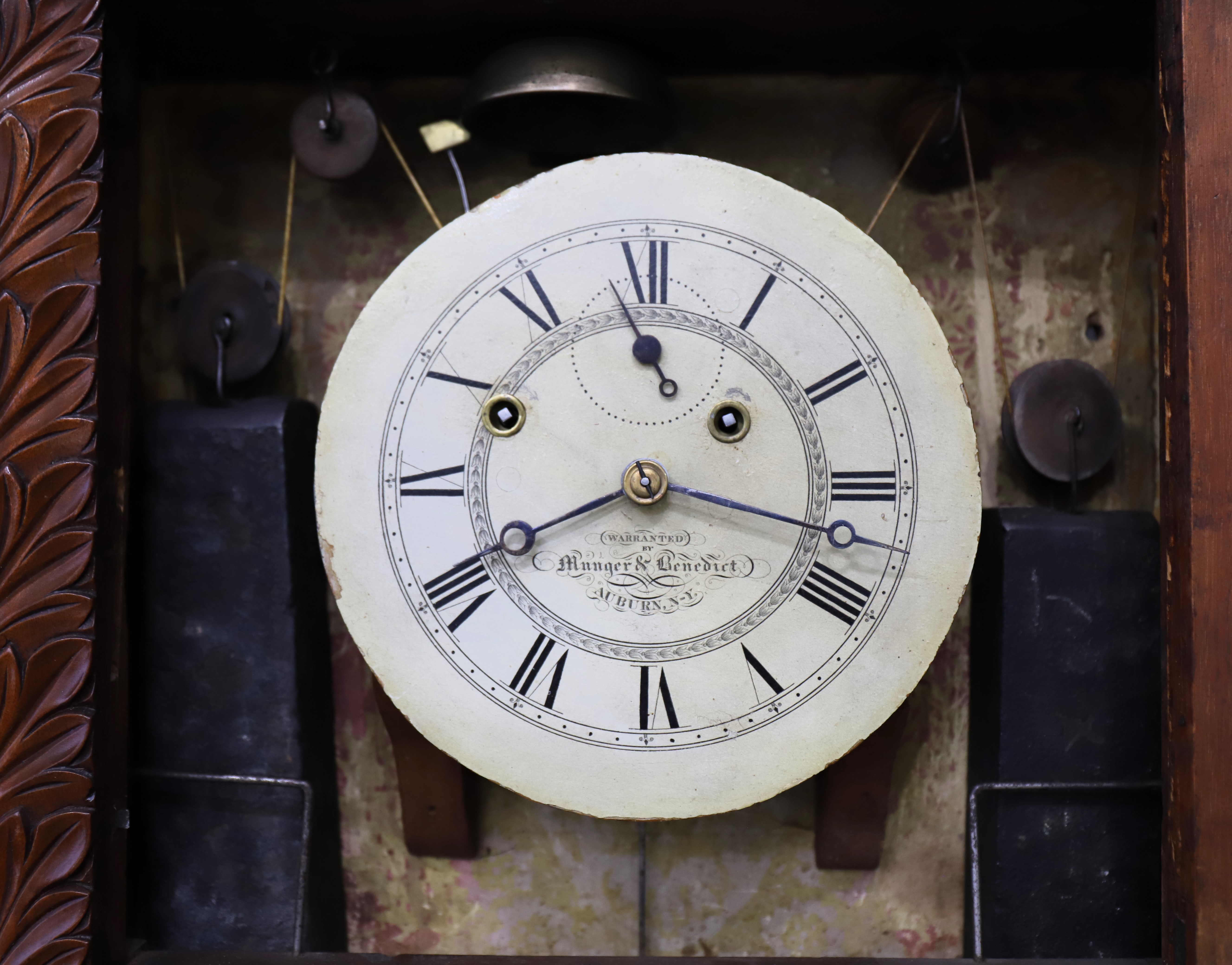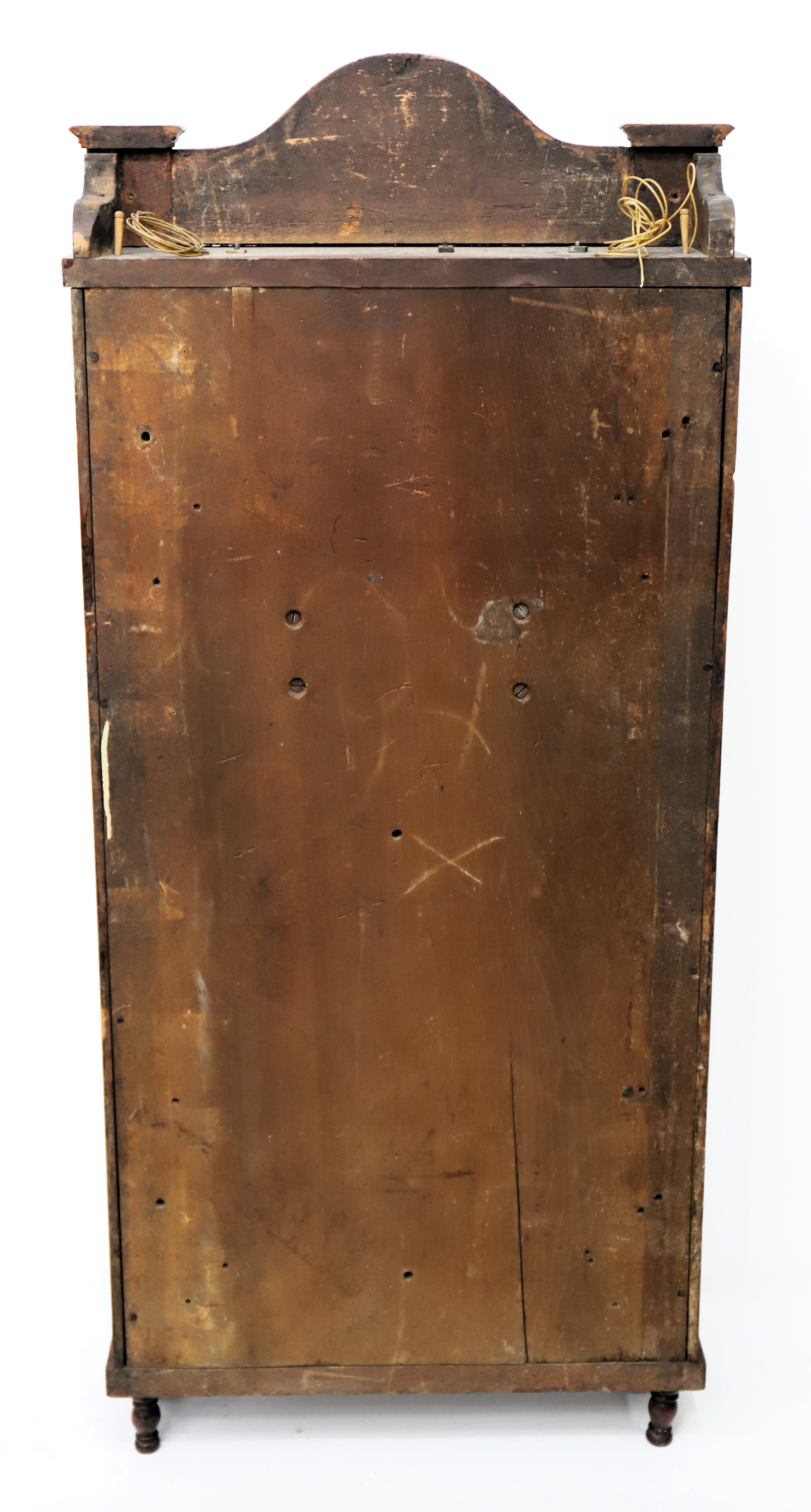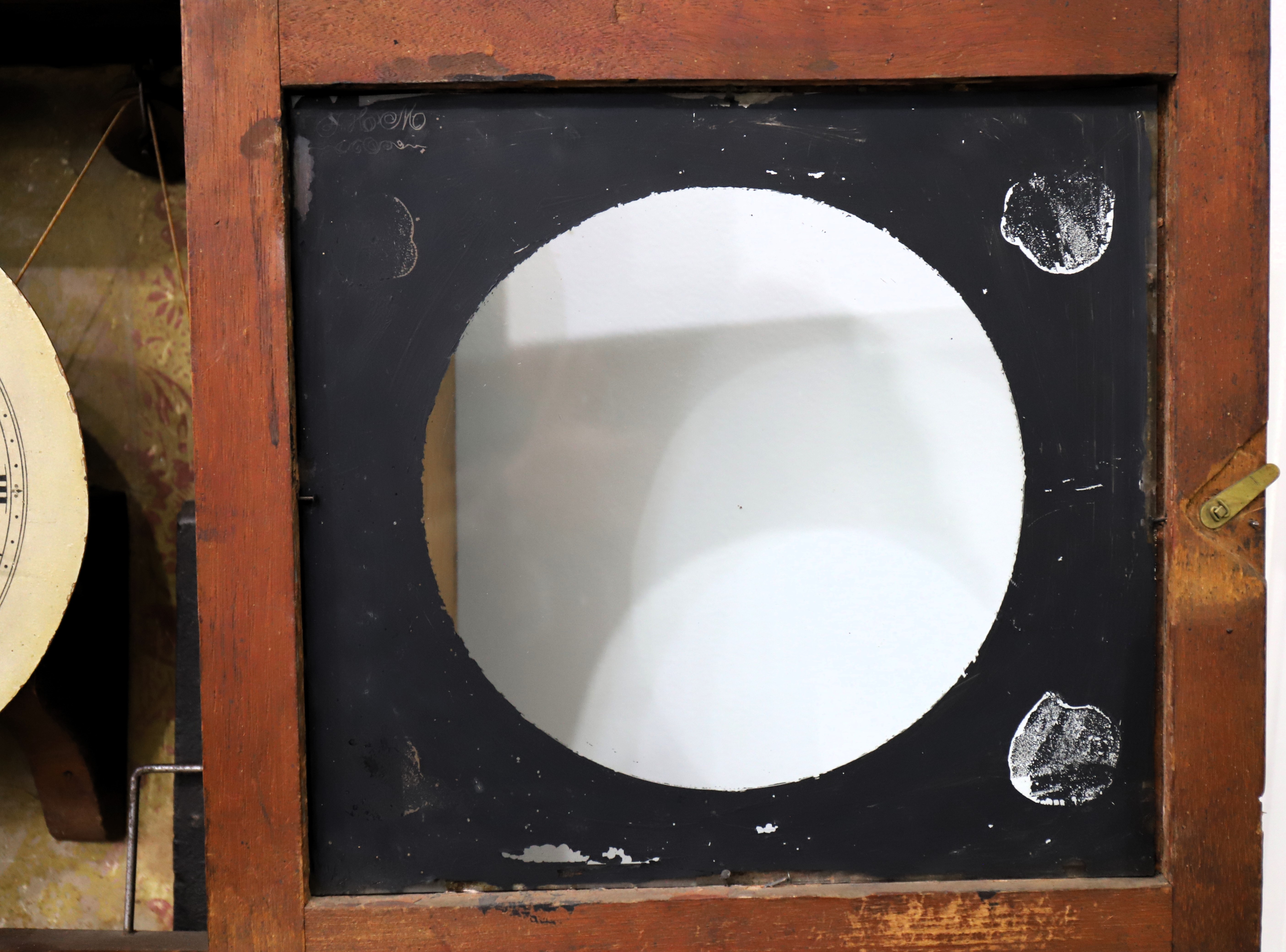 Munger & Benedict “Patent Eight-day Brass Clock”, 1831-1833. Asa and Thaddeus formed a partnership in 1825 but didn’t include Benedict on the label until 1831; after 1833 Clark Hotchkiss joined the group and it was renamed Munger & Co. The 41-inch case is veneered in mahogany with carved half-columns top and bottom. The sides are lighter in color, perhaps a different wood. Note the unusual reverse-painted glass splat depicting, I think, a couple lamenting the death of their daughter. The dial glass is original with the original paint, but the decorations in the corners are no longer well defined. The lower mirror certainly appears to be original. The painted dial is also original, signed ‘Warranted by Munger & Benedict, Auburn N-Y’, and with three proper and possibly original hands. The 8-day time-and-strike brass movement is unsigned and unnumbered; it will strike on the hour on the brass overhead bell, but I can’t persuade it to run. I didn’t try too hard. There are two correct weights and a correct and original flying eagle pendulum bob; the interior retains the original wallpaper and a good label in the middle. There are four wooden pulleys and two glass door pulls. Other examples have the same door pulls. AAC sold a similar example in 2021 for $1100; I note that it also had lighter colored veneer on the sides. Schmidt’s Antiques sold a nice example last fall for $1000. $600–$1000.