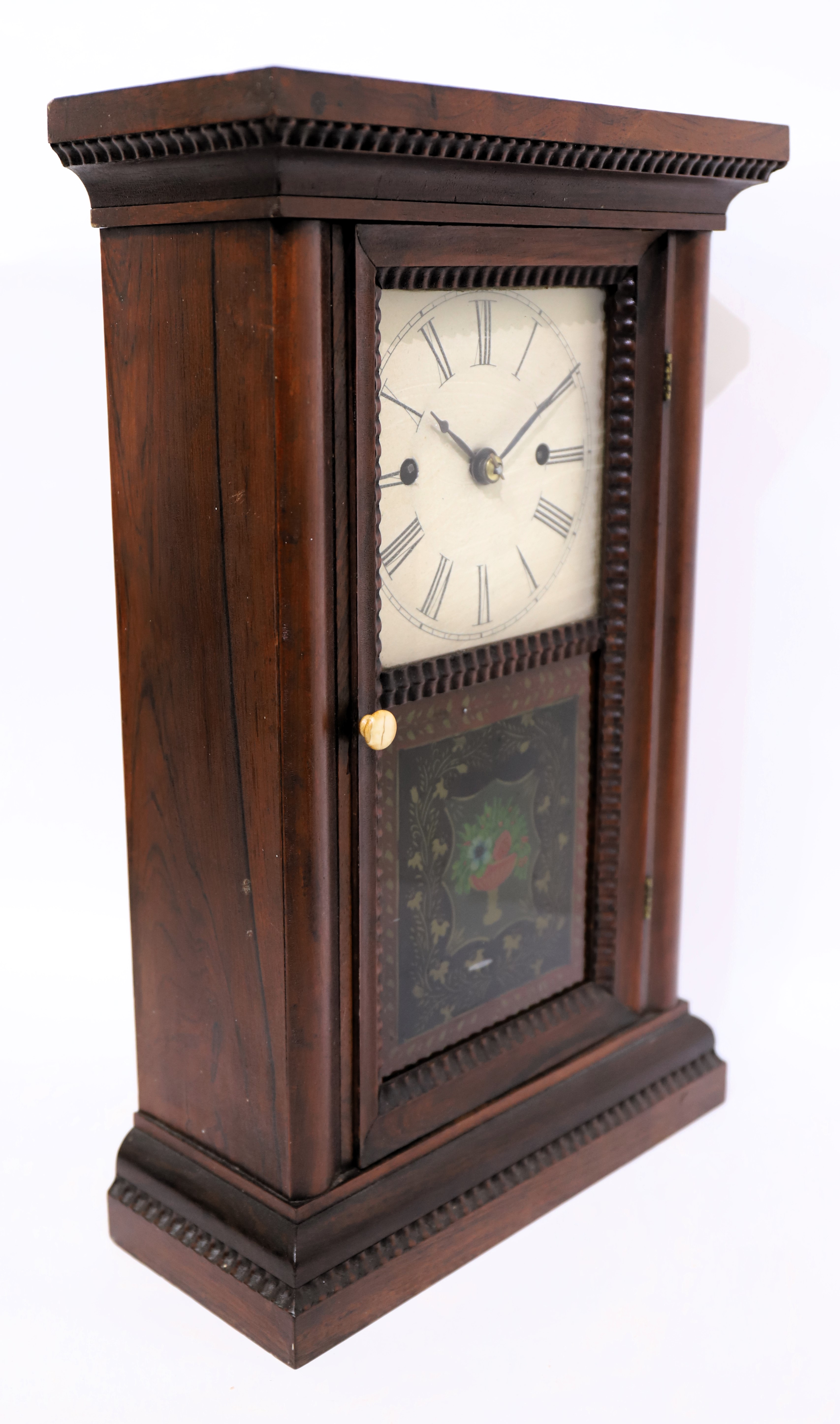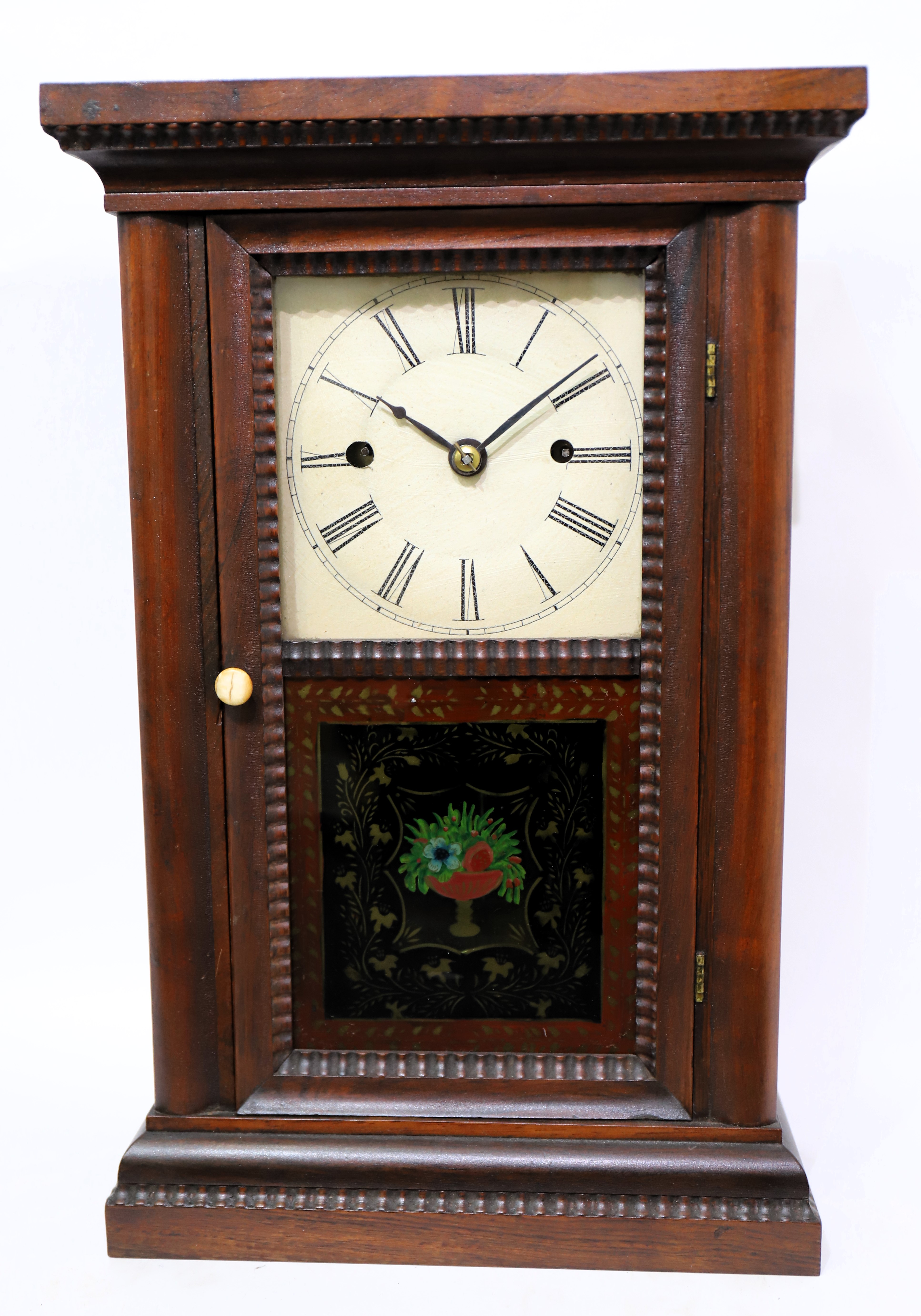Co ripple-trim fusee shelf clock, 1842-1849. An 18-inch mahogany case with ripple trim around the door, base, and top and an