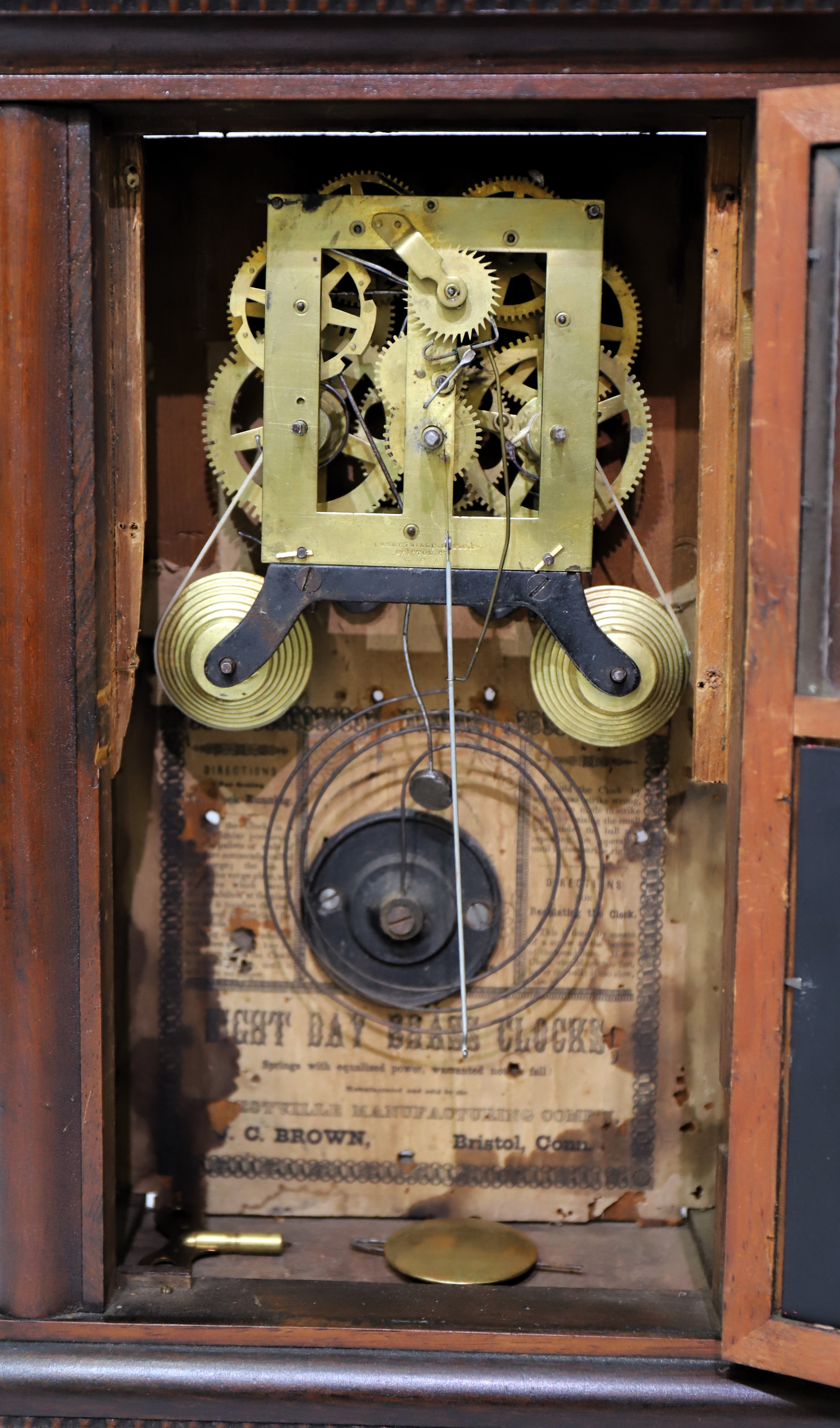Forestville M.F.G. Co. and will run for a while and strike on the wire gong. There is a good label inside. $100–$200.