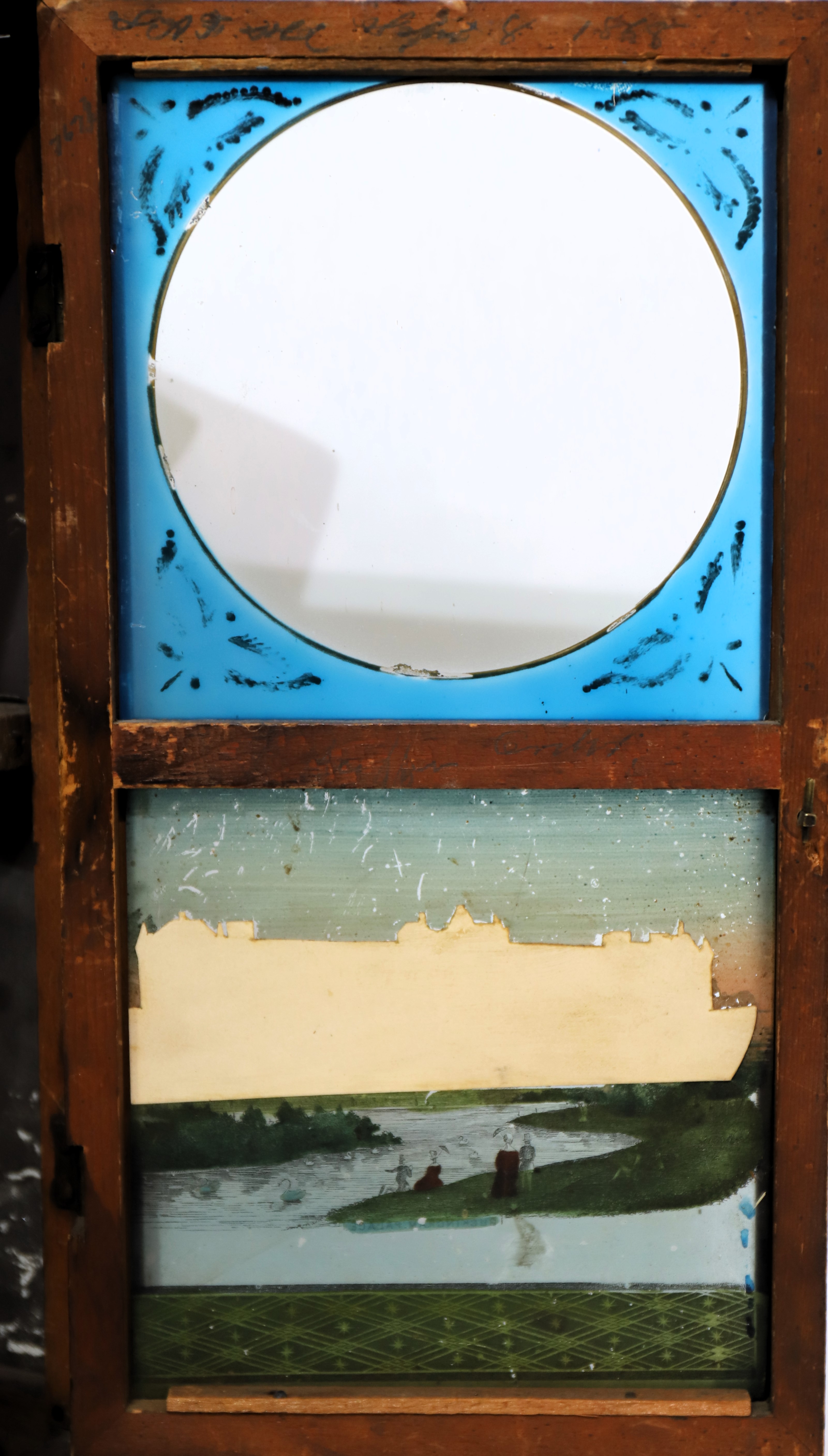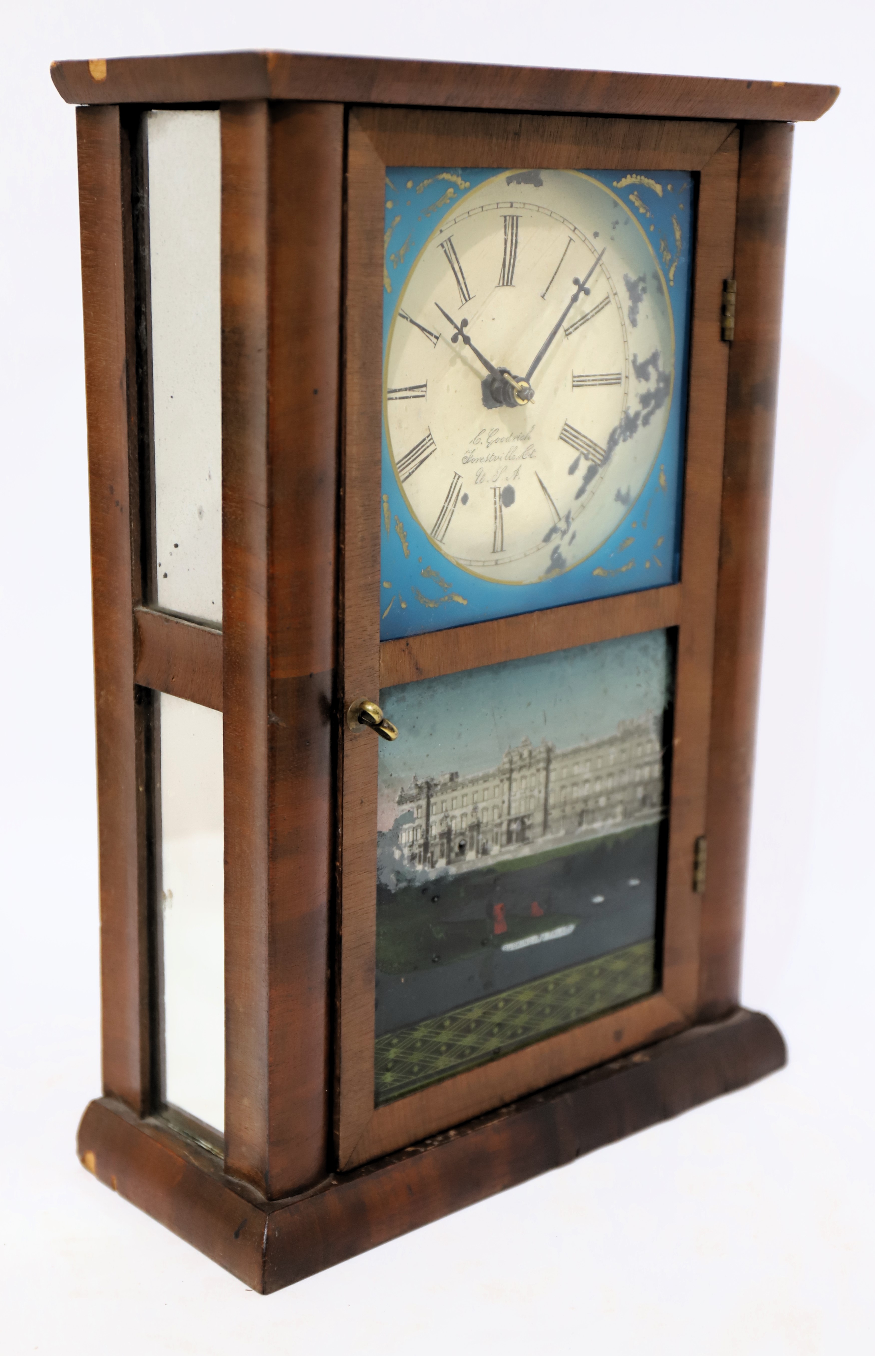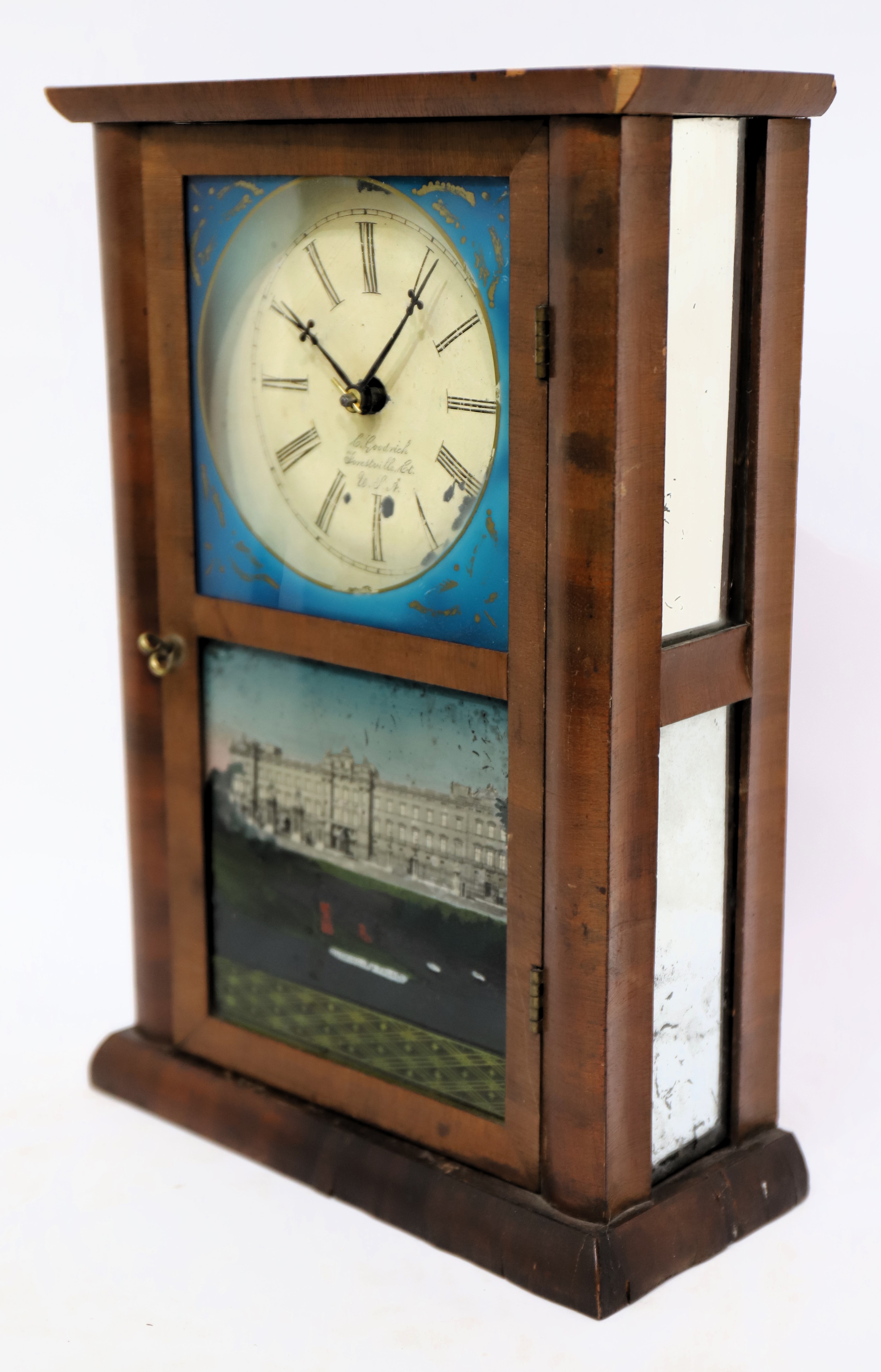 mirror-sided shelf clock, ca. 1853. A 13.5-inch mahogany case with double mirrors on each side. The four mirrors and the