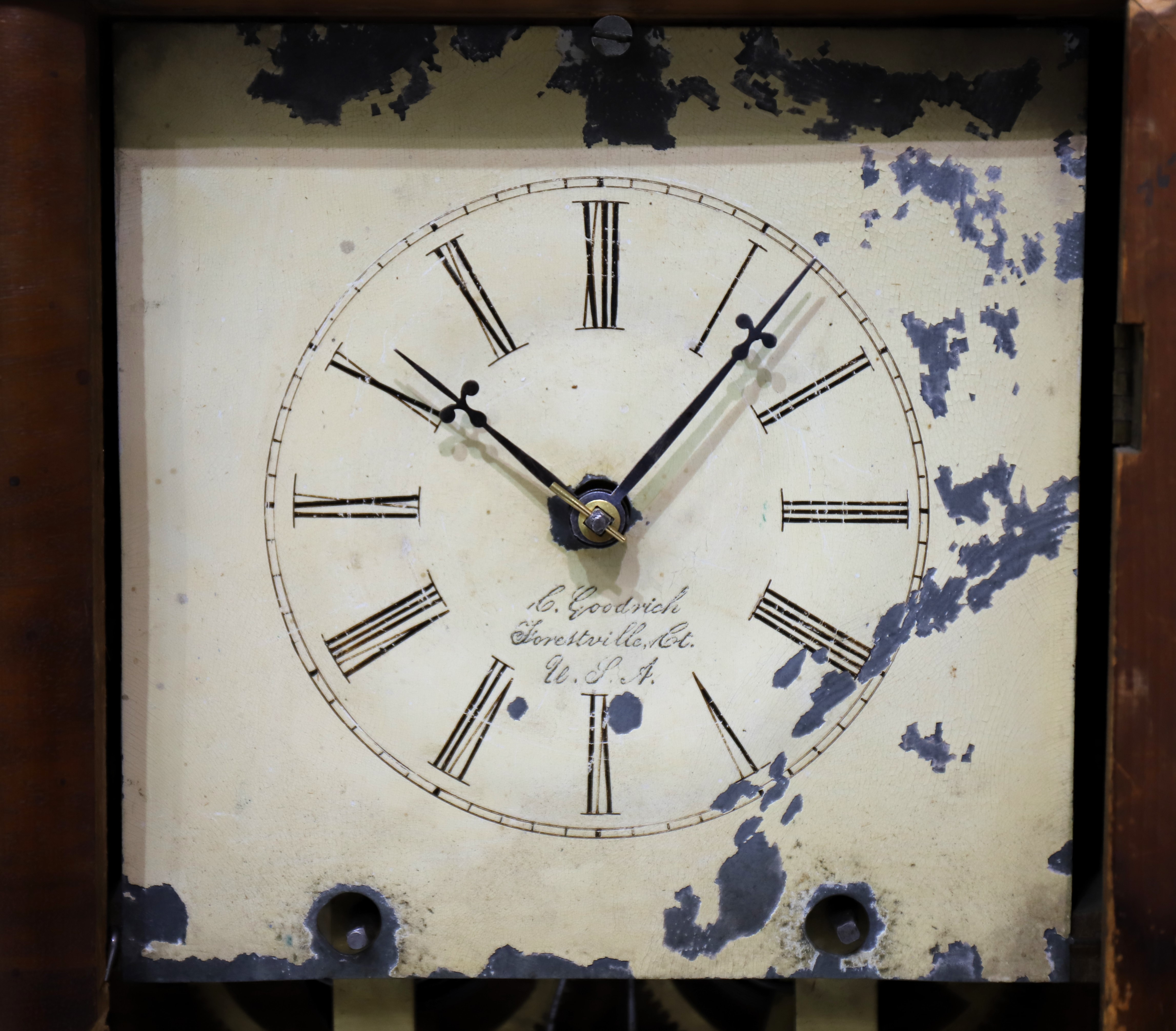 shows considerable chipping, the hands are period. The 8-day, time-and-strike movement is unsigned and will run for a short