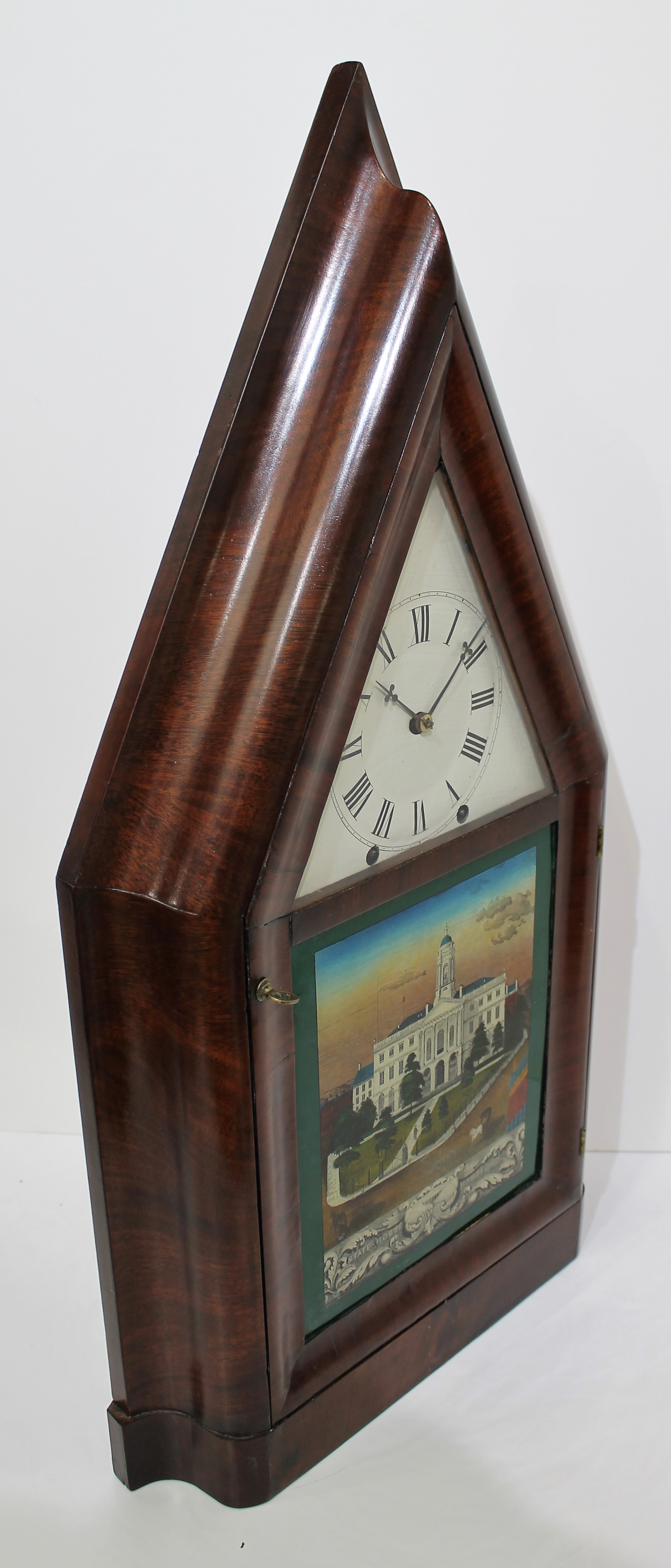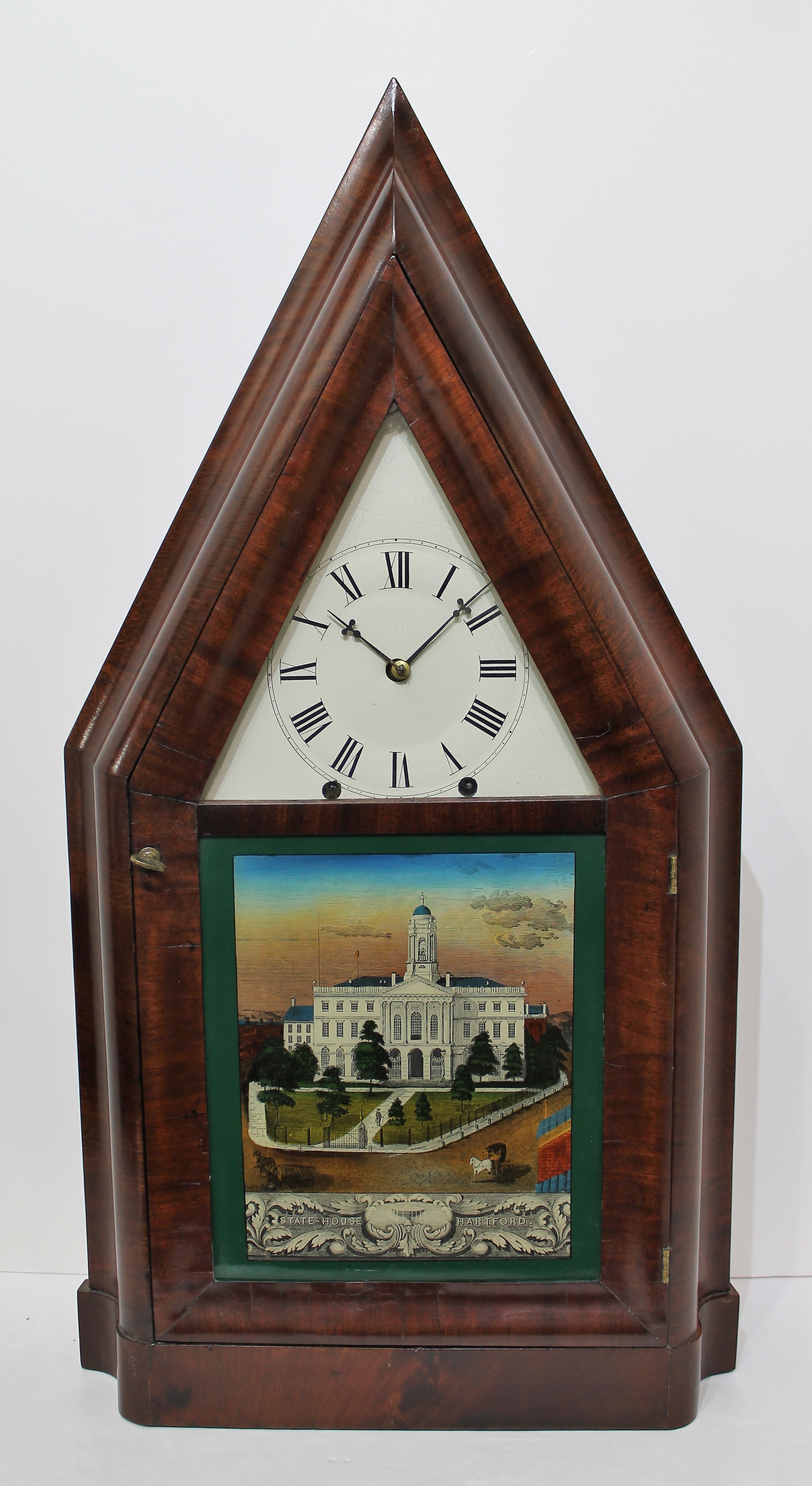 John Hunt oversize OG steeple, ca. 1850. An absolutely gorgeous 29-inch walnut-veneer case with a polished finish. Both glasses are period, the dial glass almost certainly original, the lower glass a likely replacement and repainted to show the State House at Hartford, CT, probably adapted from a lithograph by Edward Williams Clay in 1834 (see image). The backboard is beveled at the edges to blend into the side trim pieces. The dial has been repainted, the hands are proper replacements. The 8-day, time-and-strike movement is unsigned, running and striking on the wire gong; it was likely made by Wells, Hendrick & Co. in Bristol CT (Snowden Taylor, NAWCC Bulletin 270, page 16) and was found in another John Hunt oversize steeple much like this one (Dworetsky & Dickstein, Horology Americana, page 179). The movement was adapted from a weight-driven movement, so to hold springs in place, it appears that false count wheels were placed on the front of each winding drum (NAWCC Supplement No. 9, pages 58–59). The label is also adapted from a weight-driven movement, with instructions on how to attach and wind the weights. John Hunt was a case maker and cabinet maker in Plainville, CT, and did not make a lot of clocks, but the ones he made in his later years, like this one, are exceptional. This clock last sold at R.O. Schmitt in 2014 for $6500; there are only two examples of this model known. AAC sold a similar example last January that had a wagon-spring movement for $7500. $5000–$6500.