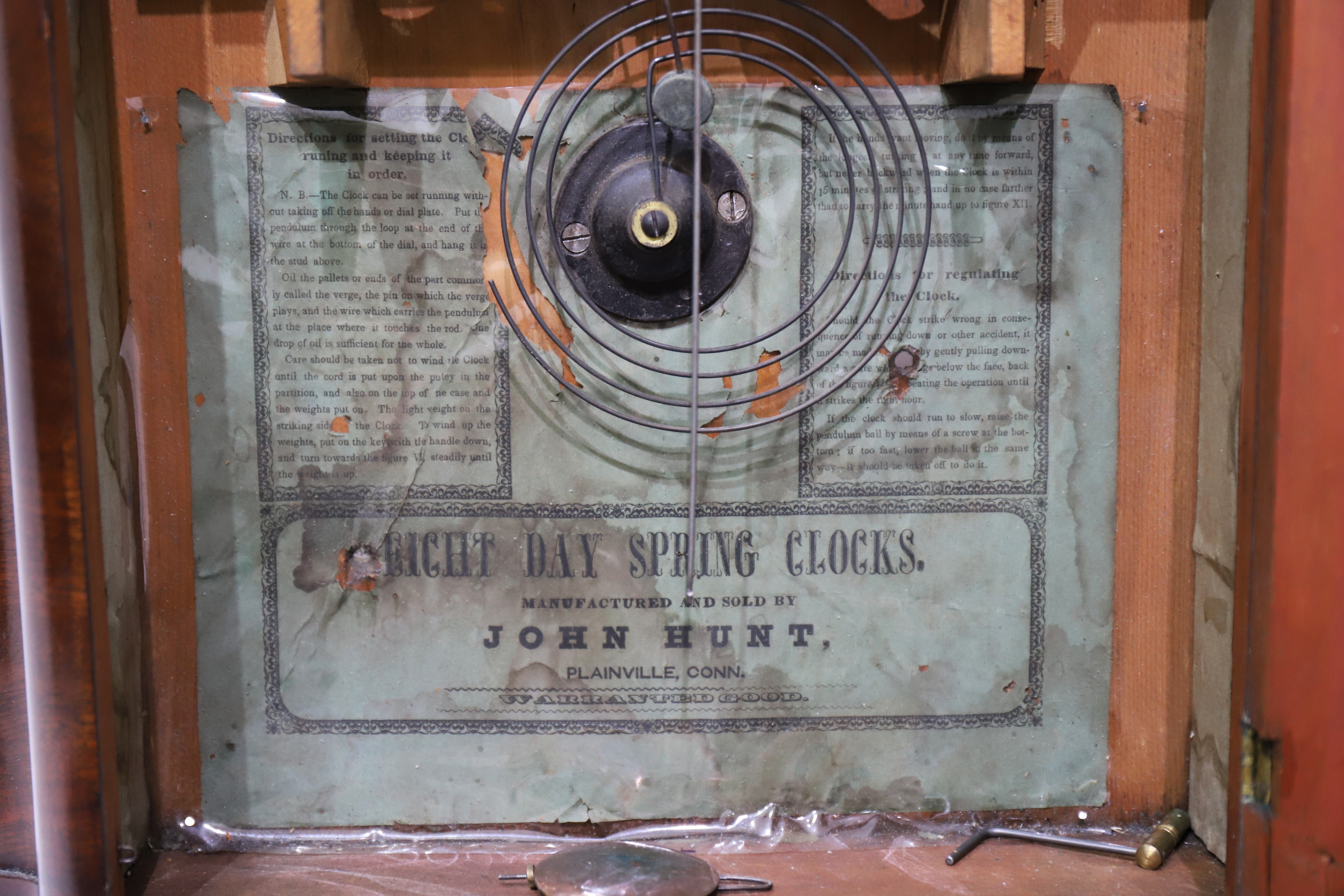 I posted this clock on Facebook and Joe Arvay noted that it looks like the seatboard has been lowered. I agree and am embarrassed that I missed that. Thus, the current movement may not be original. What kind of movement would have been there? That's a good question, as this movement is odd, being adapted from a weight-driven movement. There is no evidence that this case ever held a weight driven movement, despite the label alluding to one. Interestingly, this exact clock is shown the NAWCC Supplement 9 cited above, and no mention of a possible movement substitution was mentioned. It is possible that this is the way John Hunt built it.