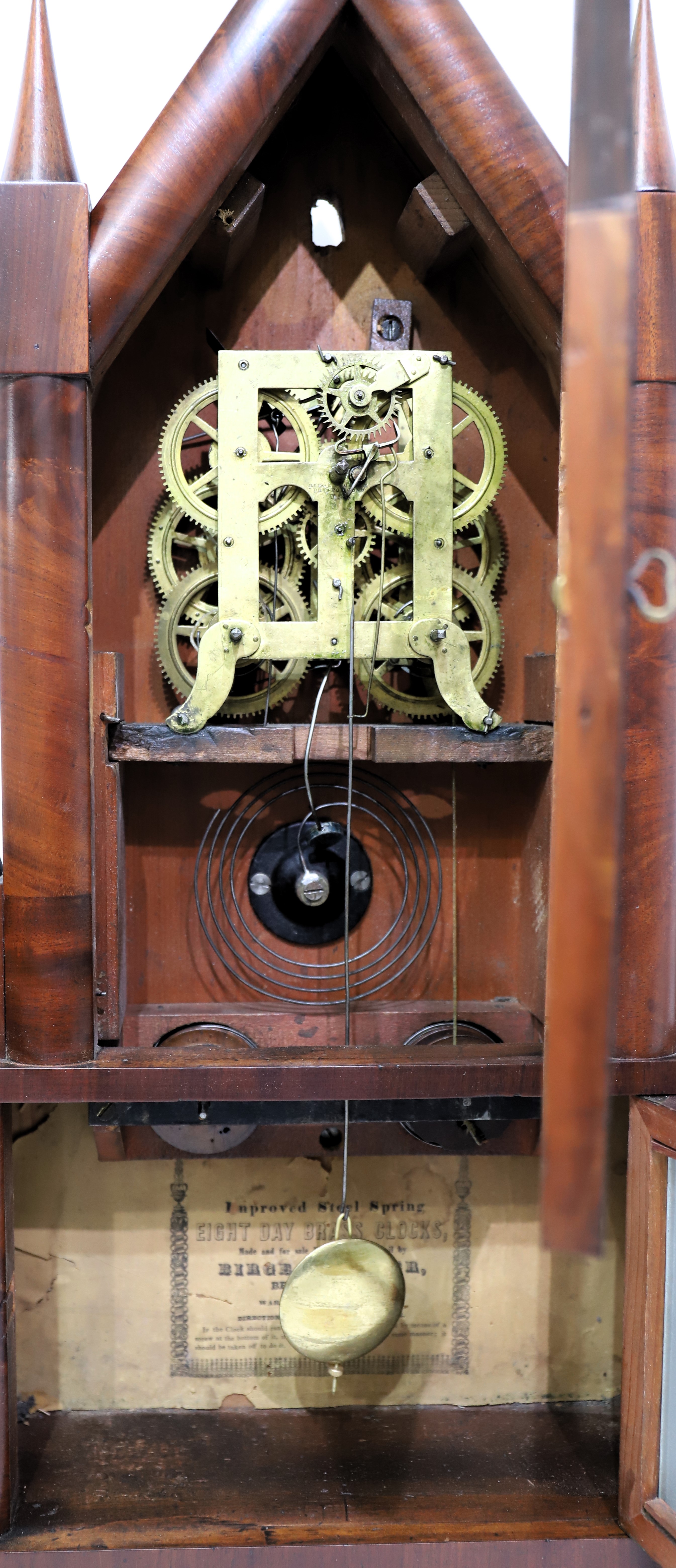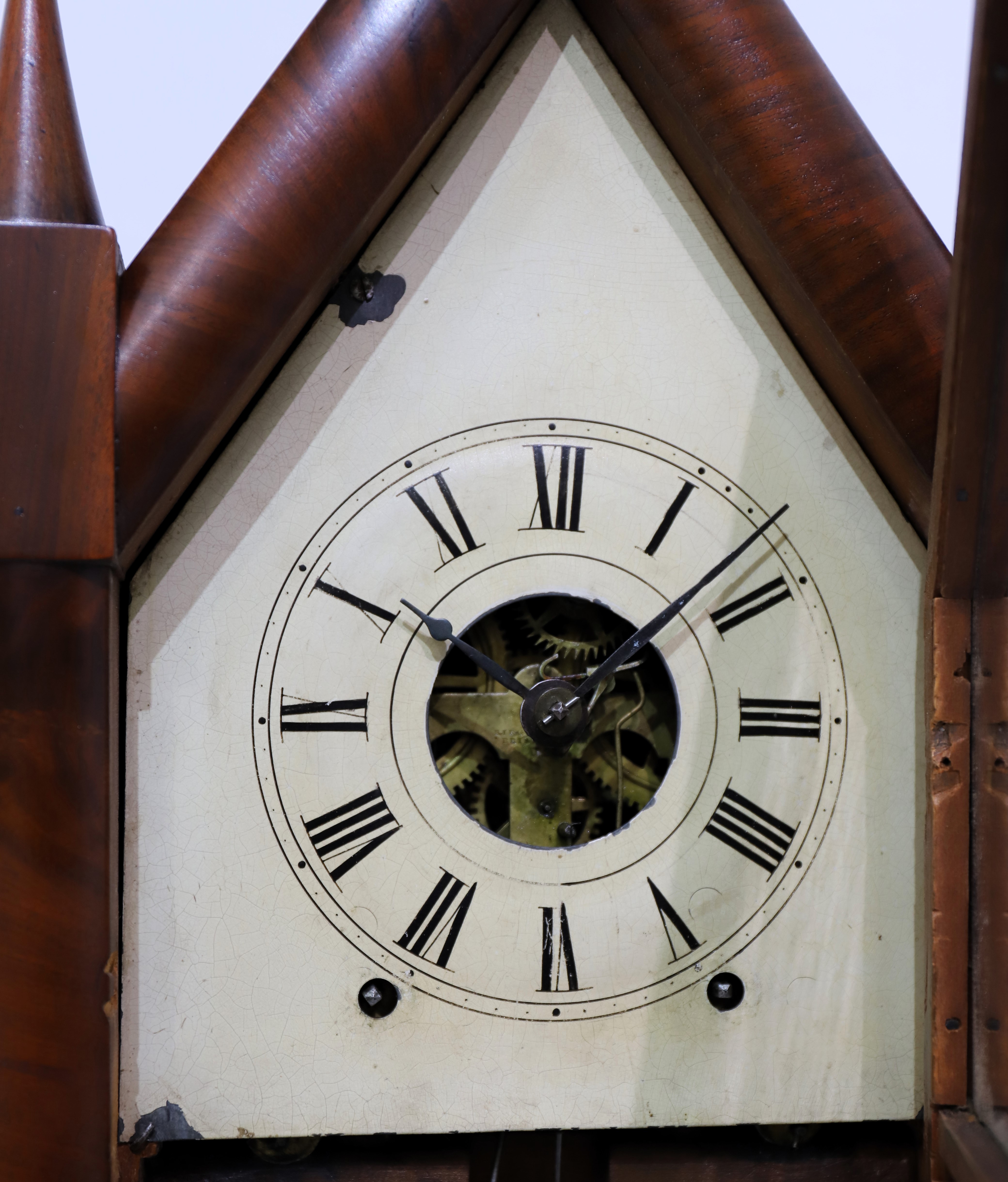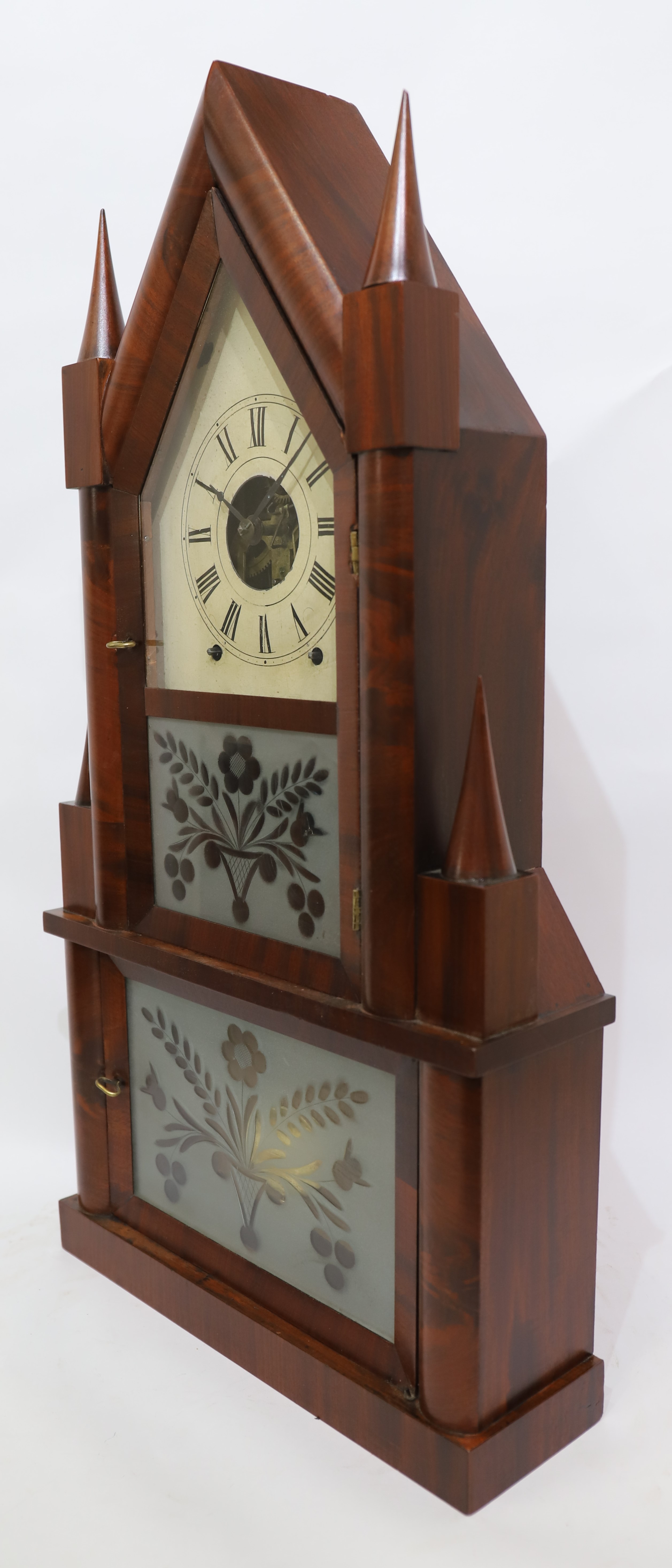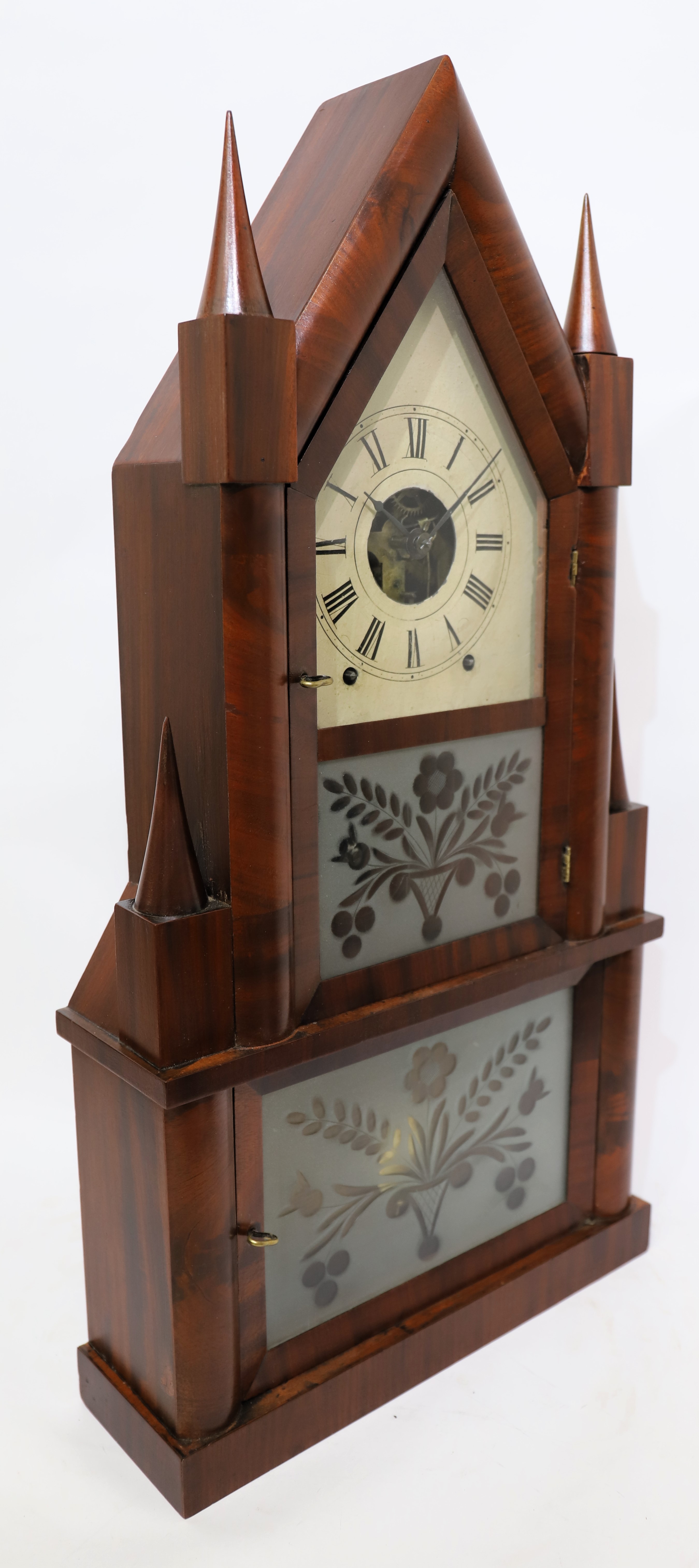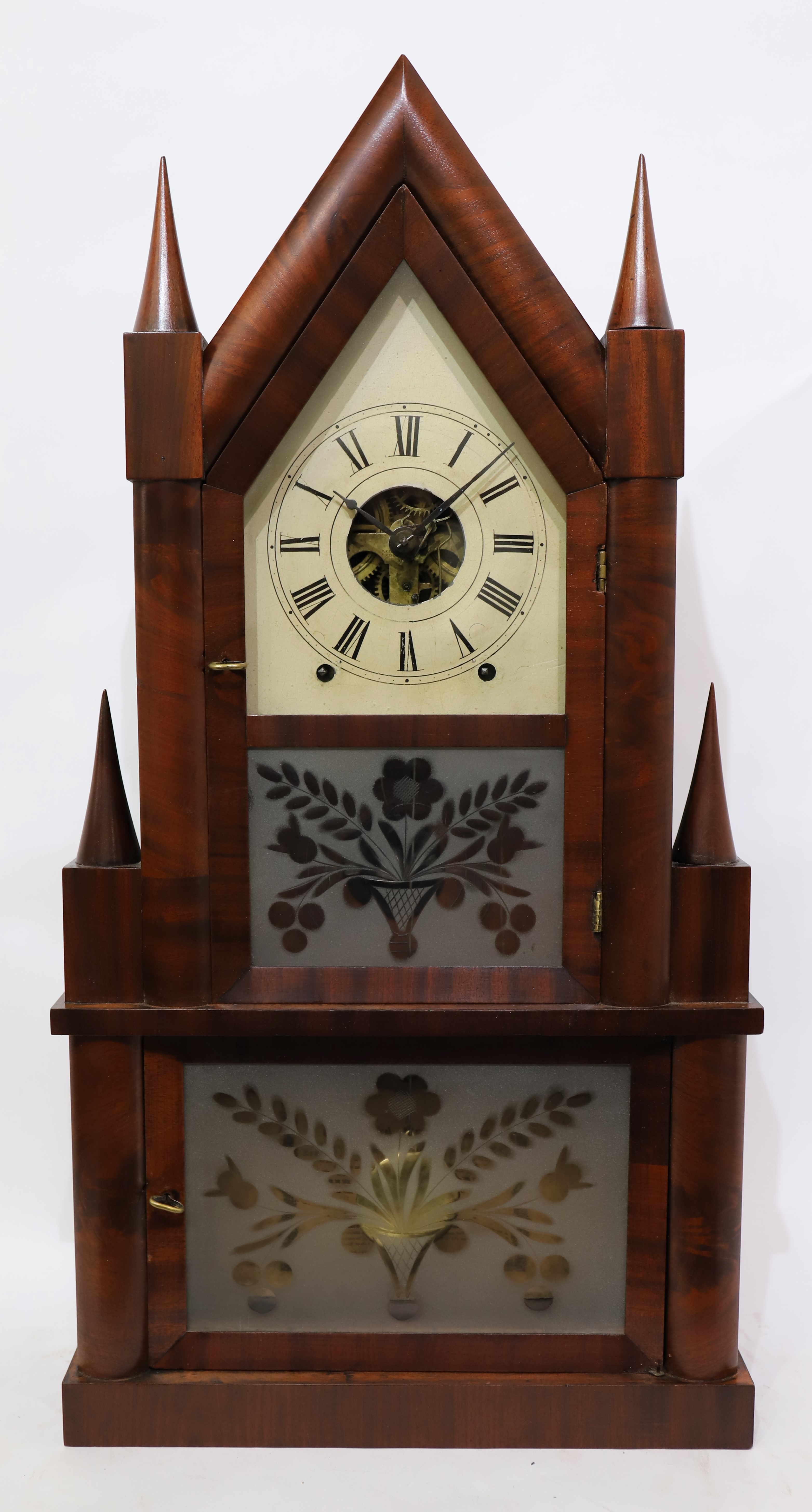 Birge & Fuller double-steeple fusee, 1844-1848. A 26.5-inch case veneered in figured mahogany with a beautiful finish, no chips or evident repairs, and four good cone finials. The three glasses are period, the tablets frosted and cut glass. The dial holds old paint with some chipping, the hands are