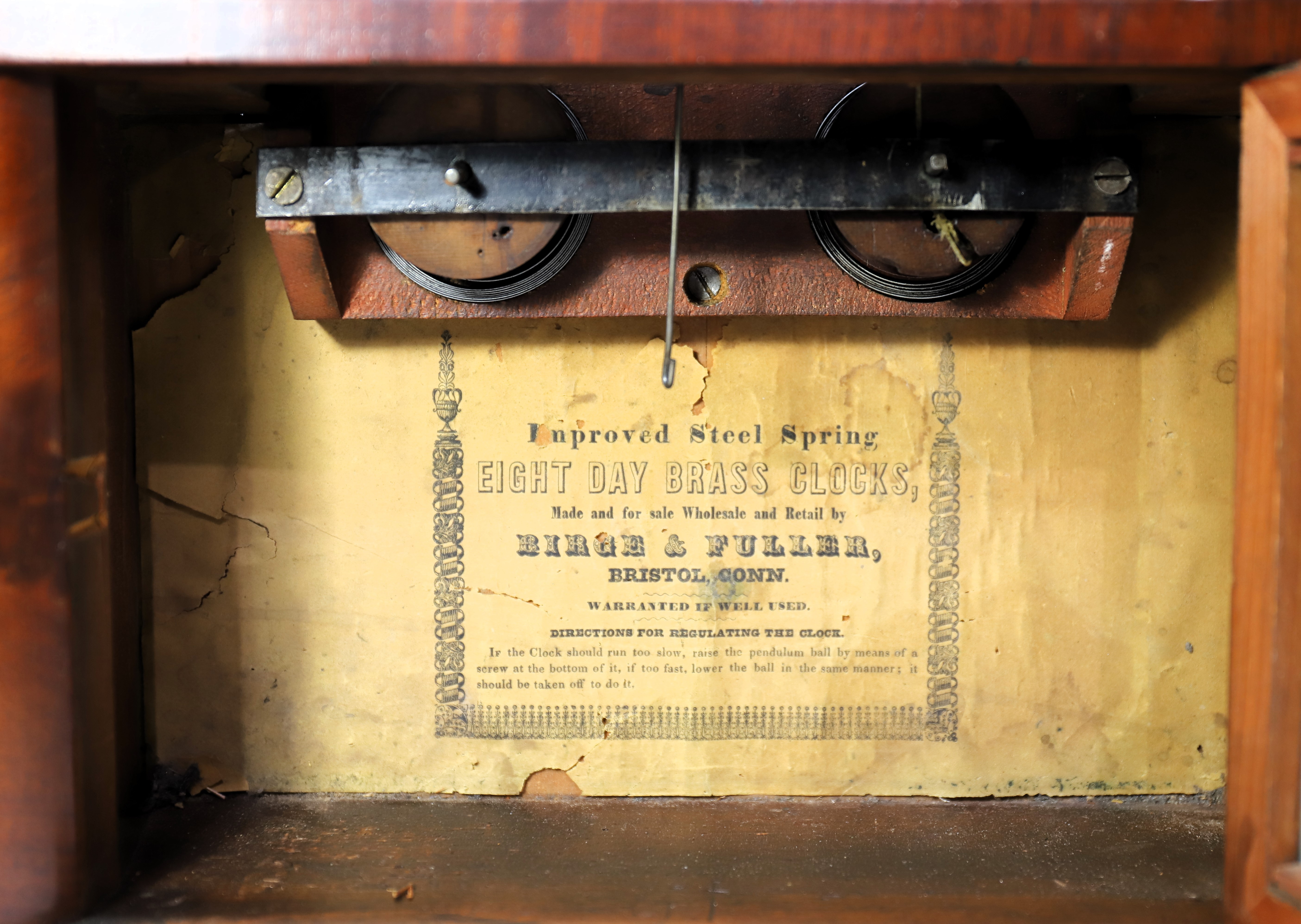 period/original. The 8-day double-fusee, time-and-strike movement is running but the strike cord is broken, and so untested. A good label on the back board. AAC sold a similar example in 2021 for $1401. $1000–$1400.