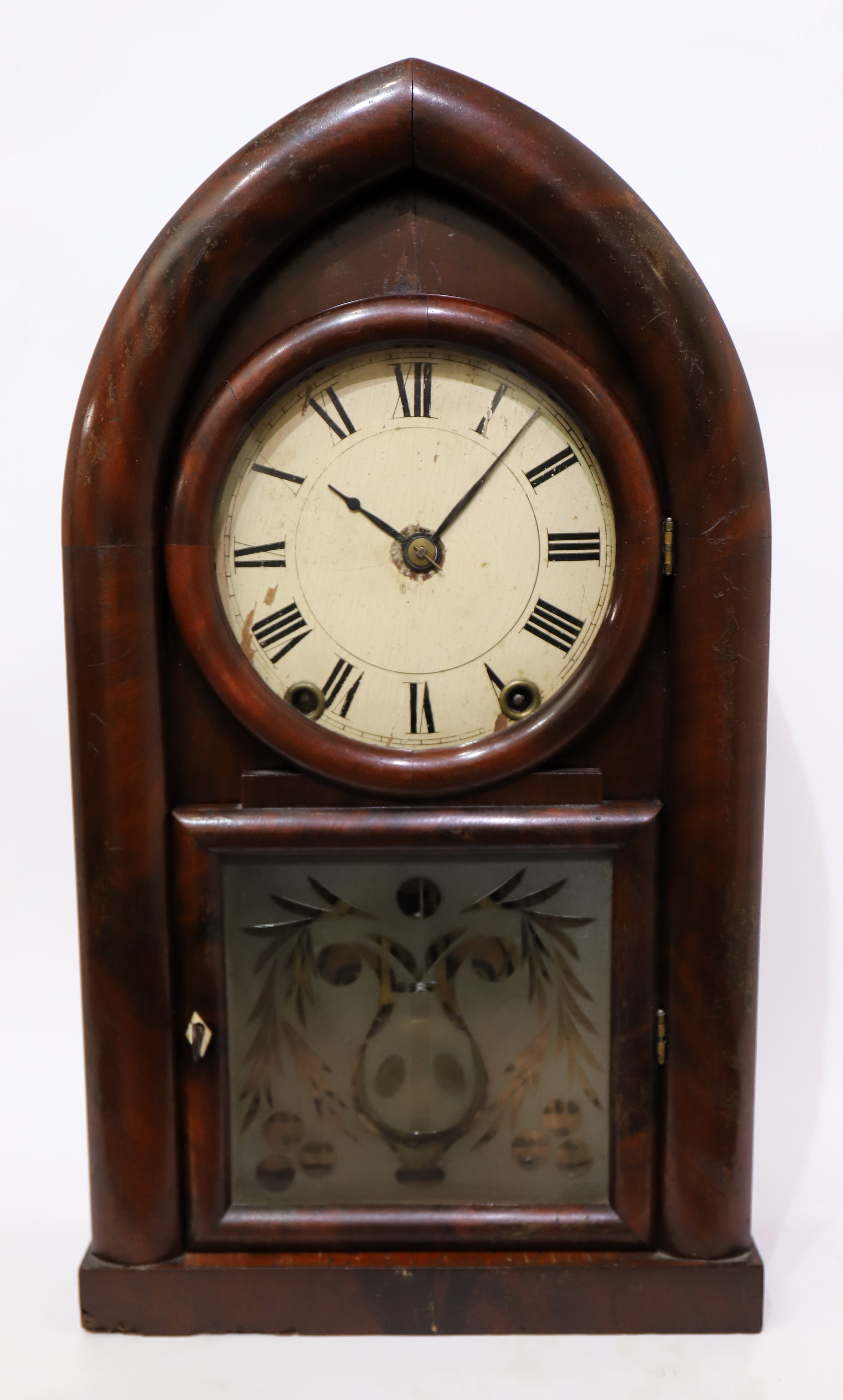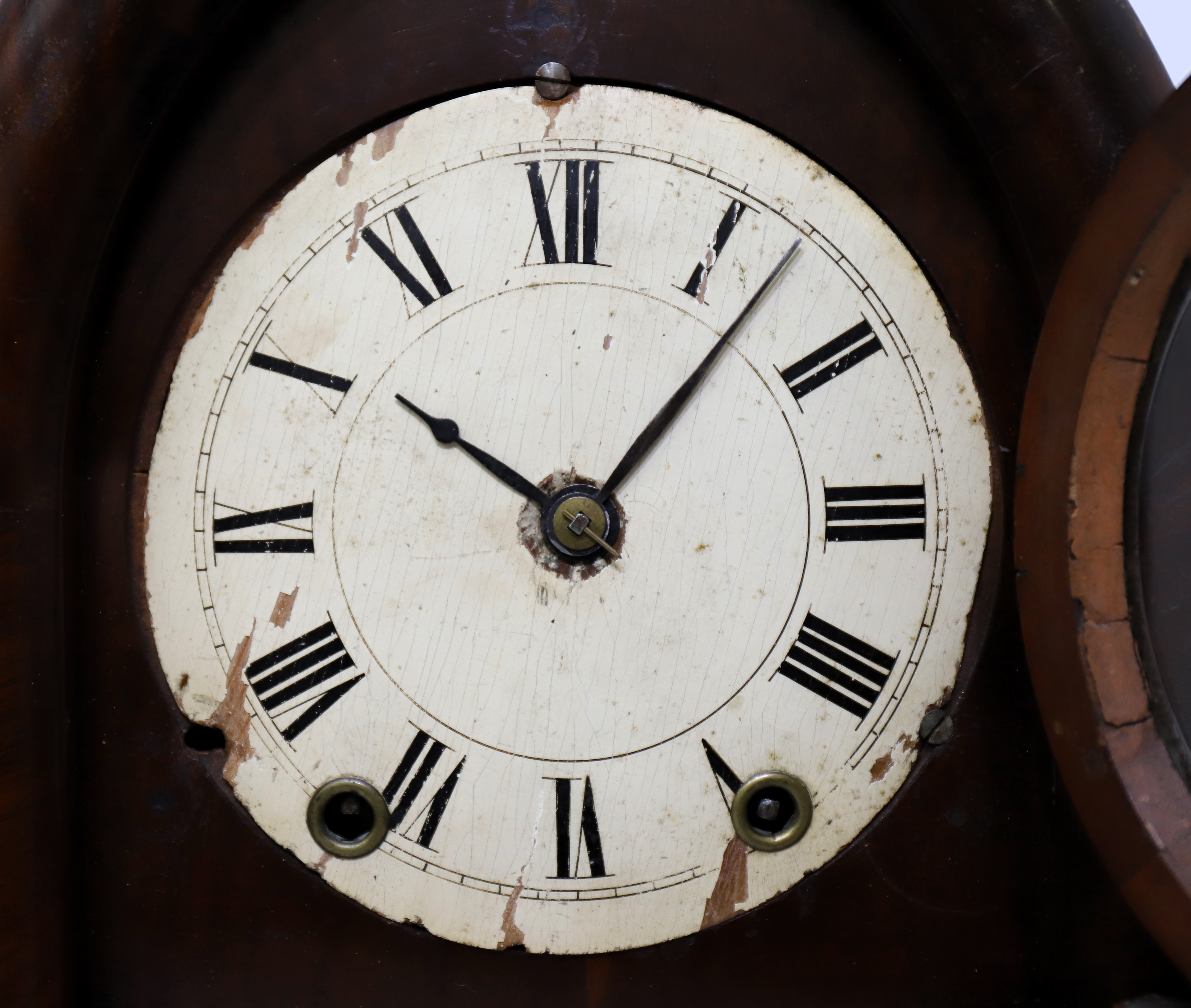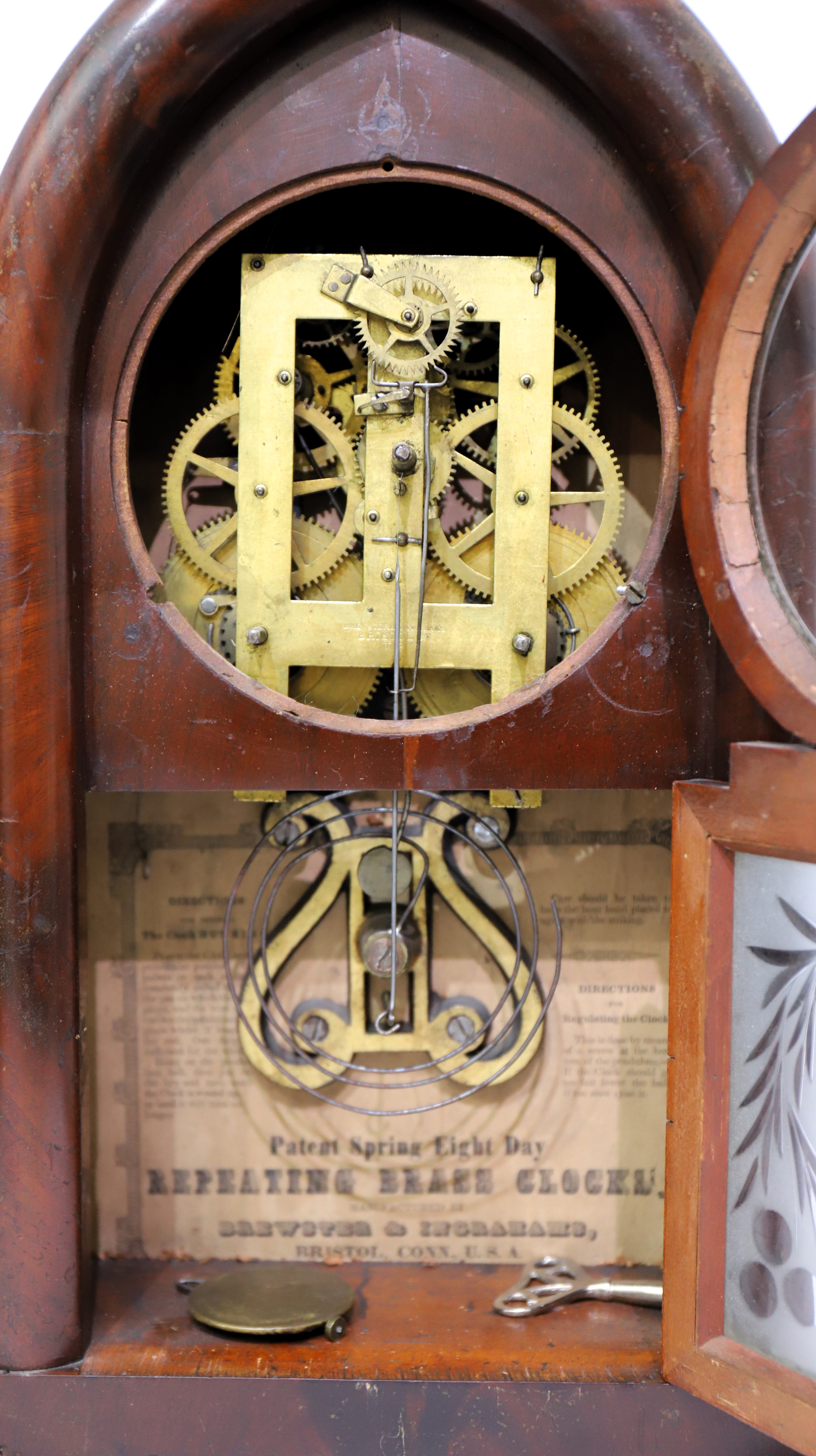 enclosed in iron cups, and the repeating rack and snail strike. The mahogany case has an old finish with some scuffing; both