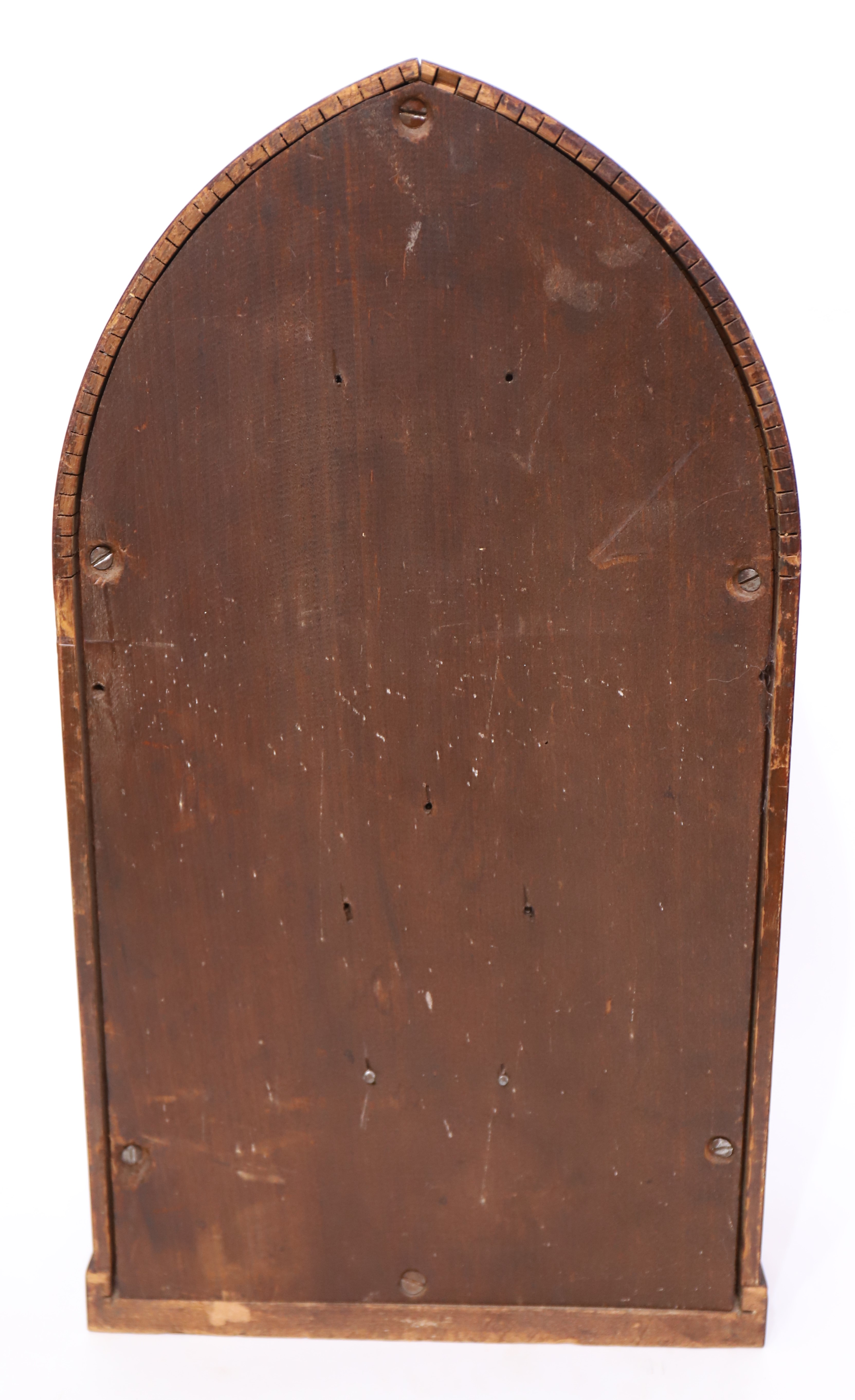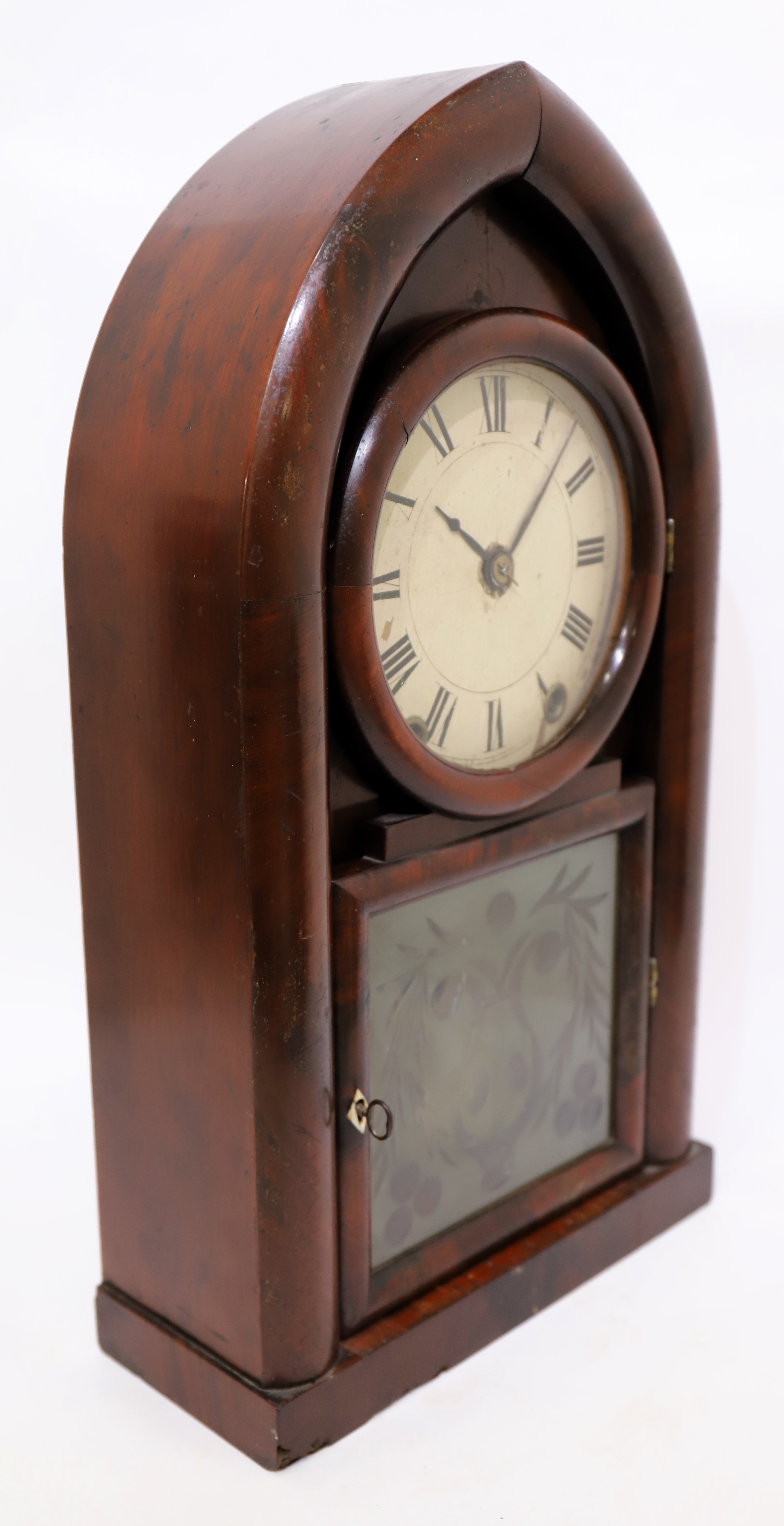 glasses are original with a good cut glass and frosted tablet. There is a key in the ivory escutcheon and a working latch. The original wooden dial with original paint shows some wear and is not securely mounted; the hands are likely original. The