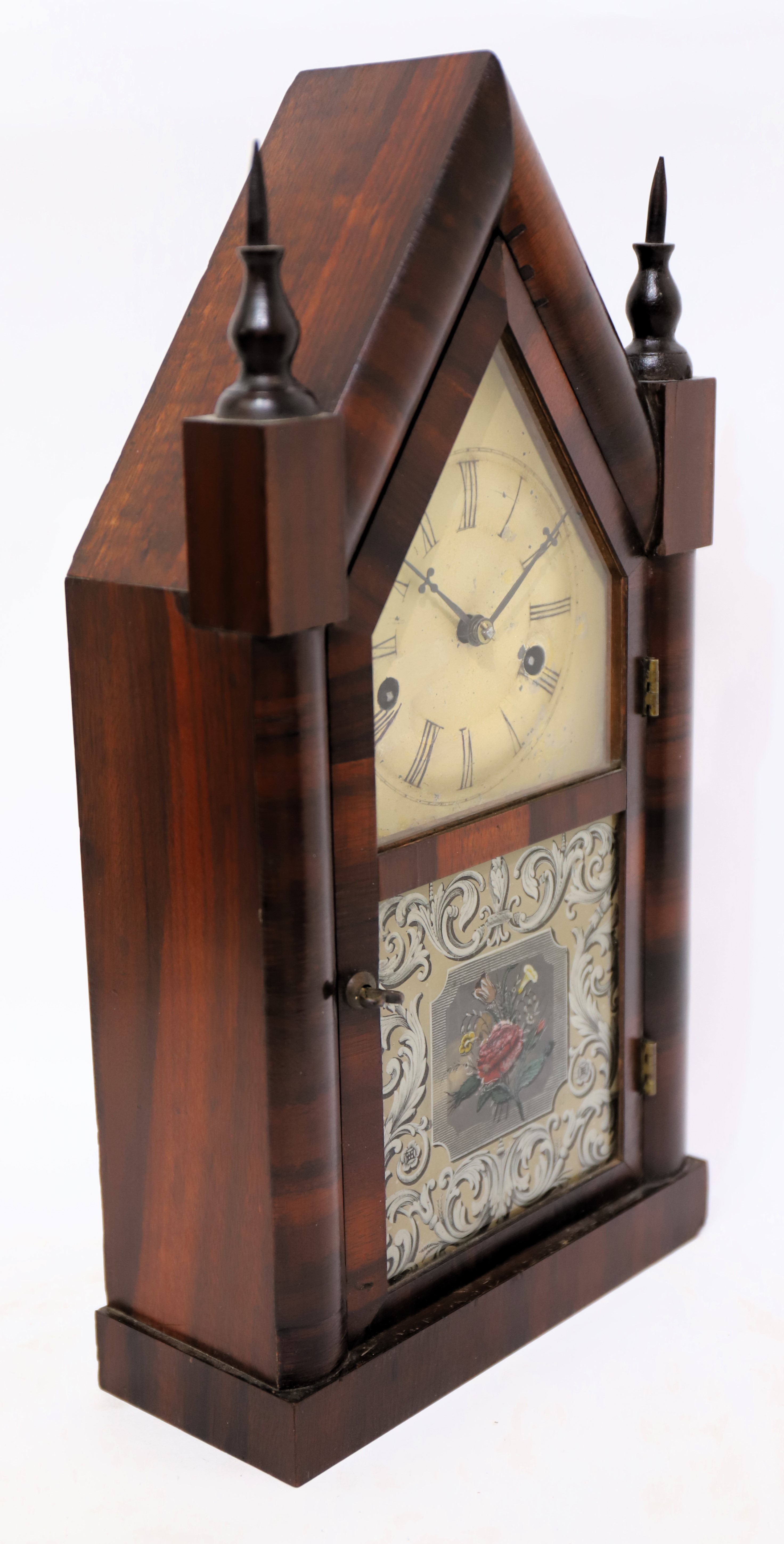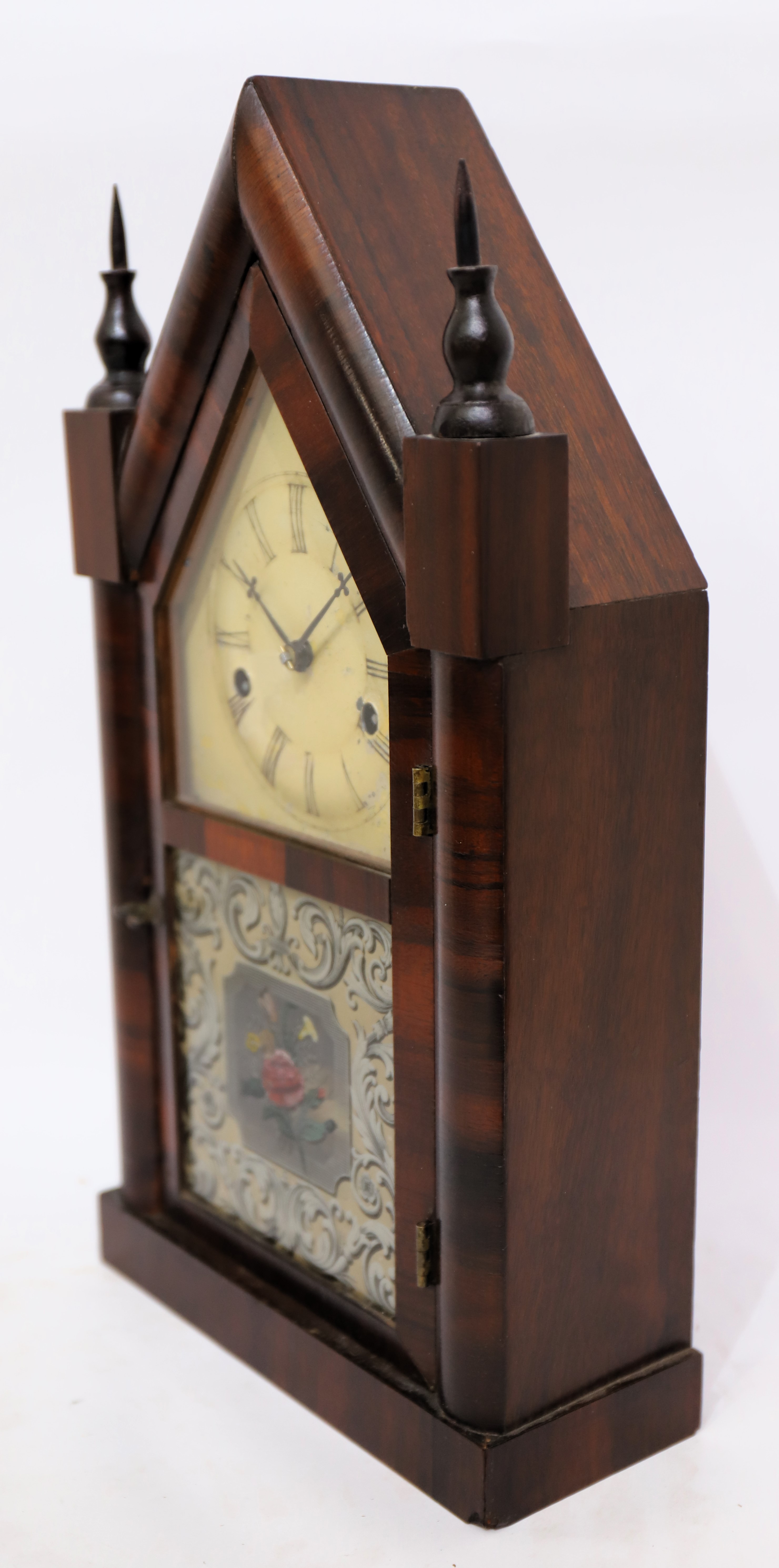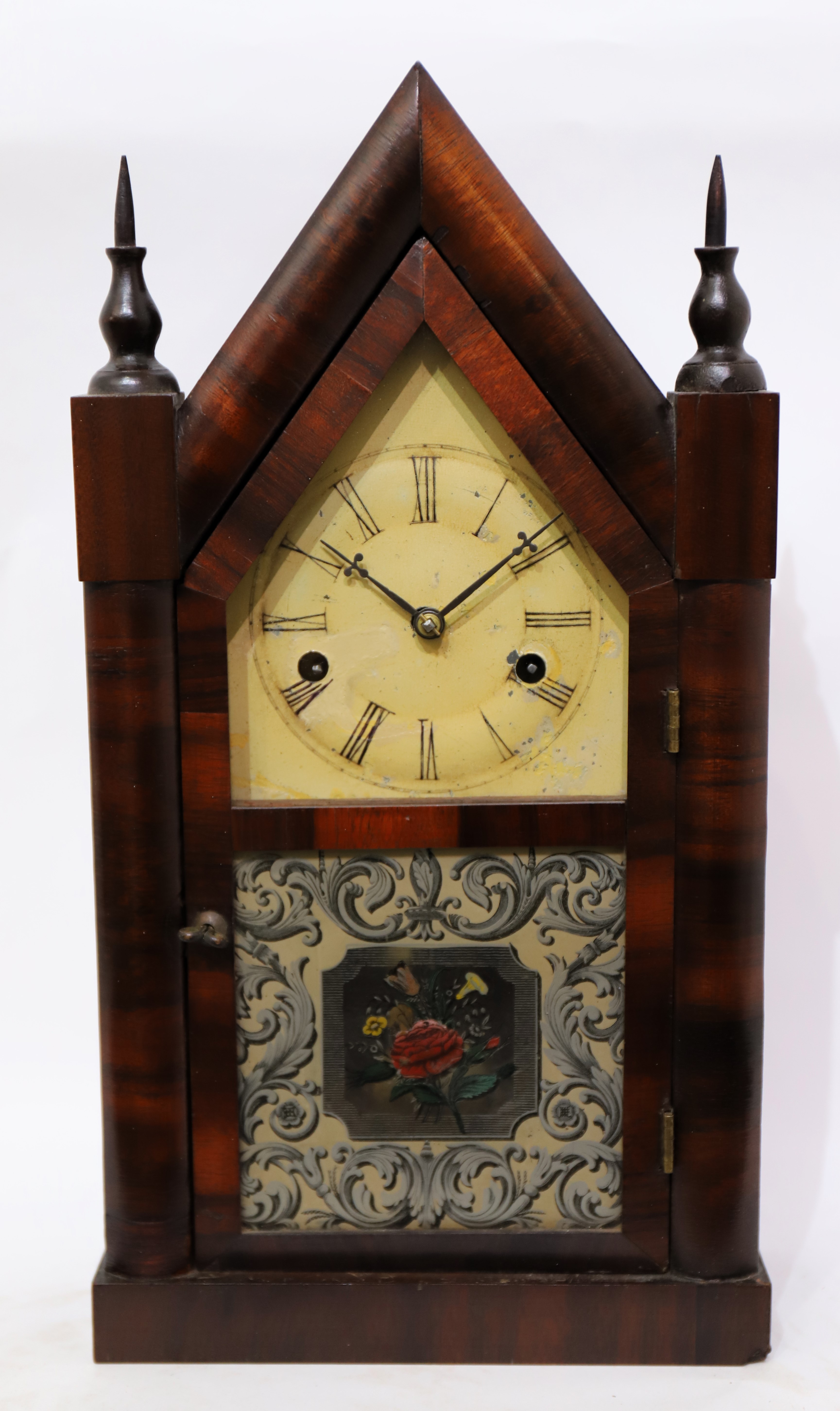 1842-1849. A 16-inch steeple with two period/original glasses and a well-preserved tablet; good rosewood veneer and finials. There are penciled notes on the back of the tablet. The dial is original with considerable touch-up. The hands are period. The 30-hour time-and-strike movement is signed J.C. Brown; it is running and striking. There is a good label inside. Miniature