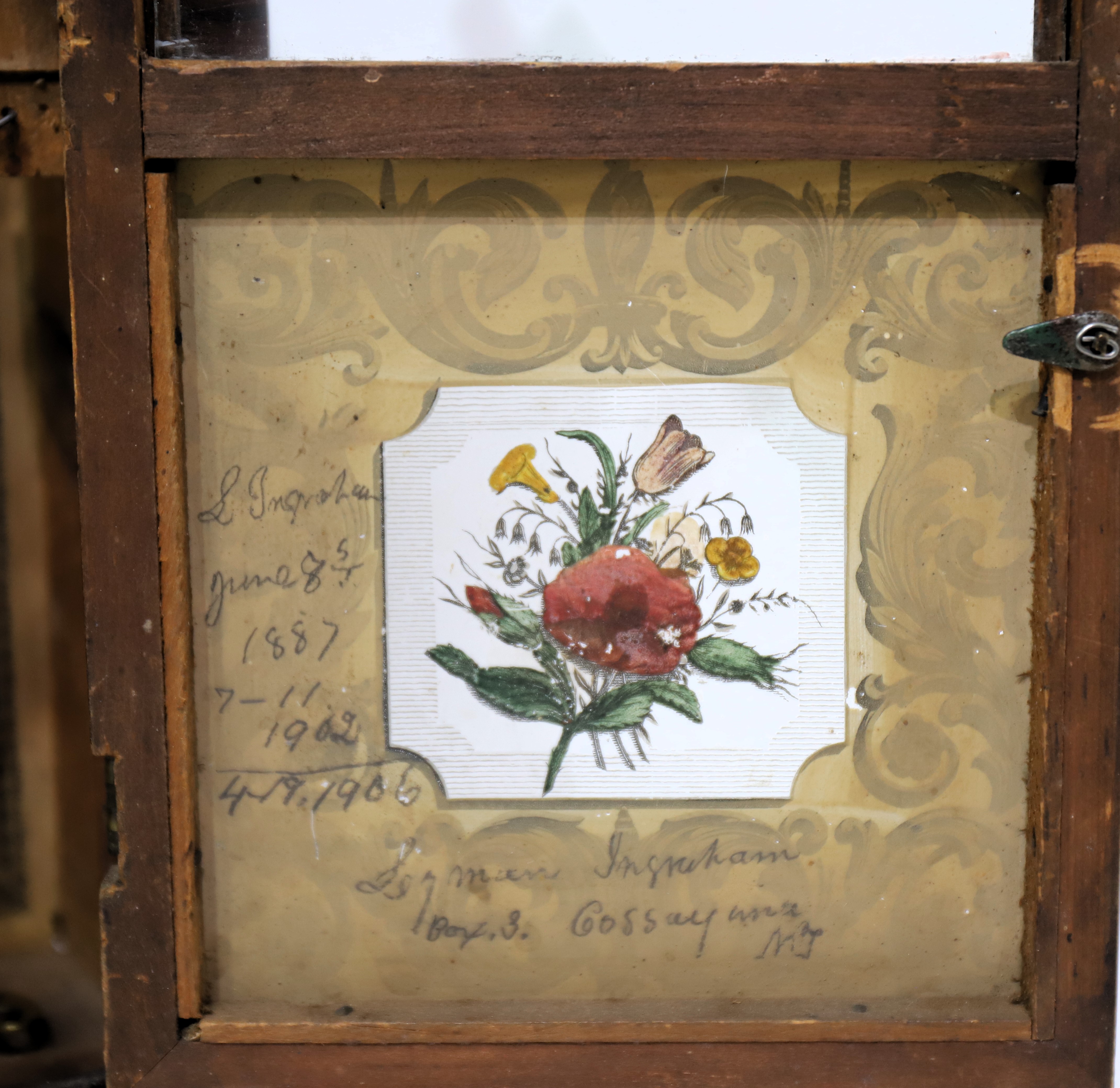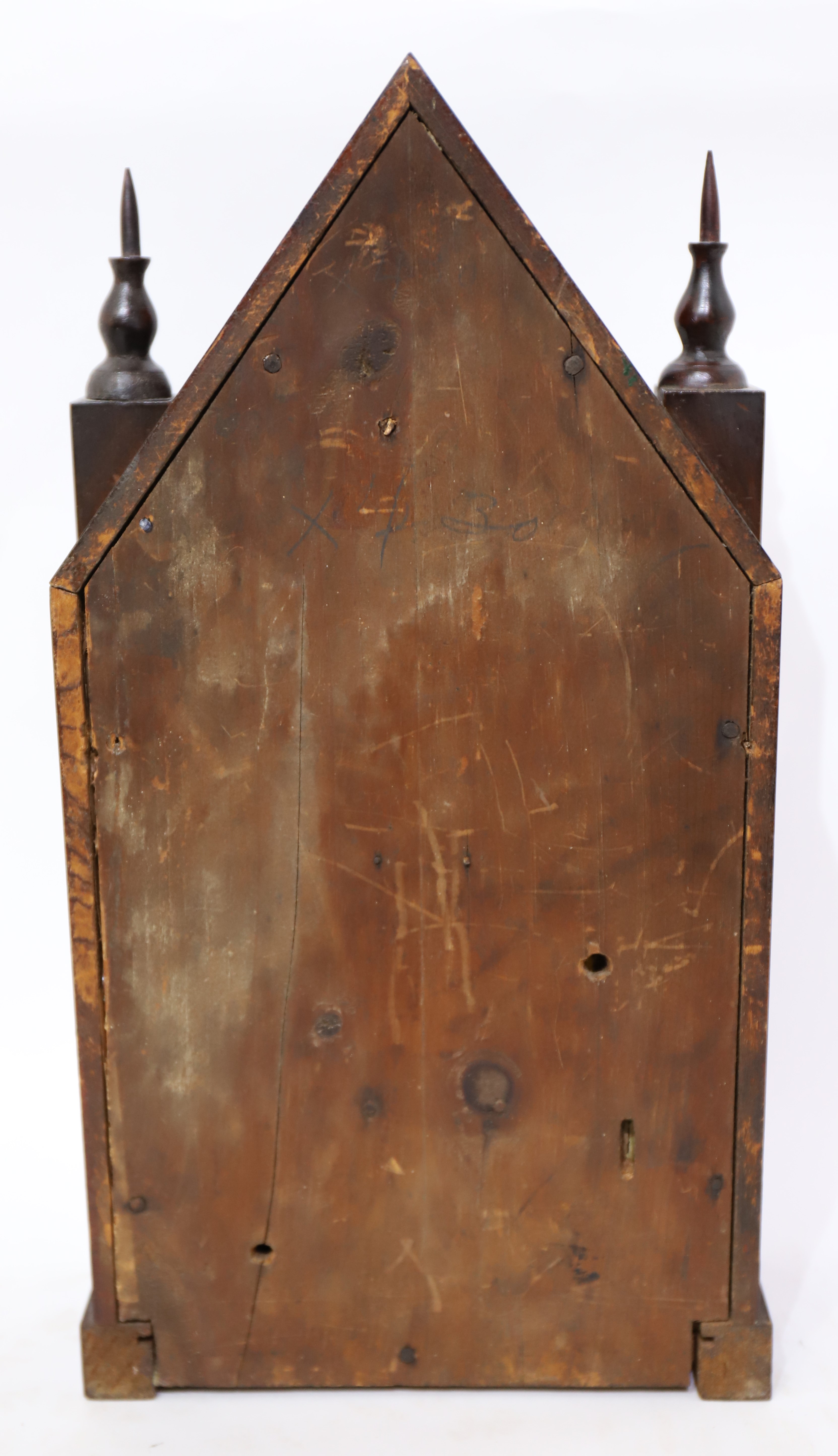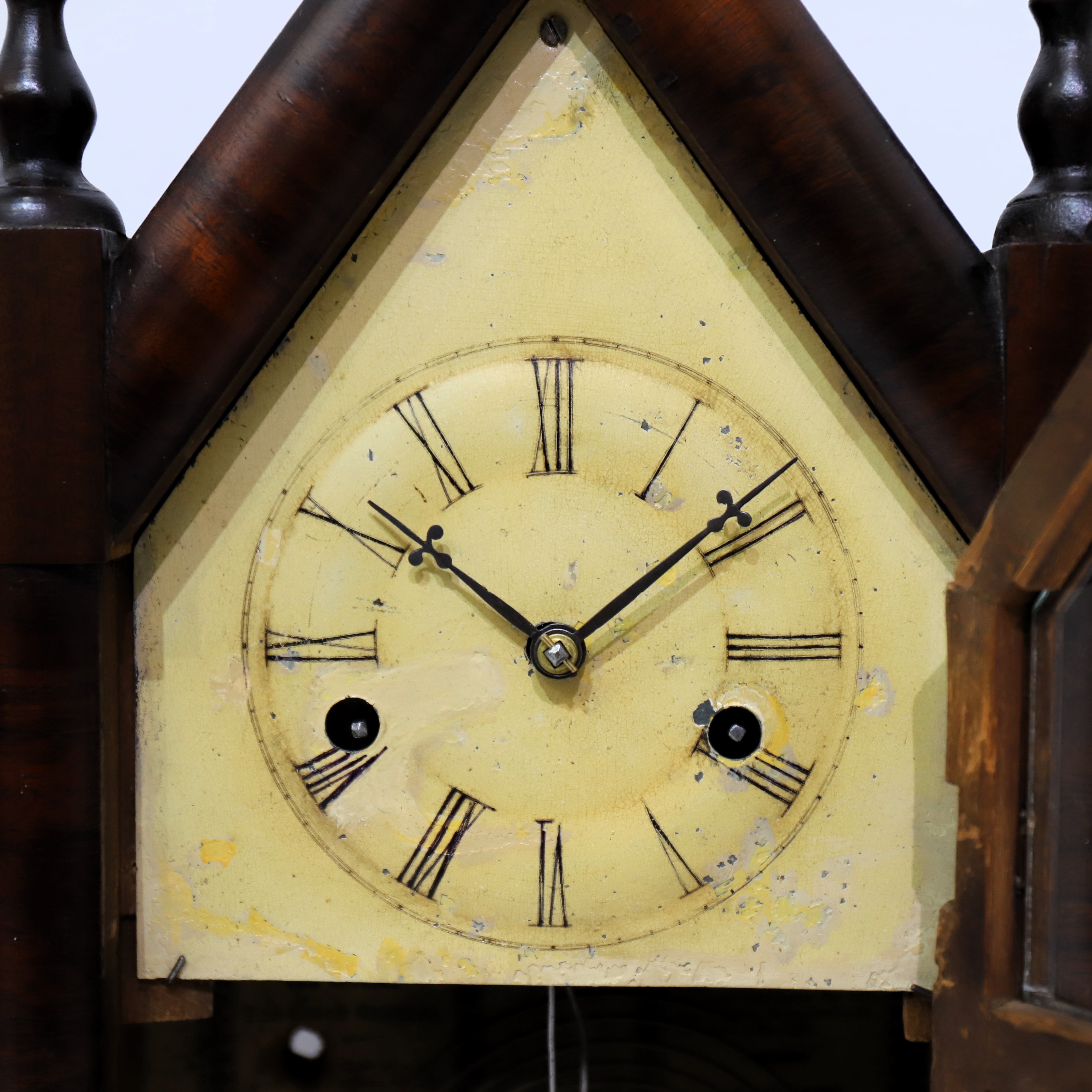 1842-1849. A 16-inch steeple with two period/original glasses and a well-preserved tablet; good rosewood veneer and finials. There are penciled notes on the back of the tablet. The dial is original with considerable touch-up. The hands are period. The 30-hour time-and-strike movement is signed J.C. Brown; it is running and striking. There is a good label inside. Miniature