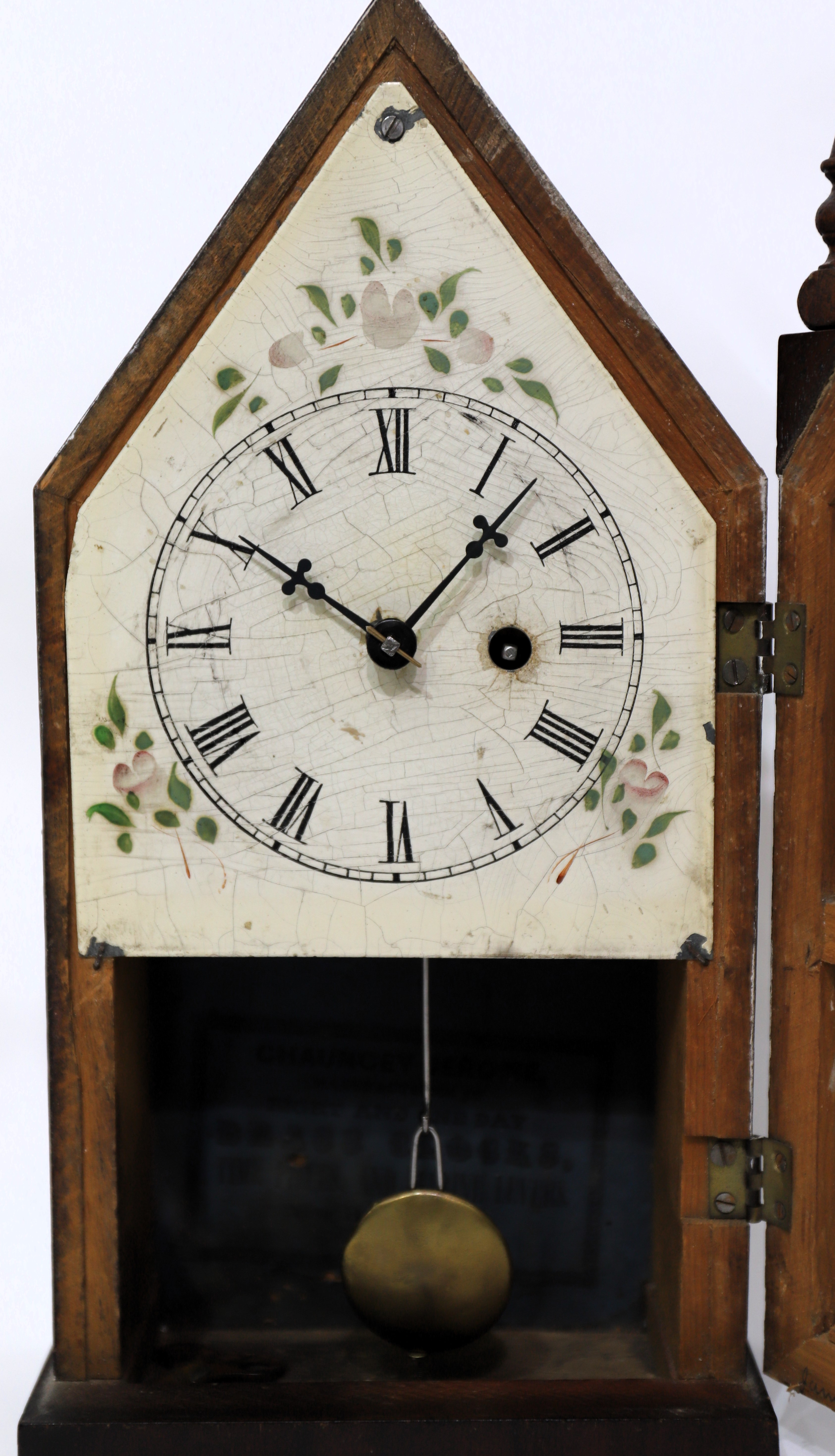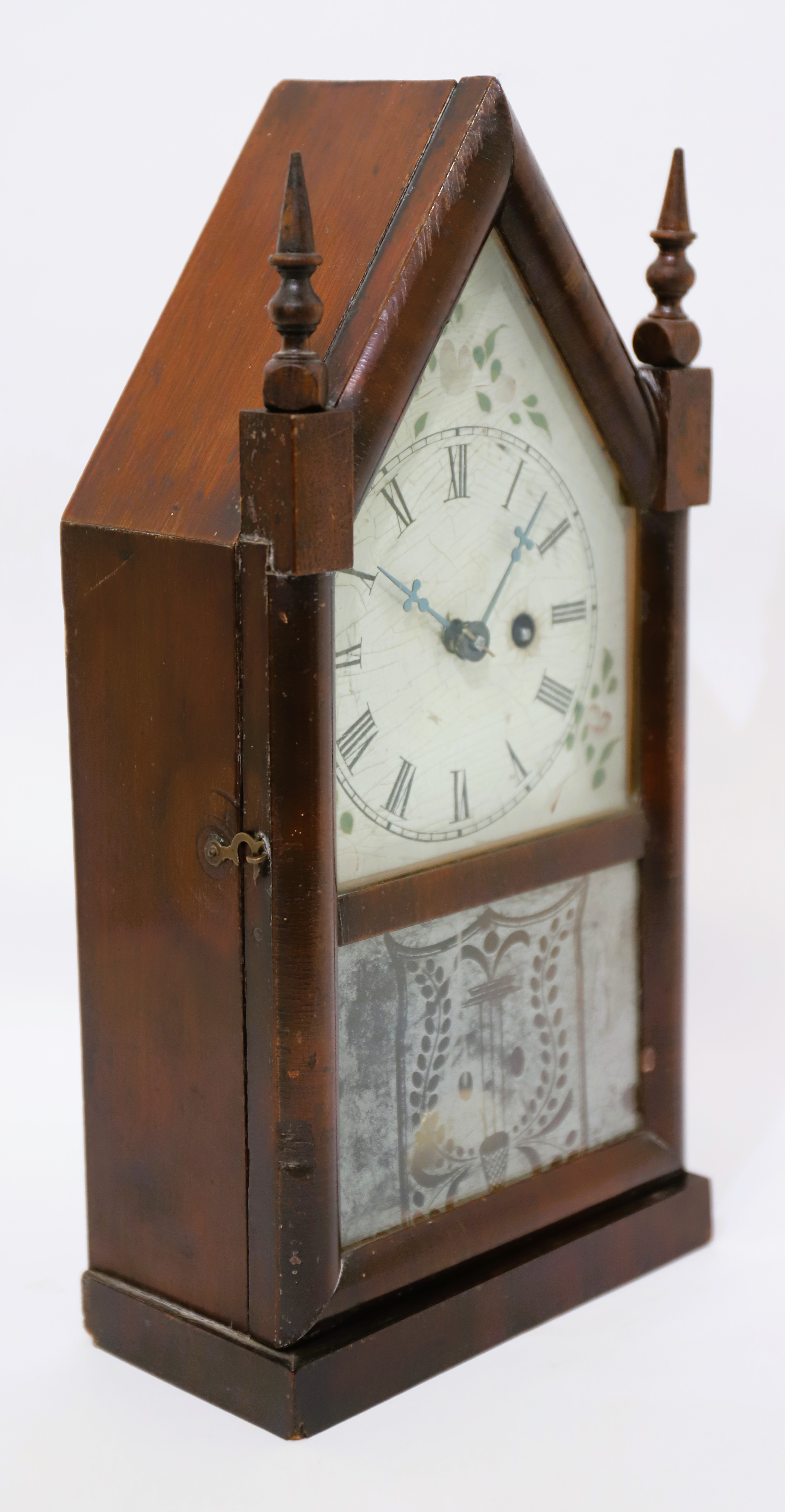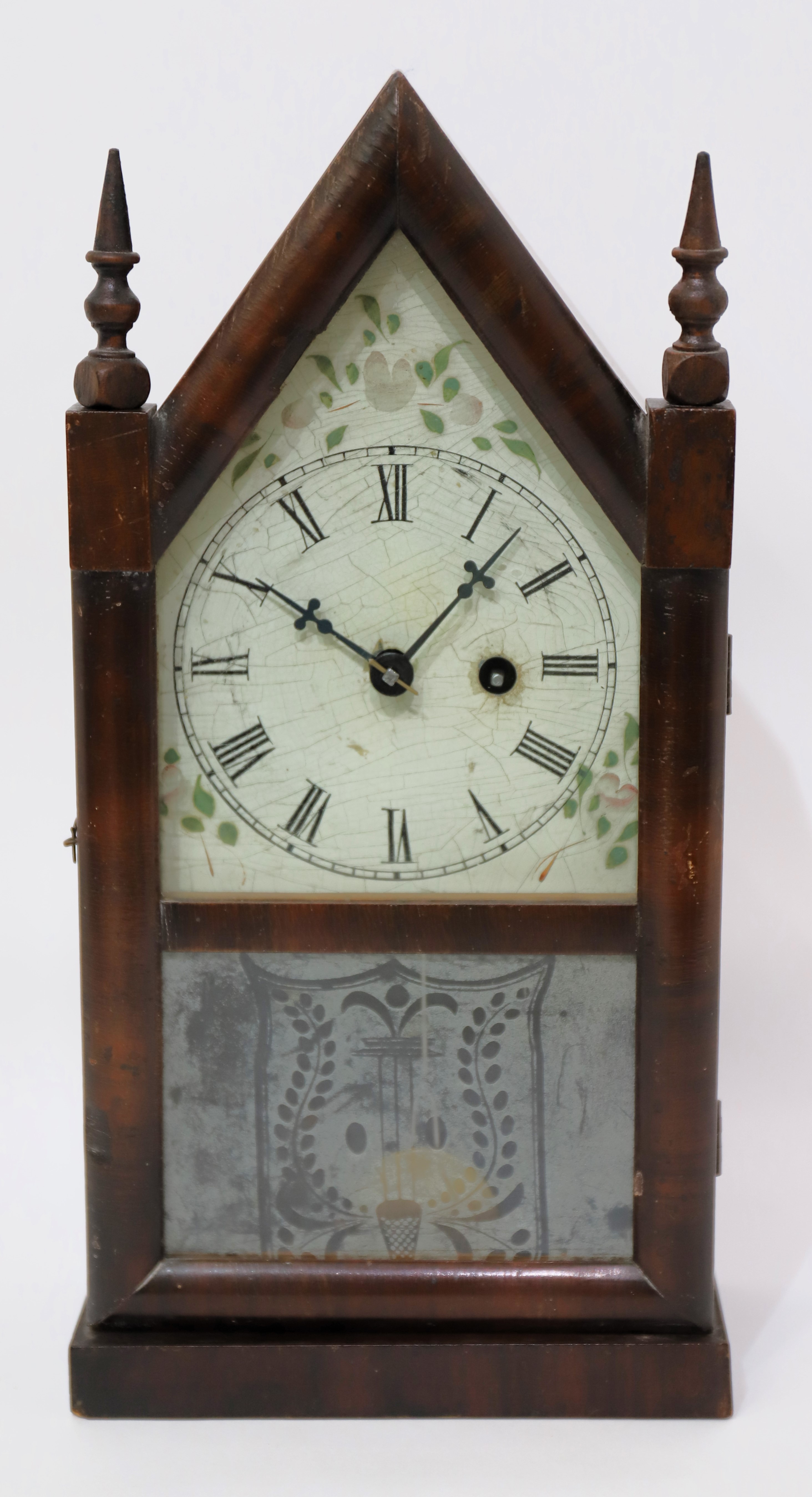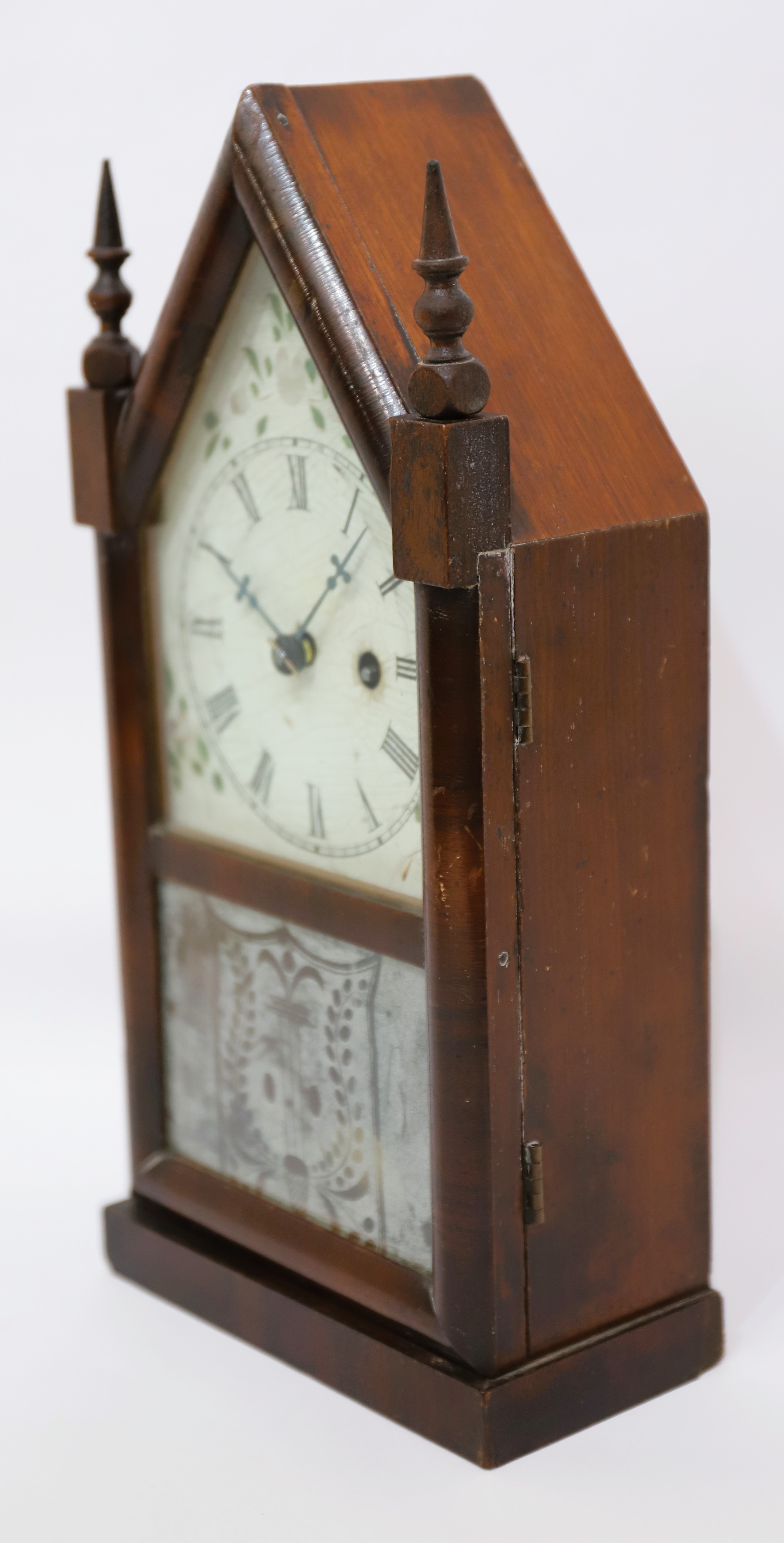 Chauncey Jerome sub-miniature steeple, ca. 1850. A 13-inch steeple with mahogany veneer and two period/original glasses. The milk glass tablet is well-preserved; the metal dial