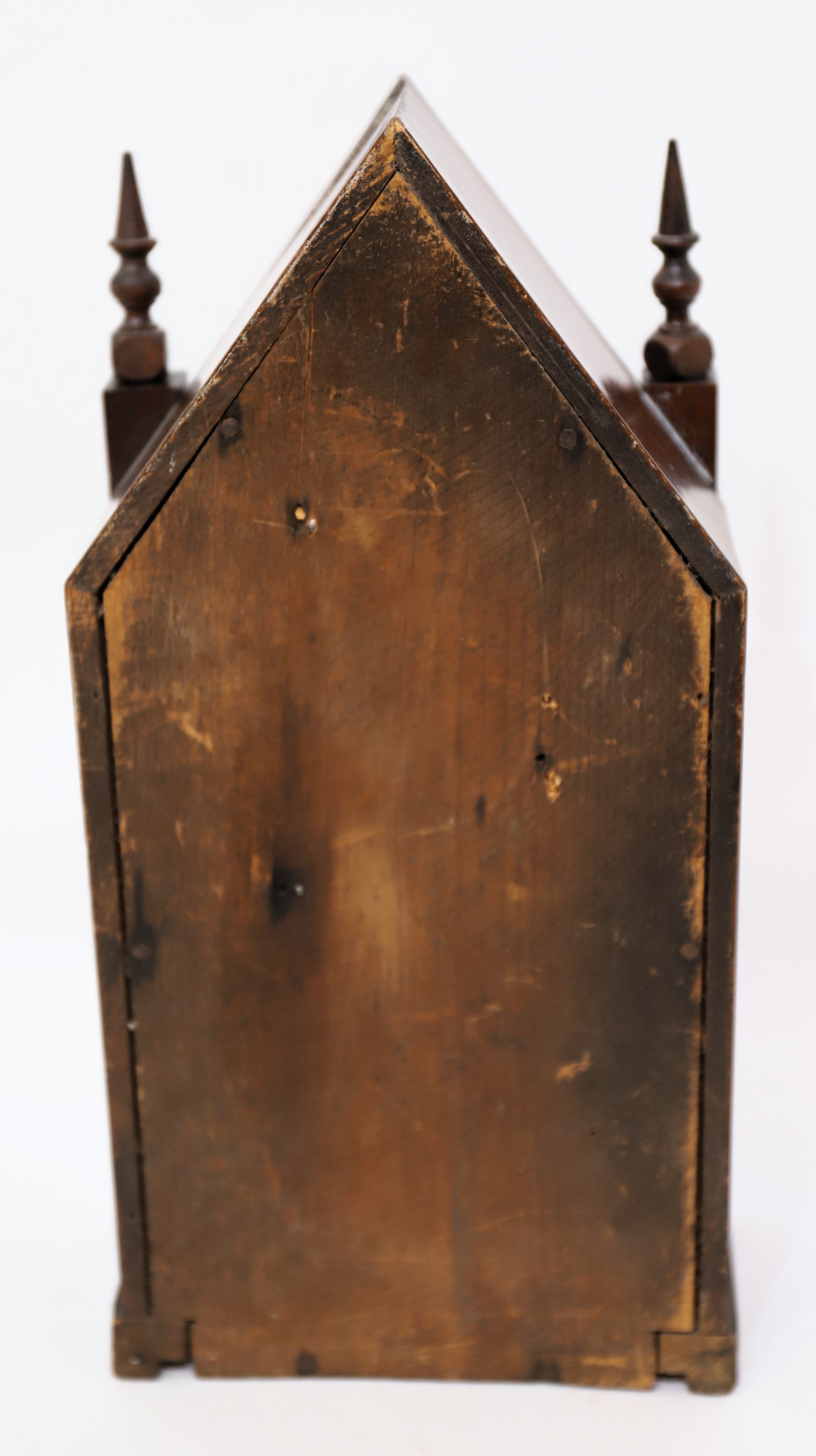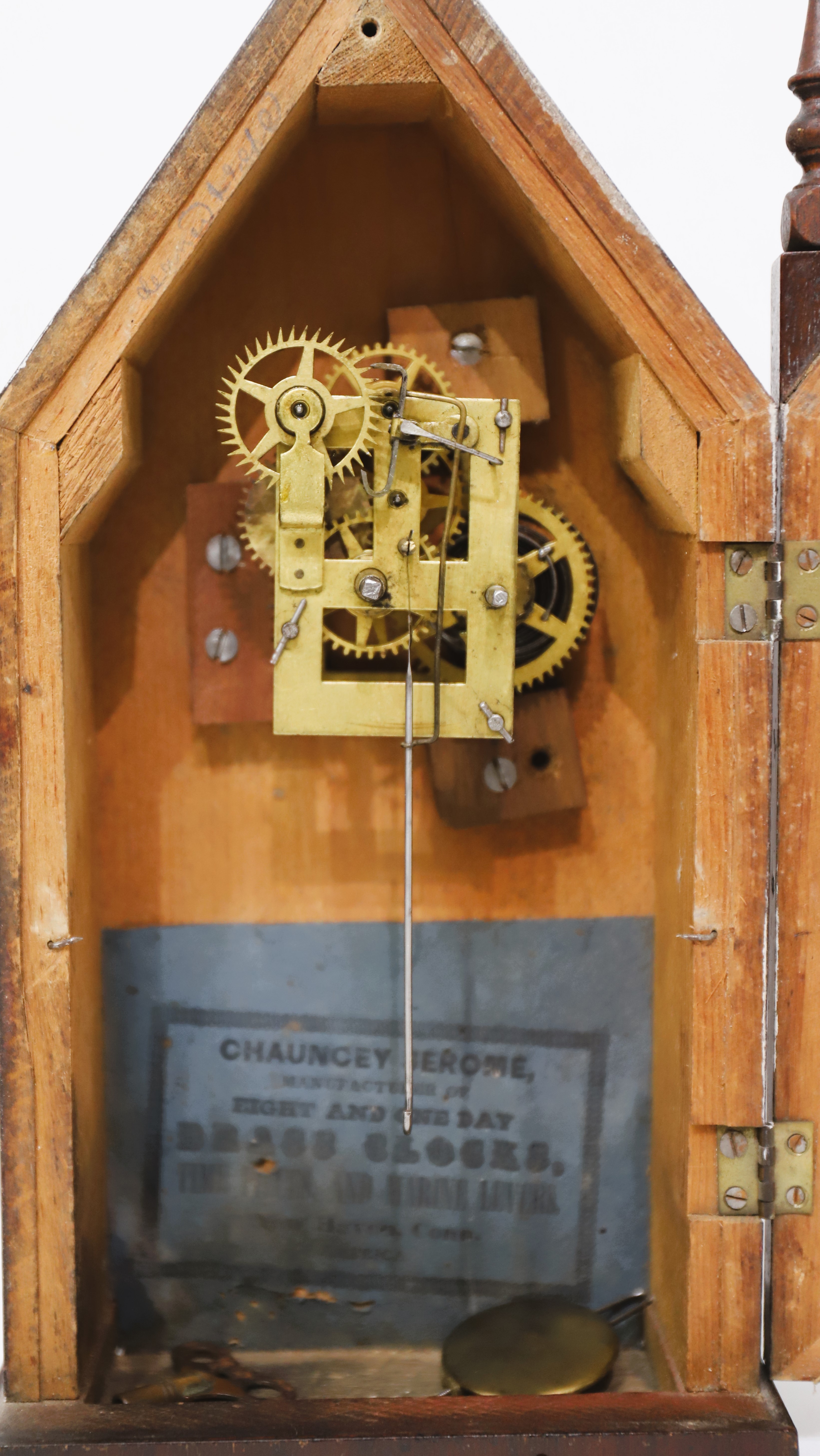the finials may not be original. The one-day time-only movement is unsigned, running like a champ. There is a green Jerome