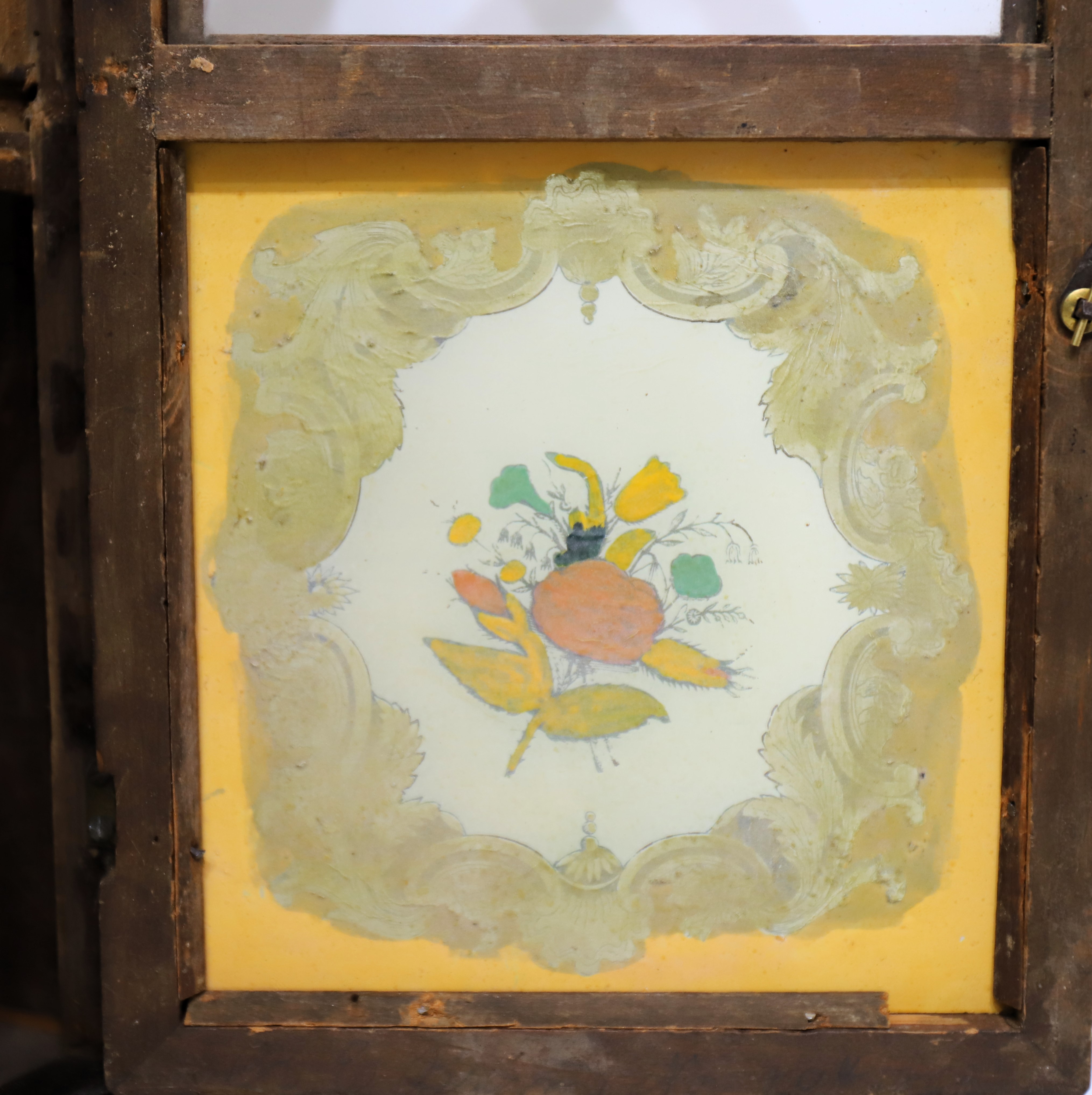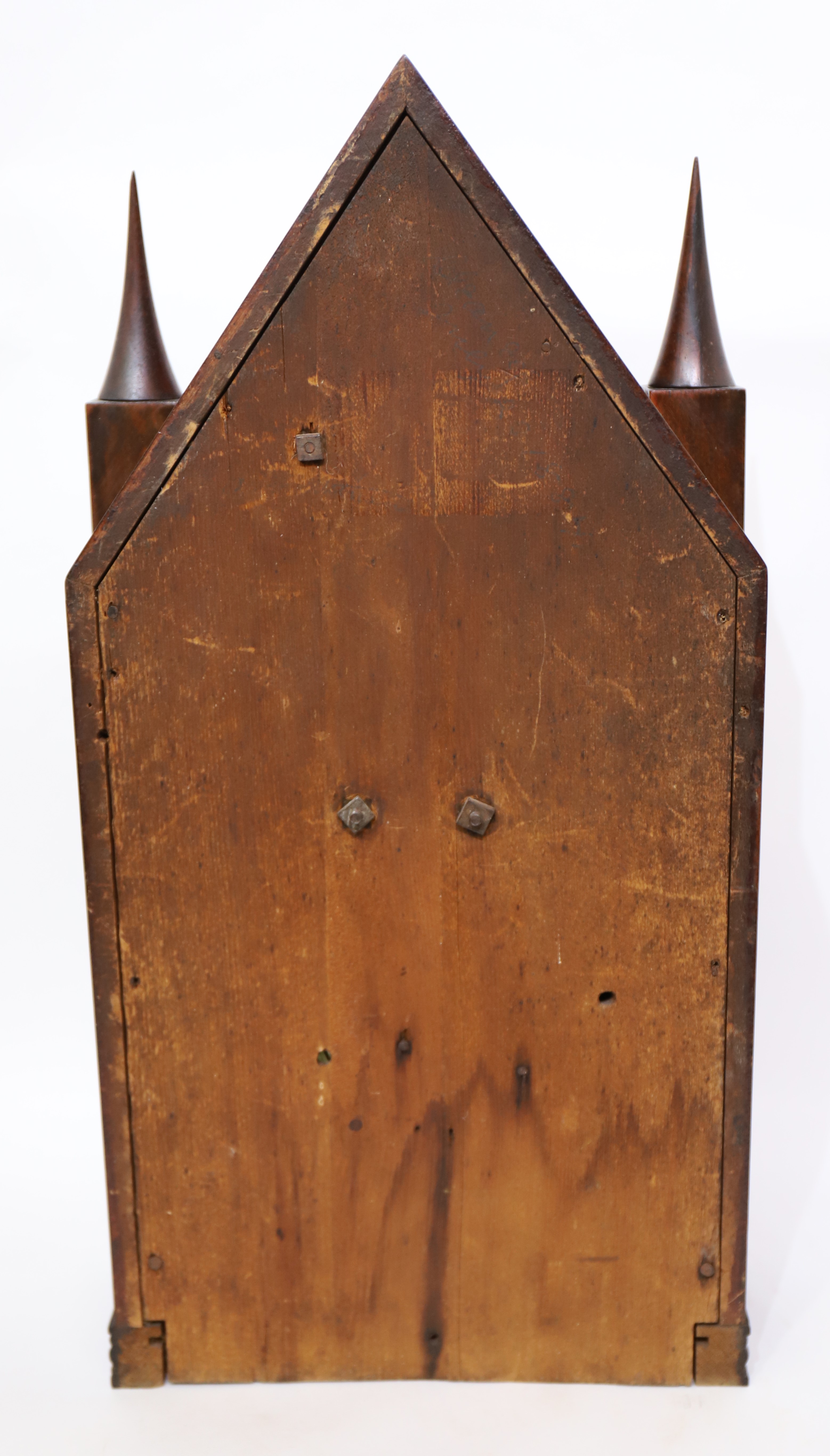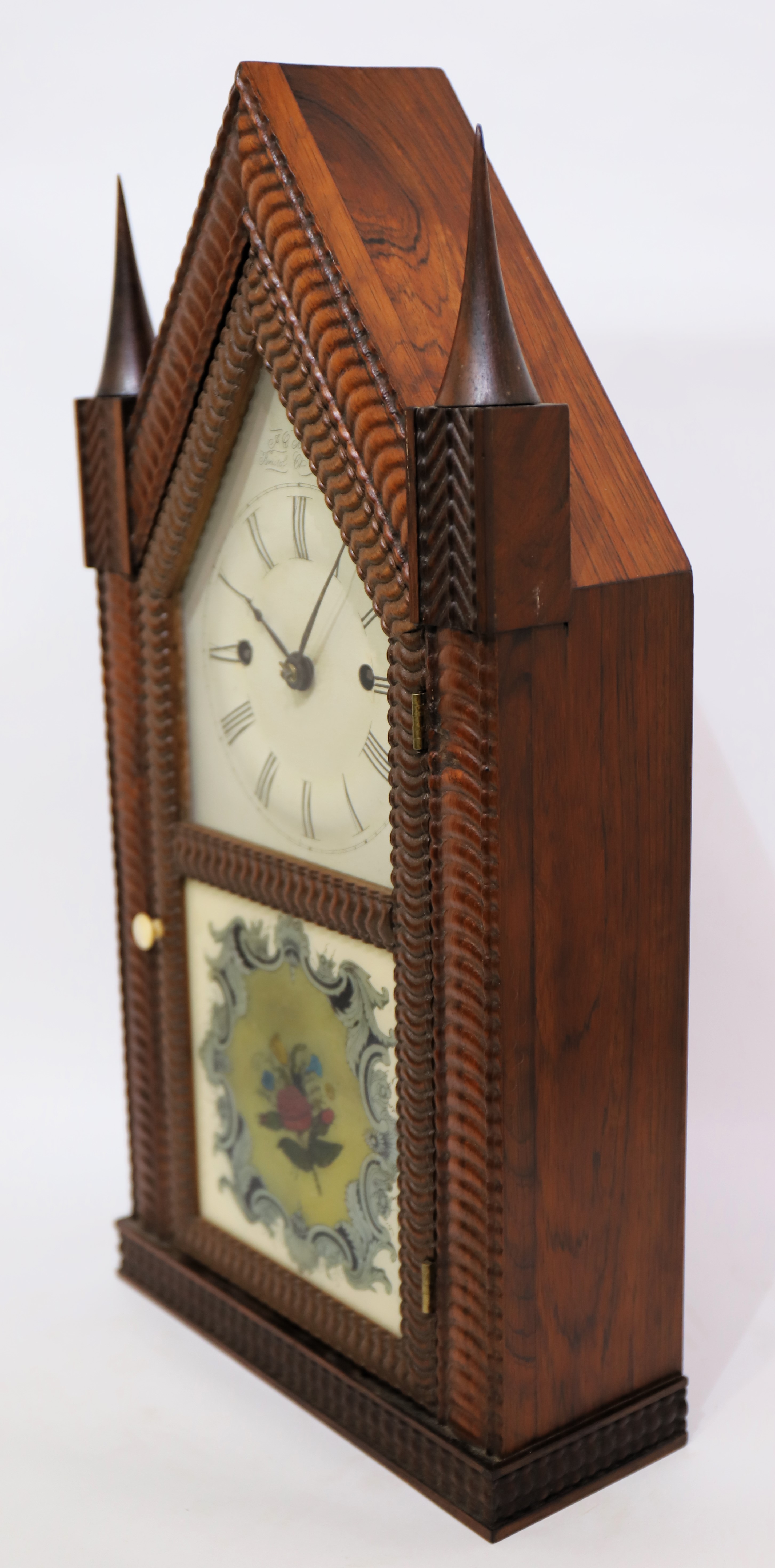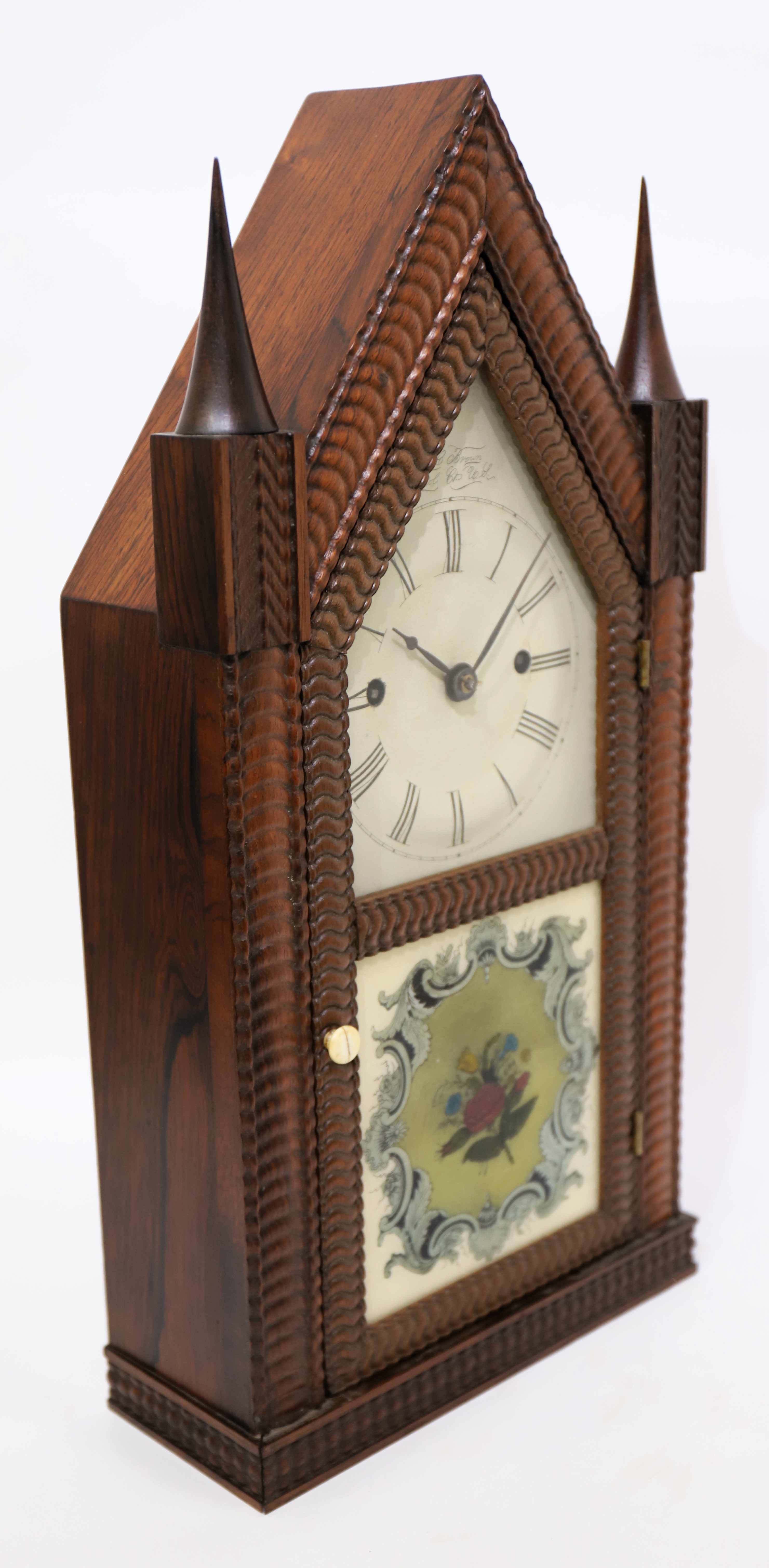 tall with rosewood veneer, ripple trim, and original spire finials. Both glasses are old but I believe the tablet has been repainted
