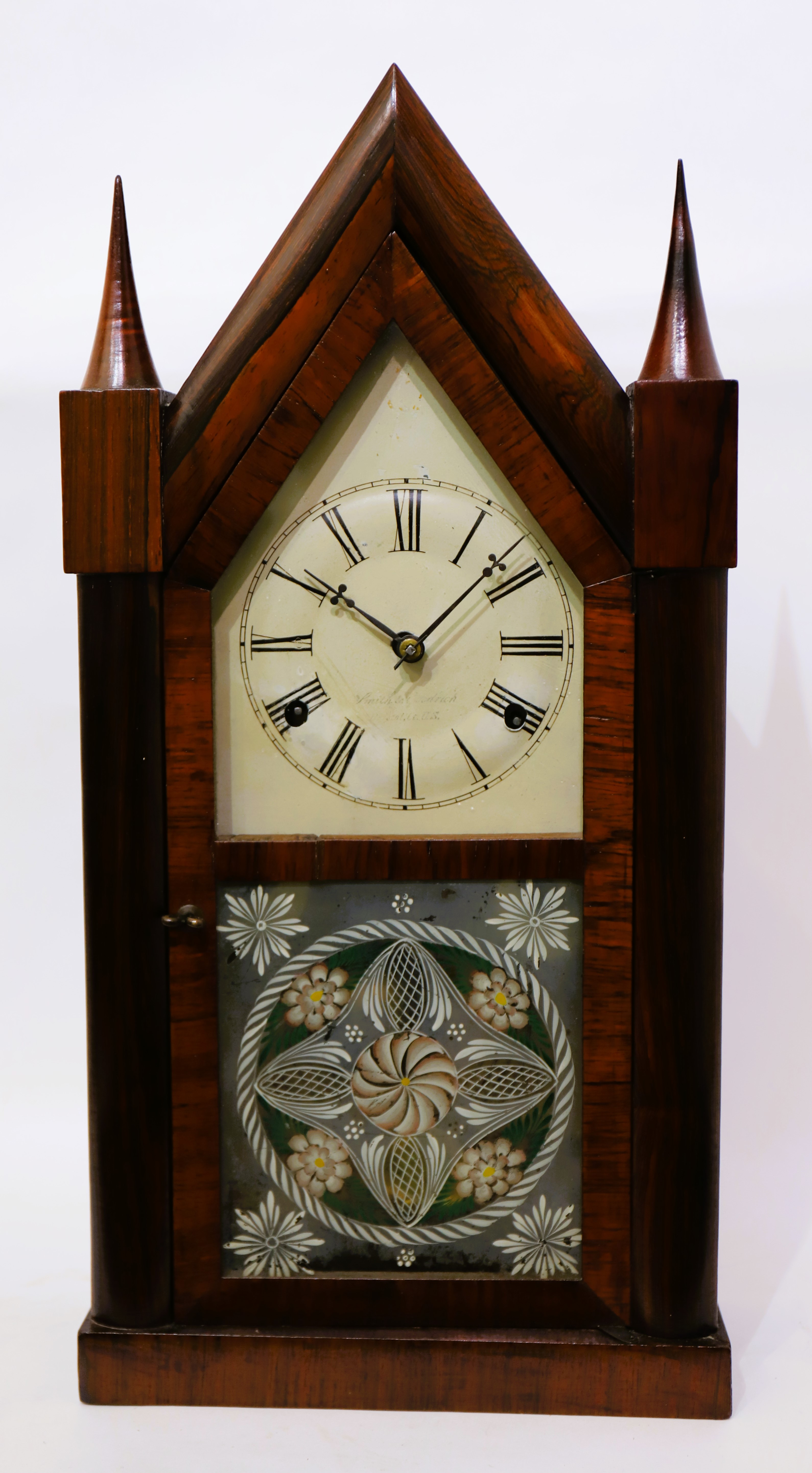 1847-1852. A 20-inch sharp gothic in a beautiful rosewood and mahogany case with two likely original glasses and a very well-preserved