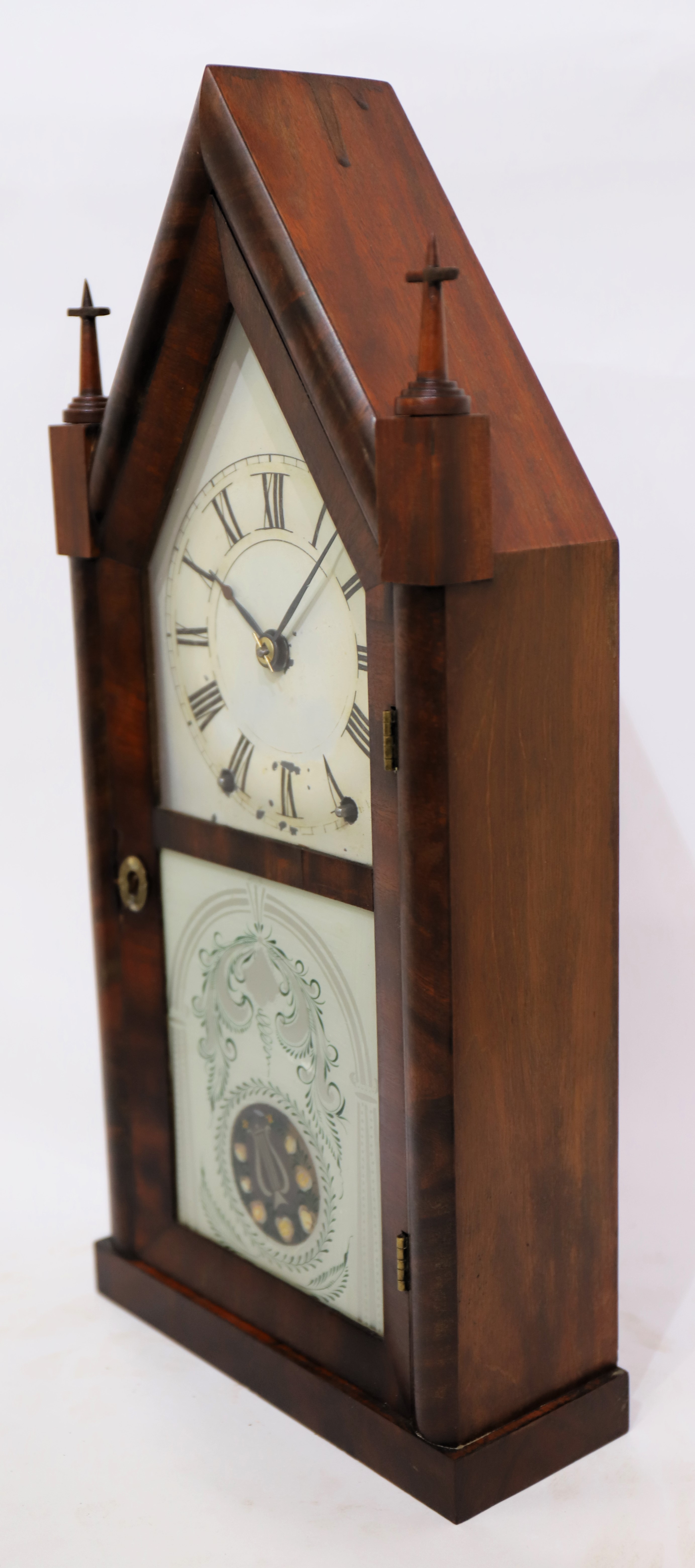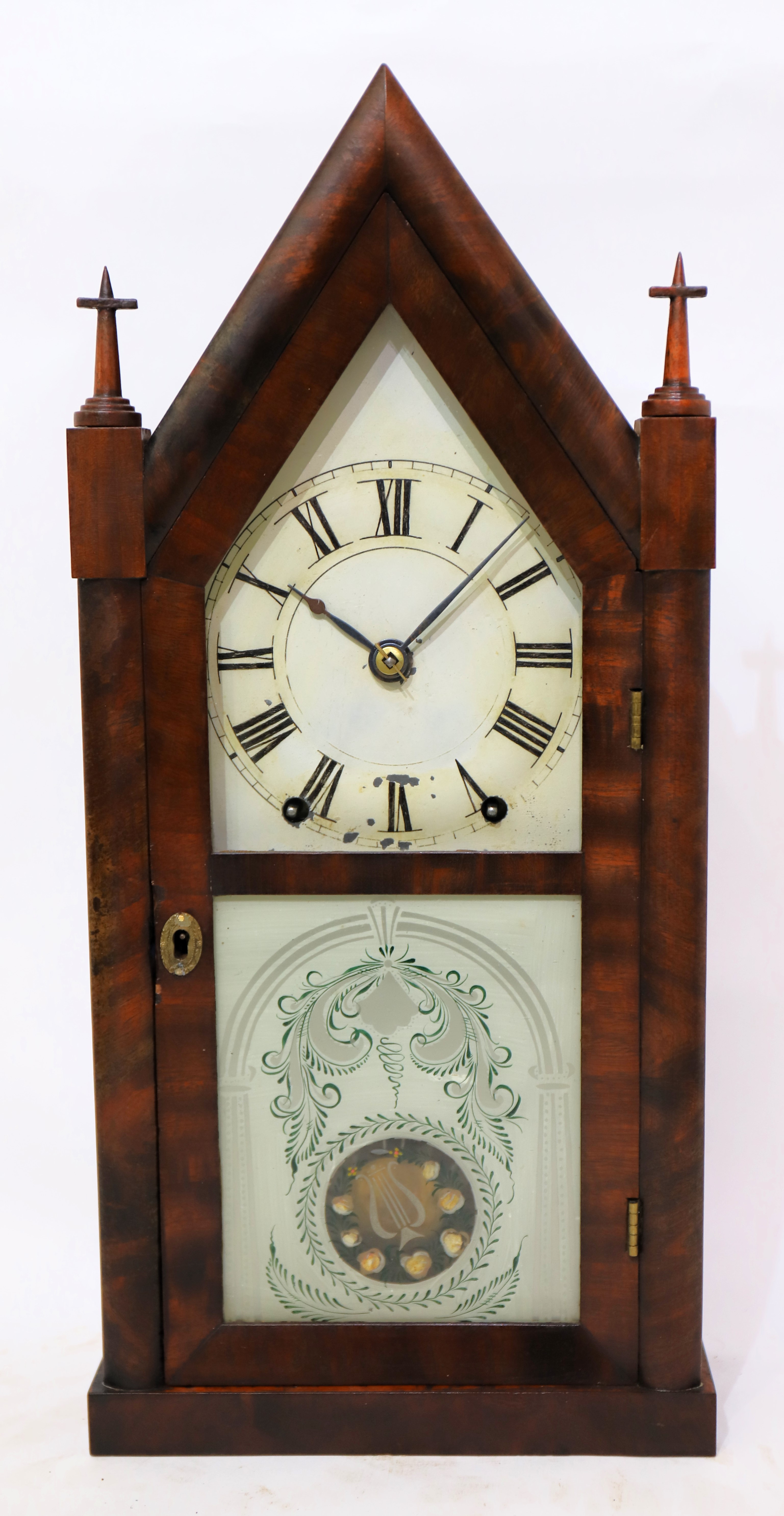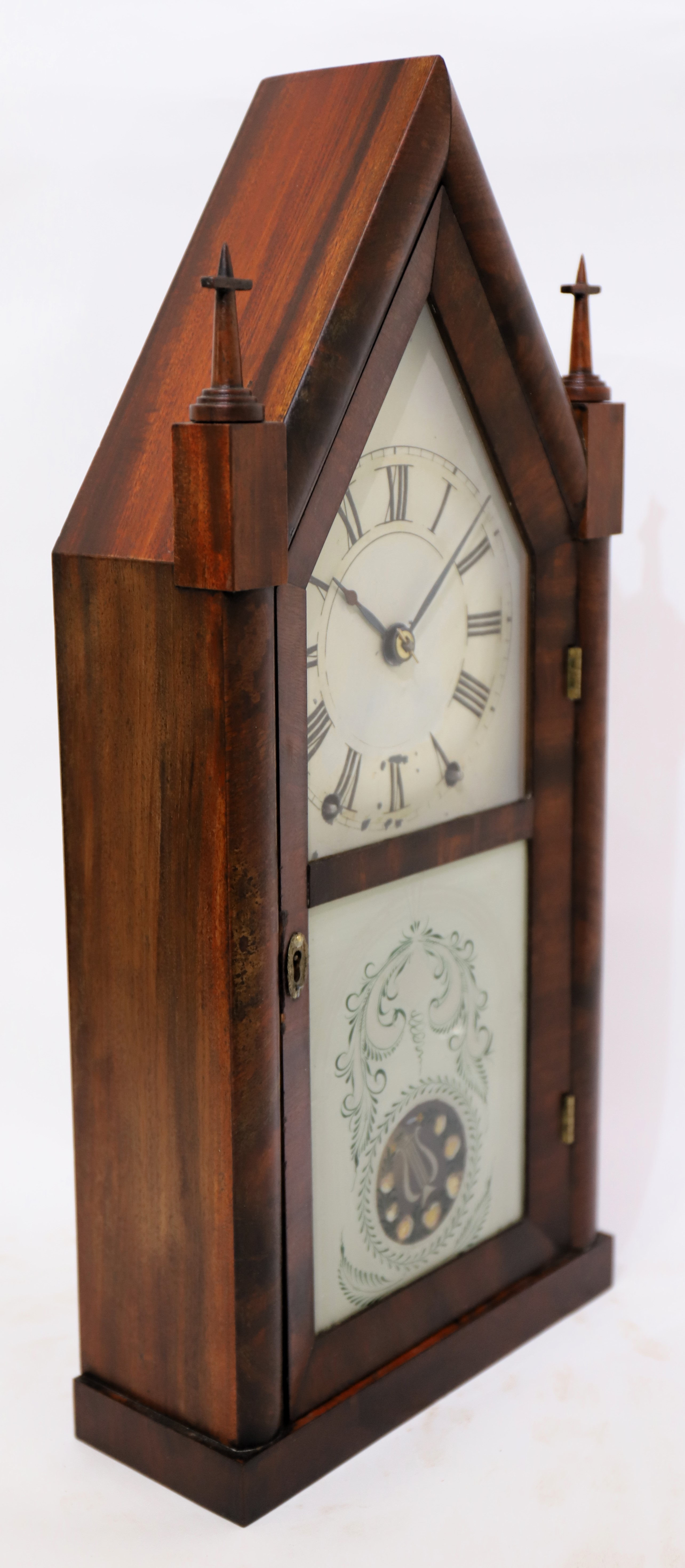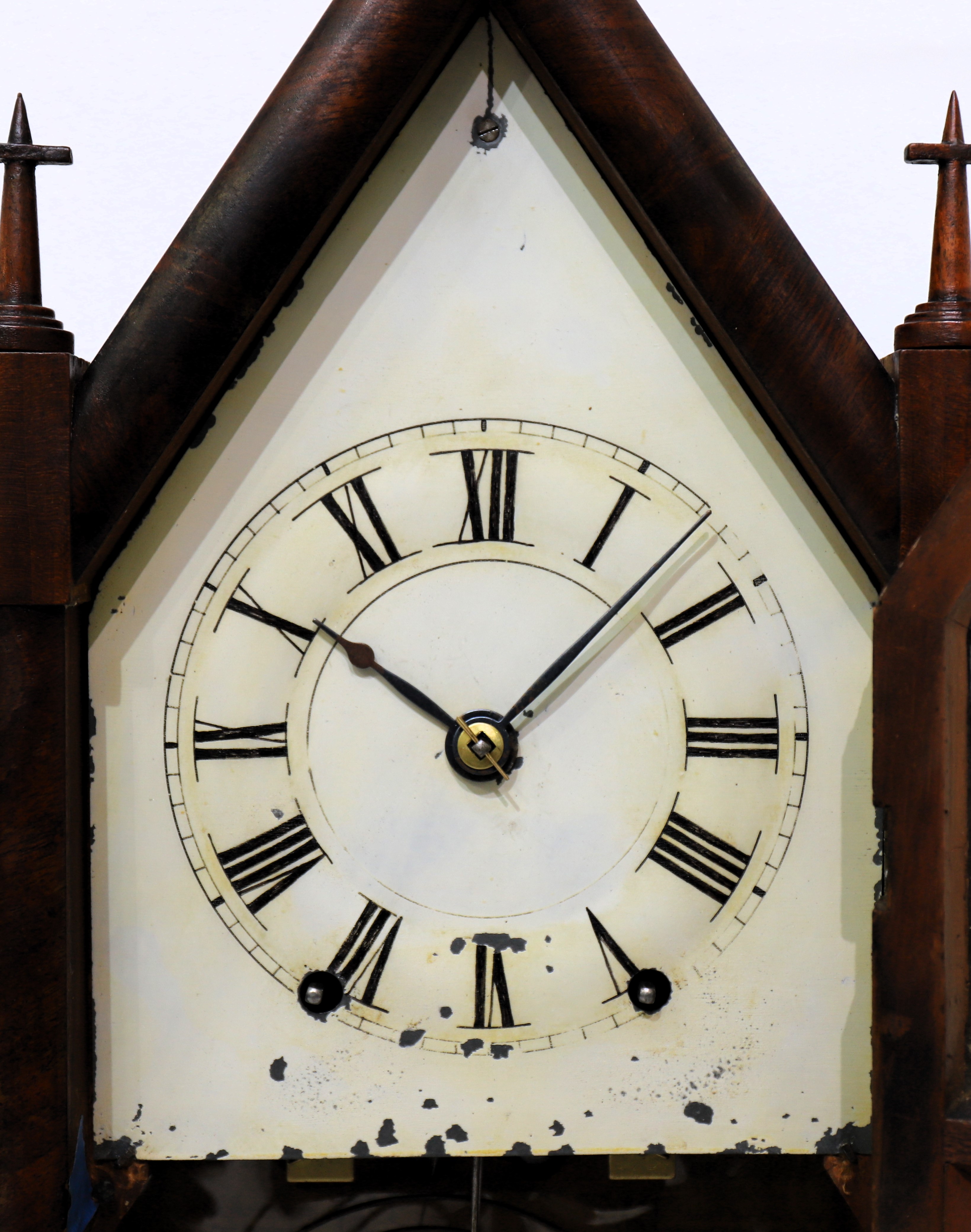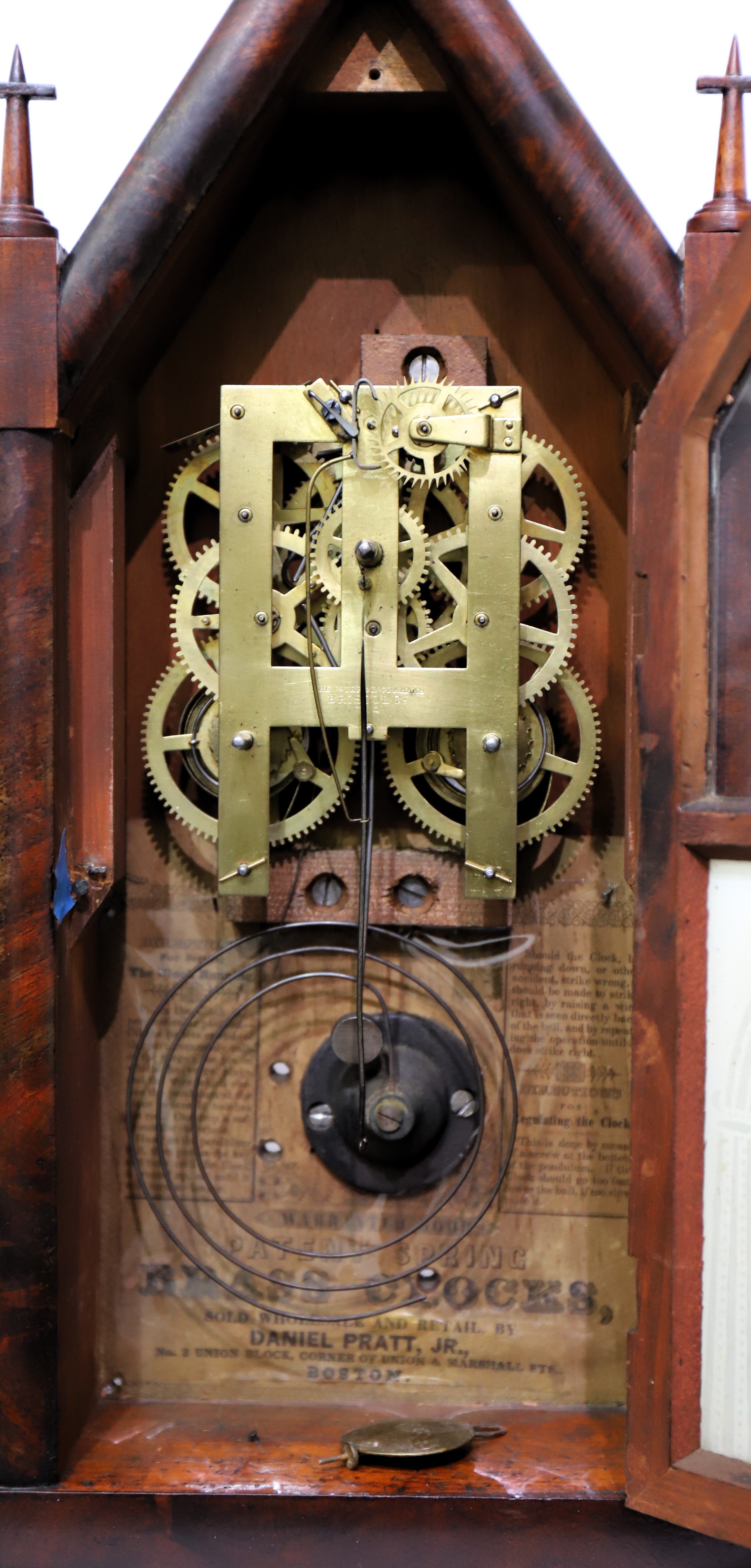 on a wire gong; note the brass springs. There is a good label inside with a Daniel Pratt, Jr over-paste as the retailer in Boston. This is a nice example of a rare clock; AAC sold a similar example in 2022 for $379. $250–$400.