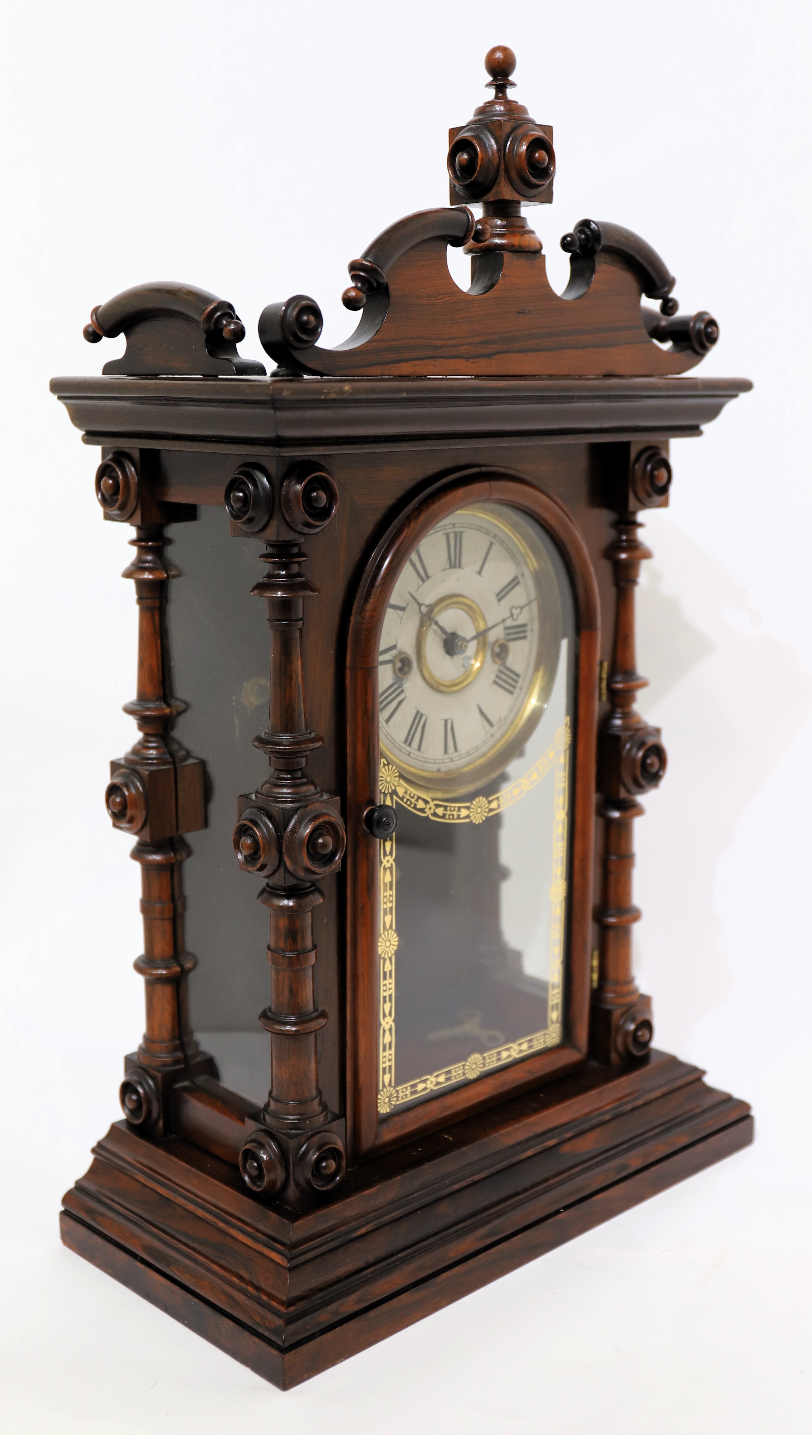 20.5-inch polished rosewood case with three original glasses. I see no damage or missing ornaments. The painted dial has