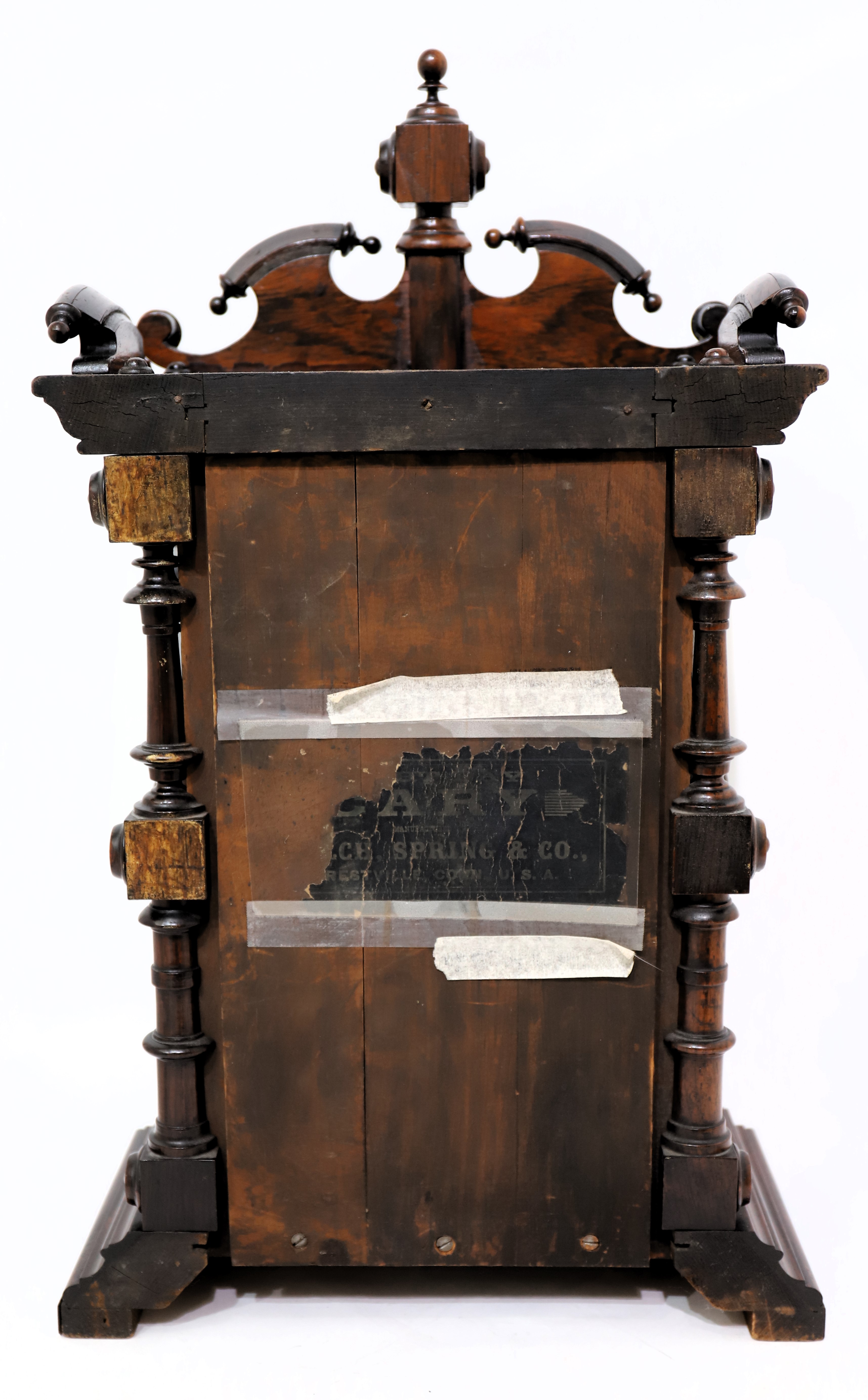 movements. The 8-day, time-and-strike Patti movement is running but the strike is misbehaving and will need attention. There is a sandwich-glass pendulum. A label is preserved behind plastic on the back. Schmitt Horan sold one last spring