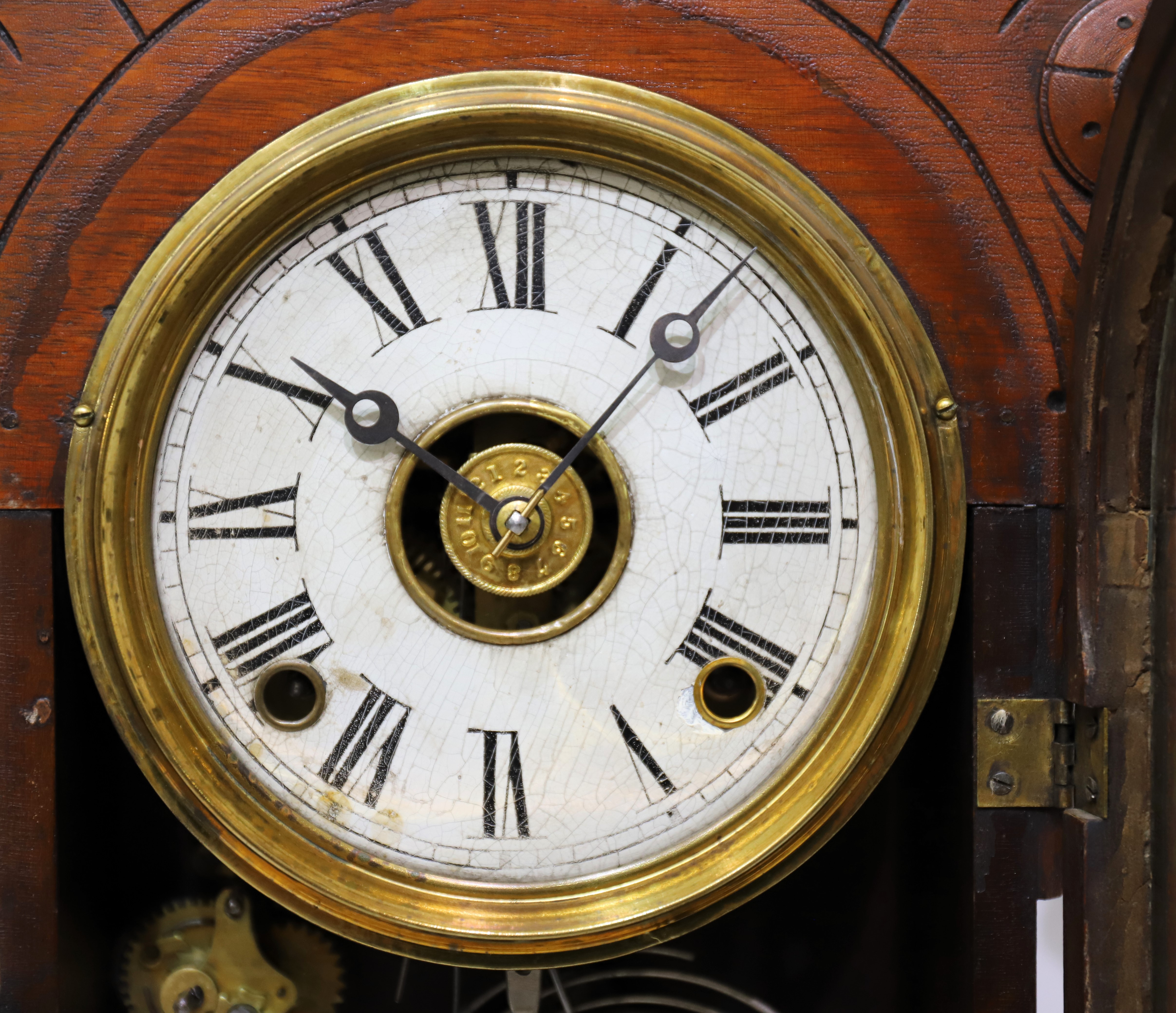 walnut case with an old finish and some patina, made for the Colby Wringer Co. of Vermont. The door glass is original with good