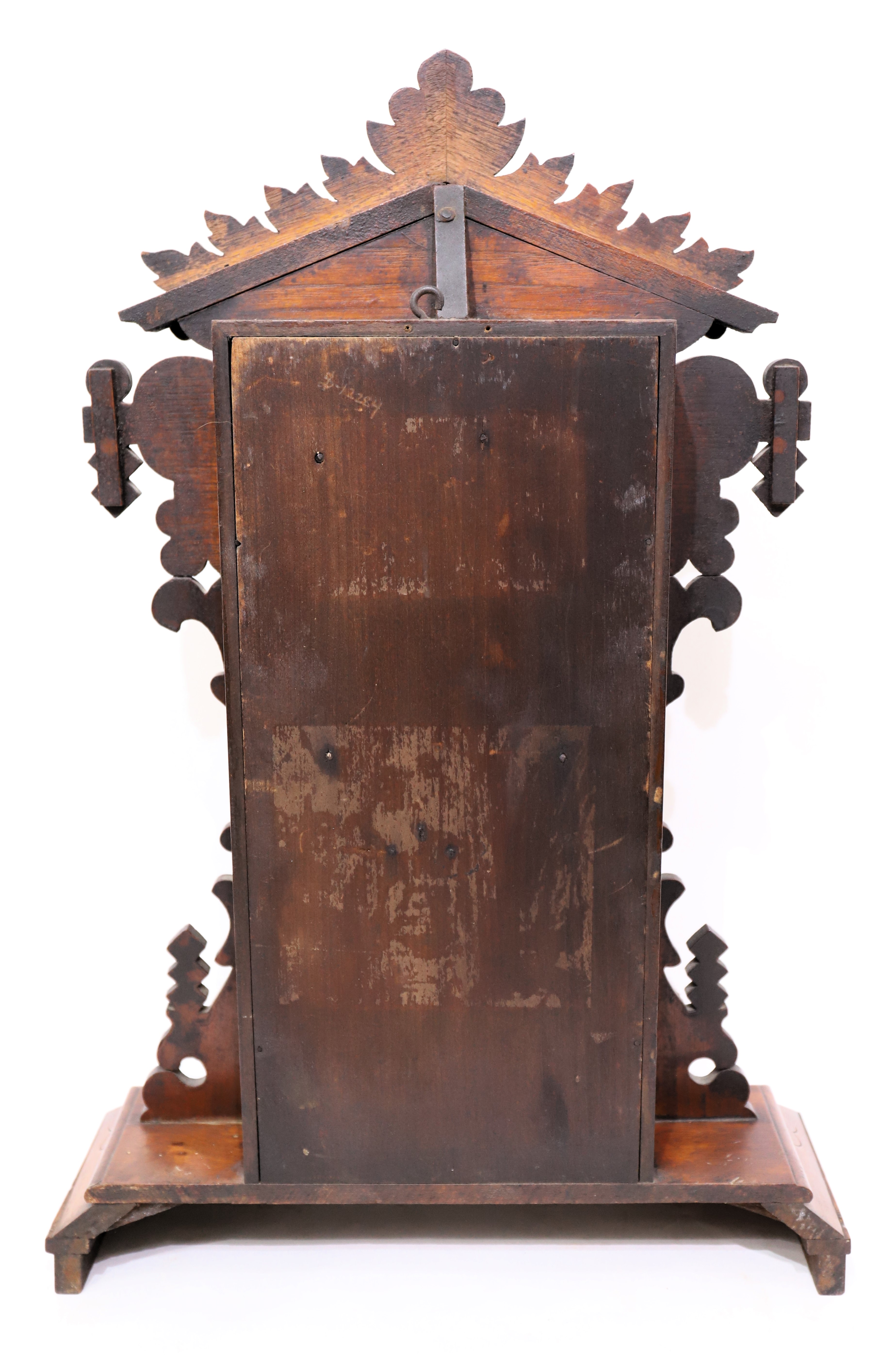 and half-hour strike movement is running and striking on a wire gong, regulated by a Colby Wringer-signed sandwich glass pendulum. The labels on the back have been lost. The wall version of this model is #216. I can find no sales records for this shelf