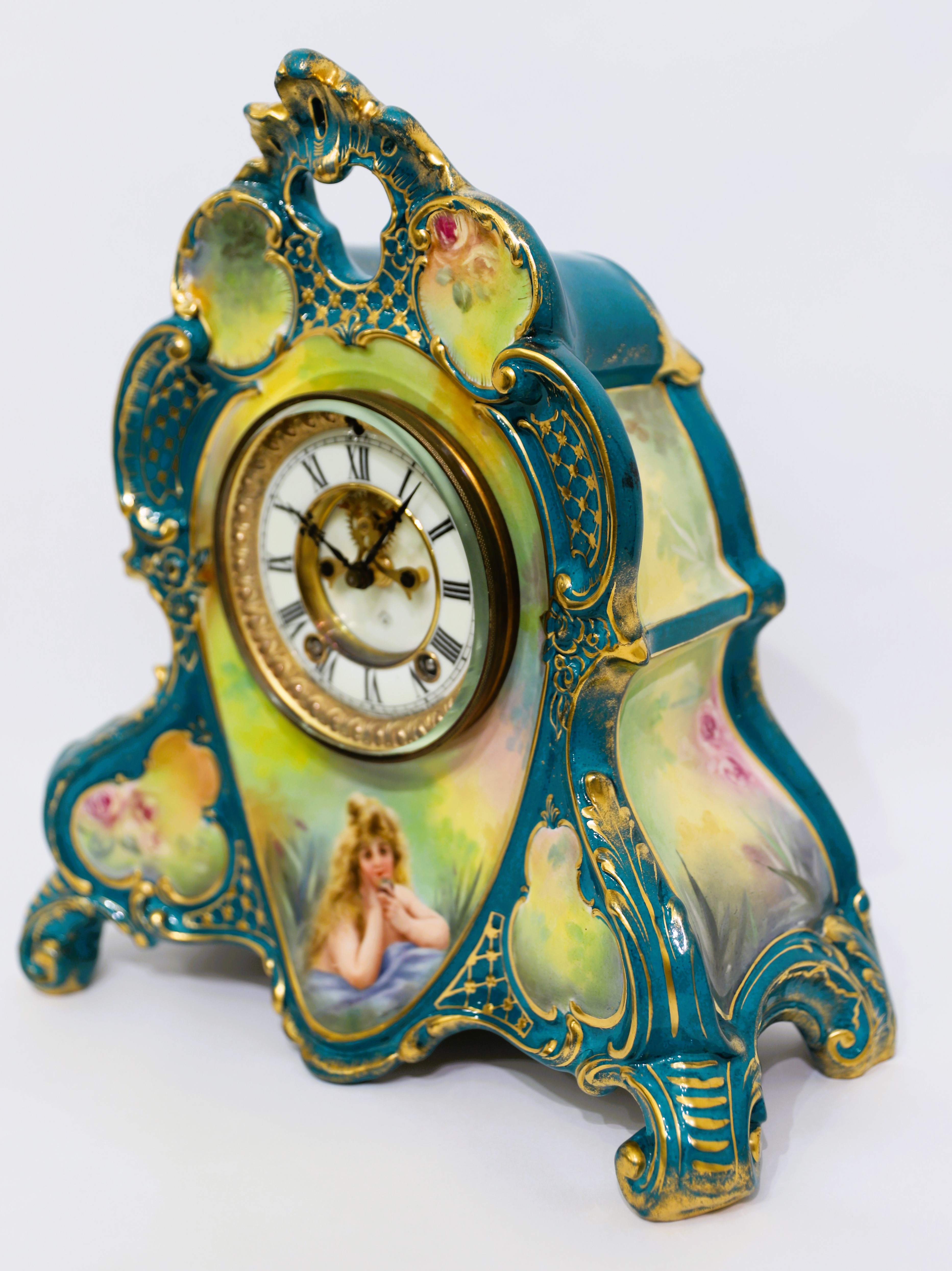 14-inch porcelain case in deep blue-green with a lovely maiden on the front – this exact clock is shown in Ly, Ansonia Clocks &