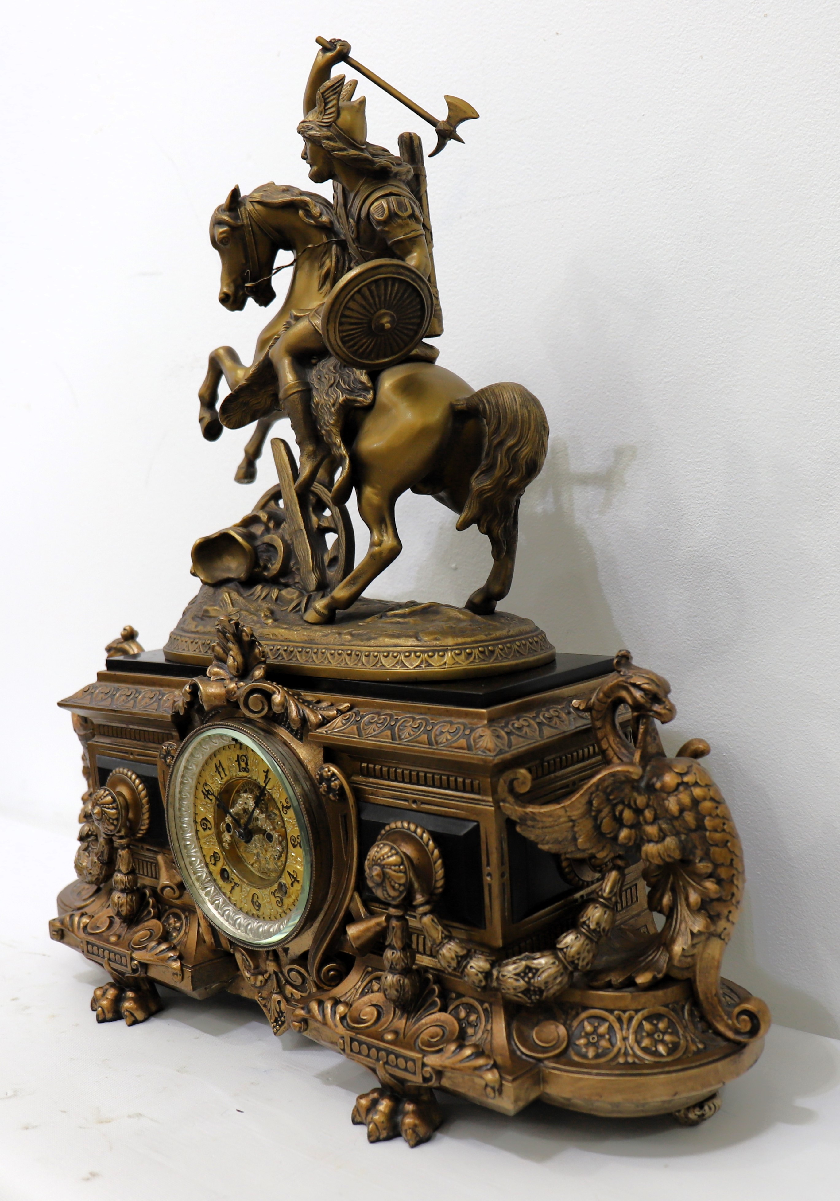 a silvered bezel and sits behind a flat beveled glass. The hands are correct. The ornate visible escapement has ruby pallets. The signed 8-day round movement has a rack and snail strike on a cathedral gong; it is running and striking on the hours and half-hours. Dagobert was King of the Franks in the middle ages and ruled over Austrasia, now France and western Europe; he ruled from Paris and