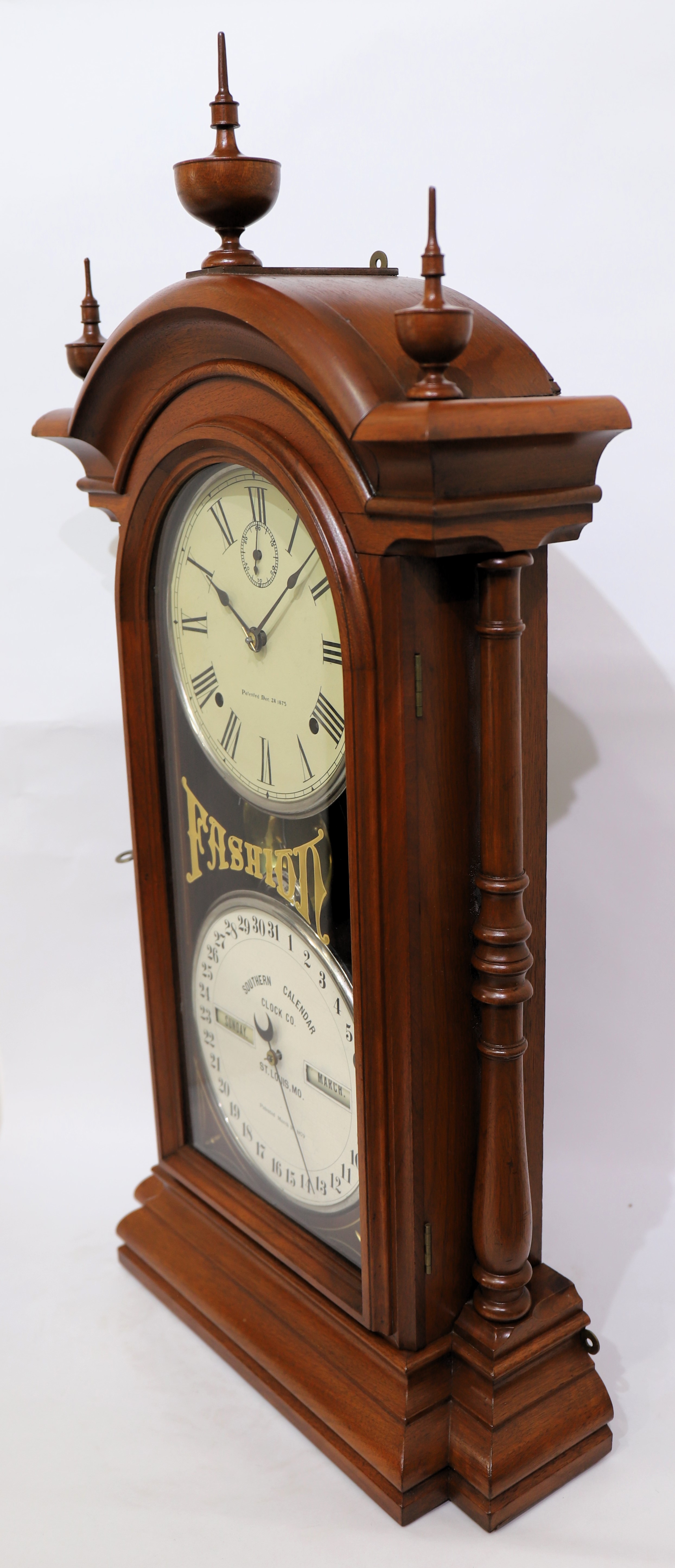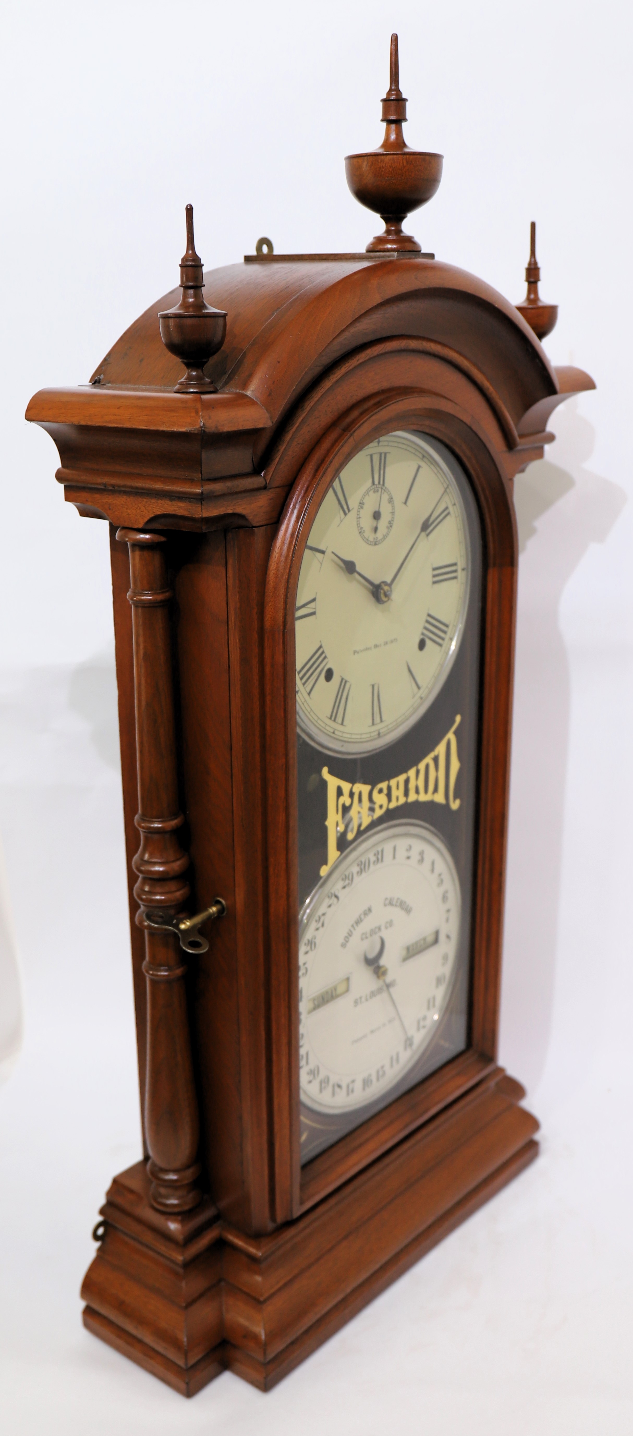 Southern Calendar Clock Co. “Fashion No. 3”, ca. 1878. The Fashion No. 3 introduced the solid walnut case and full glass door with ‘Fashion’ in gold leaf lettering. The case is 32