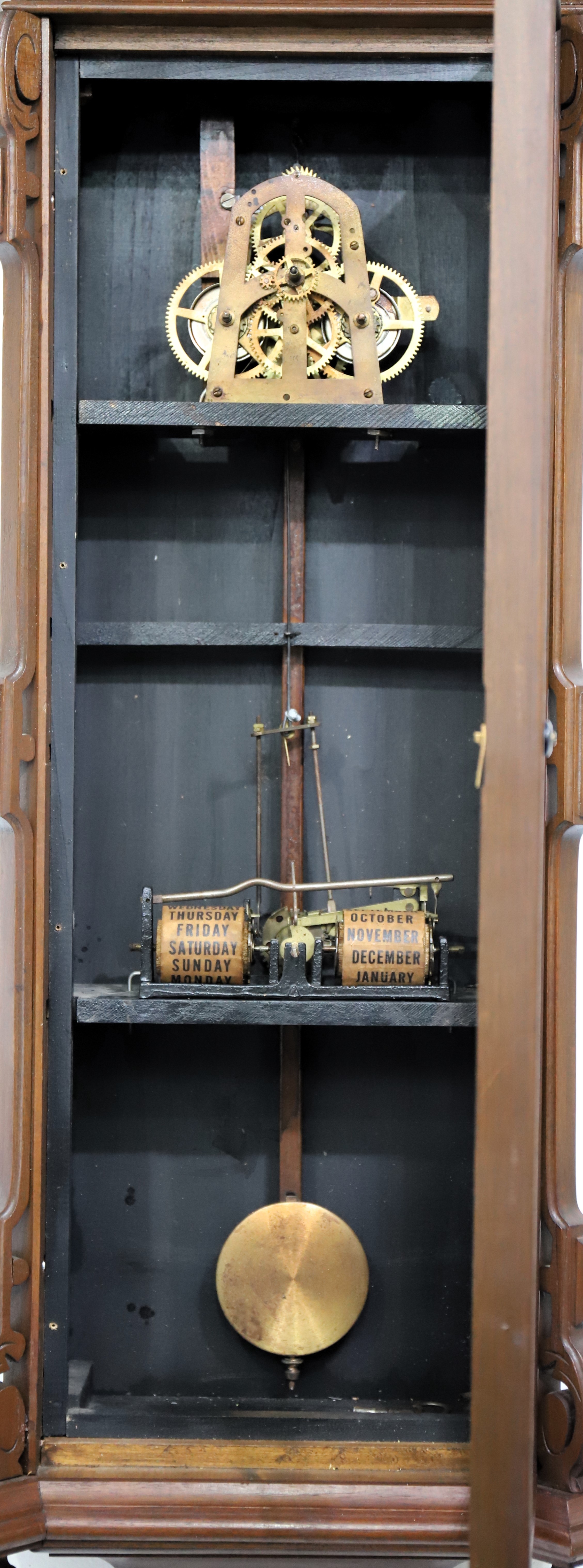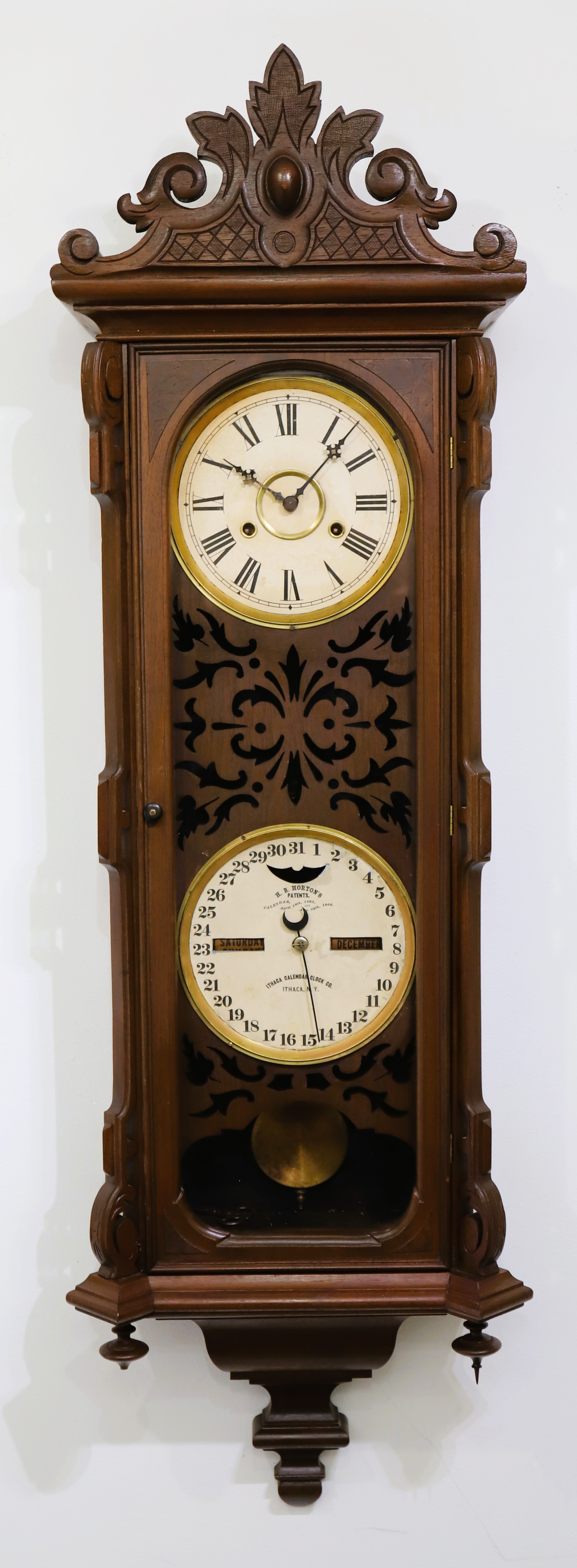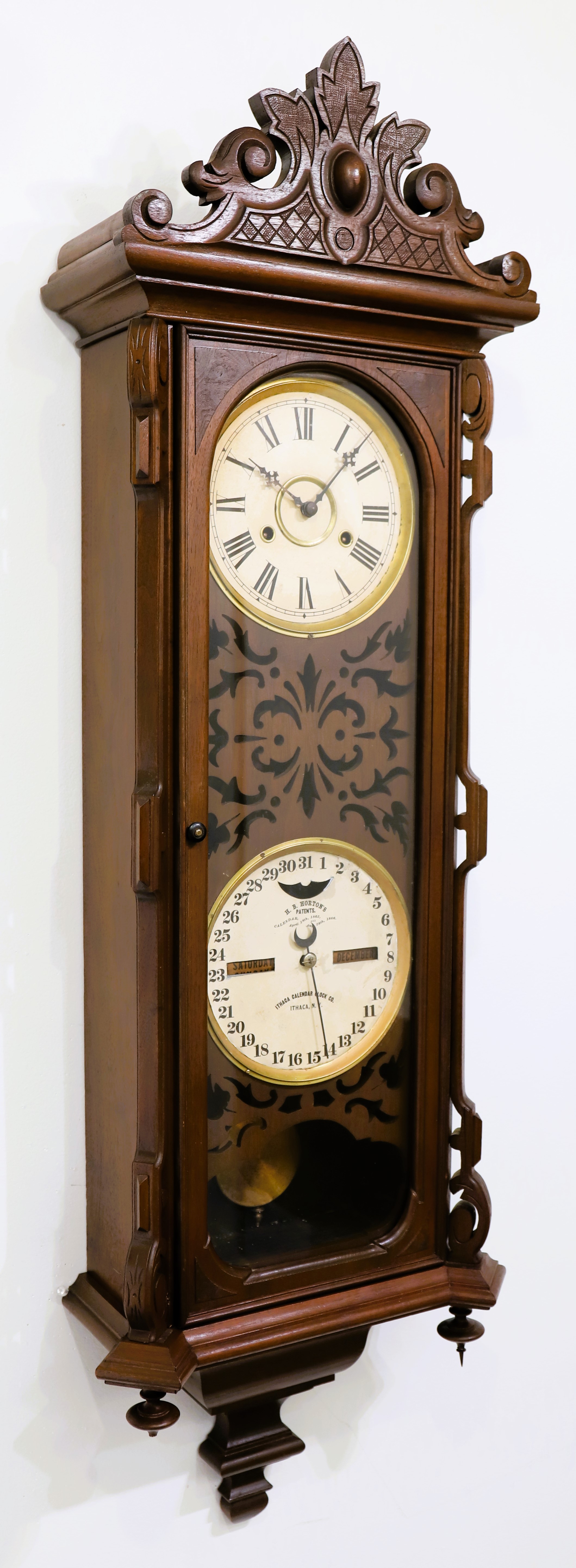 Ithaca Calendar Clock Co. “No. 3 Vienna” REPRODUCTION, ca. 1980. I do not see a signature, stamp, or initials anywhere, so I do not know who made this modern reproduction of a classic ICCC calendar