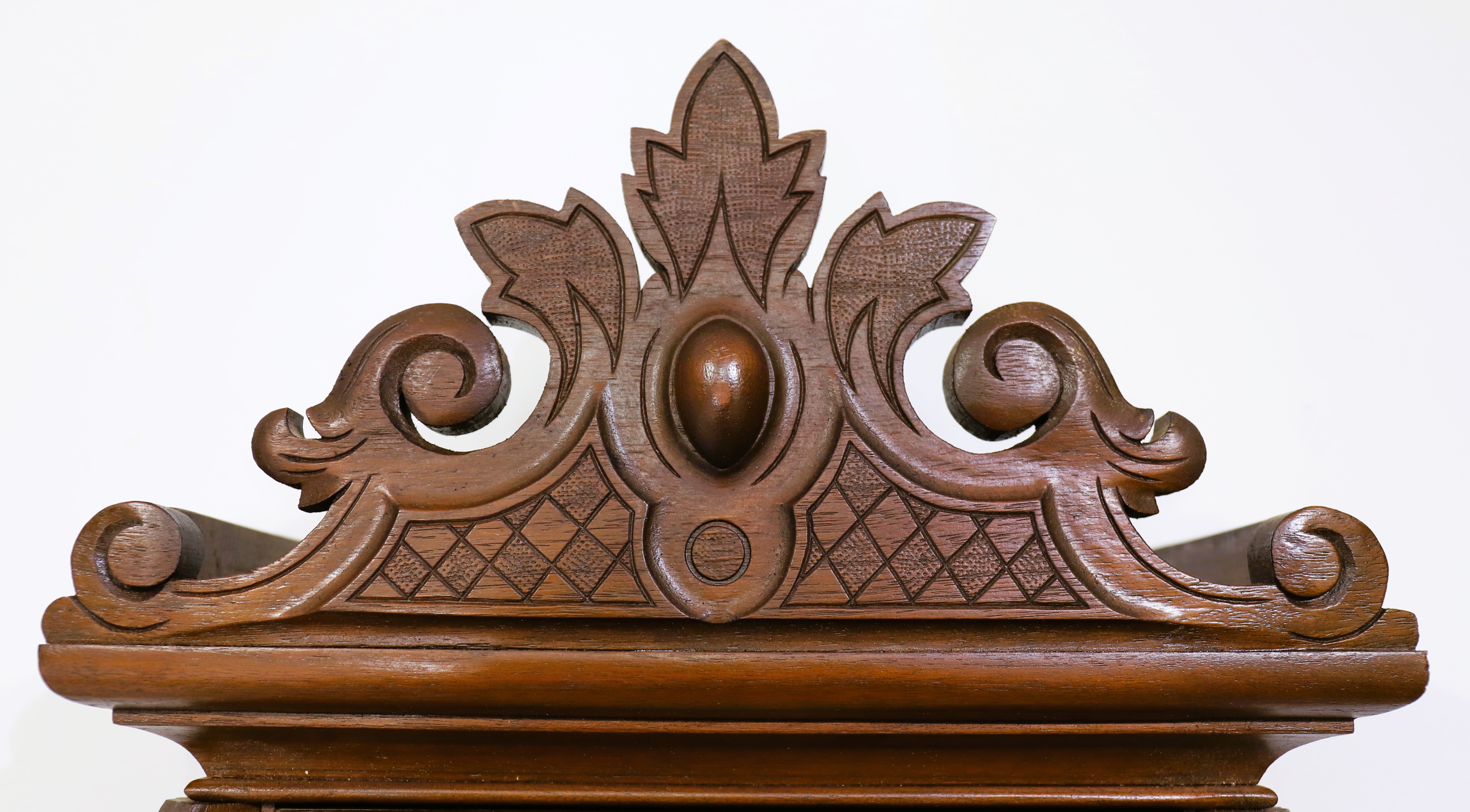 with proper side carvings and burl panels in the corners of the door. Note that the left bottom finial has lost its tip. The dial board is fenestrated as were the early models and is well-done. The interior is painted black, as was done on the originals. The 30-day, time-only movement is running but needs to be cleaned, and there are close tolerances for the pendulum between the back