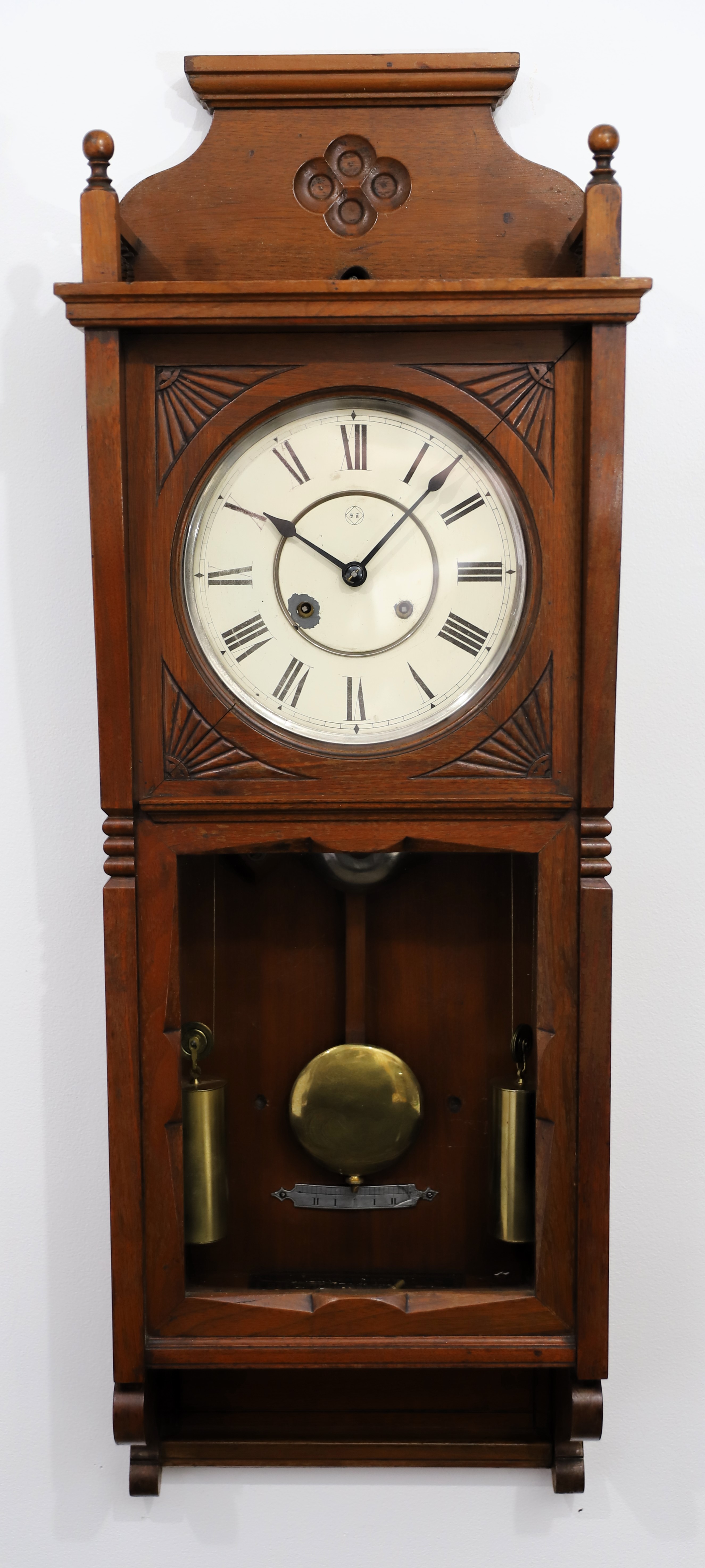 is signed and running, striking on a cathedral gong. It is driven by two brass weights that are not ST issue but do the job. There is an ST pendulum stick and brass bob, and a black label on the bottom. Note the carvings on the sides. AAC sold