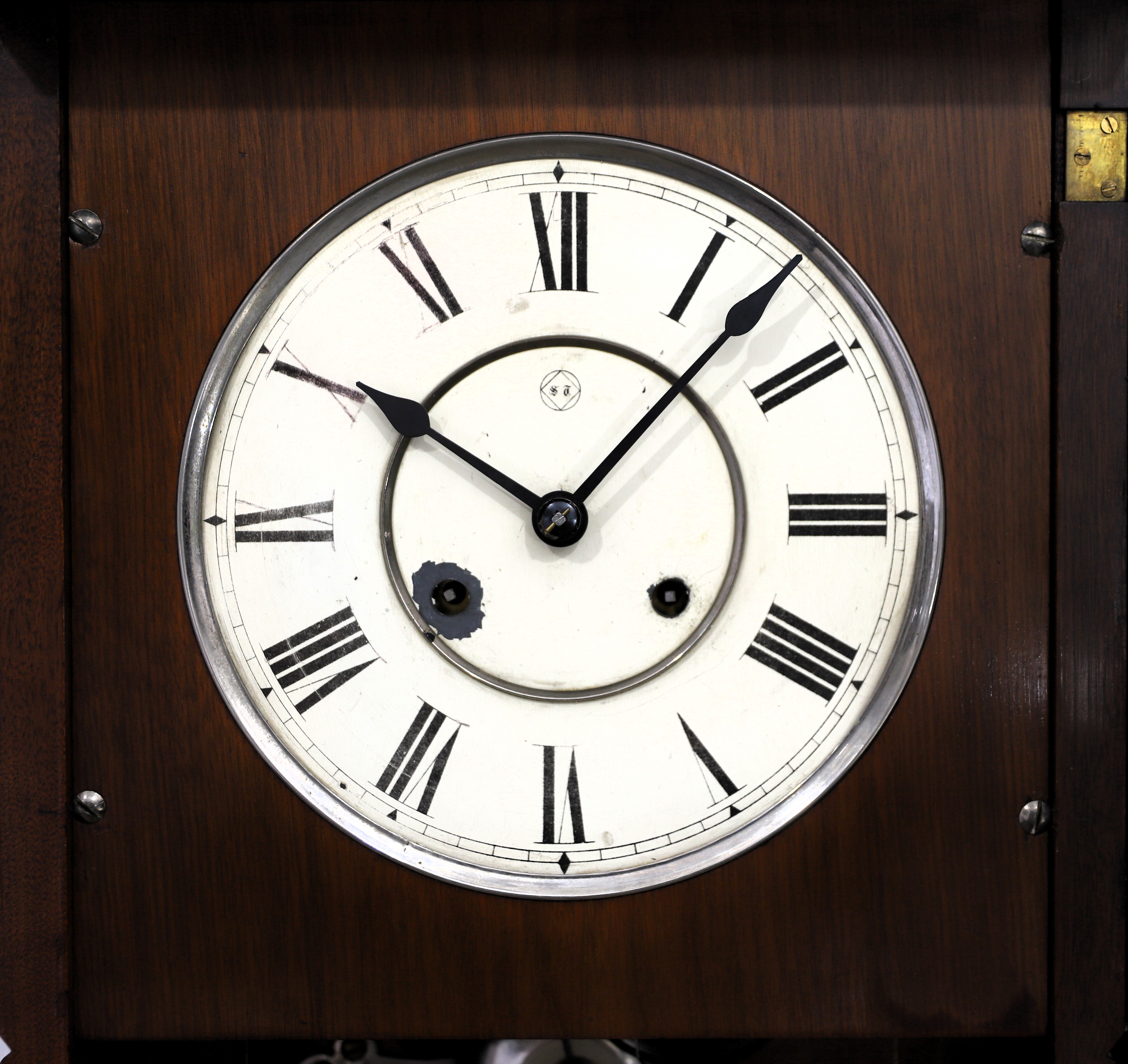 with chipping around the strike winding arbor. I think the hands are replacements. The 8-day, time-and-strike movement