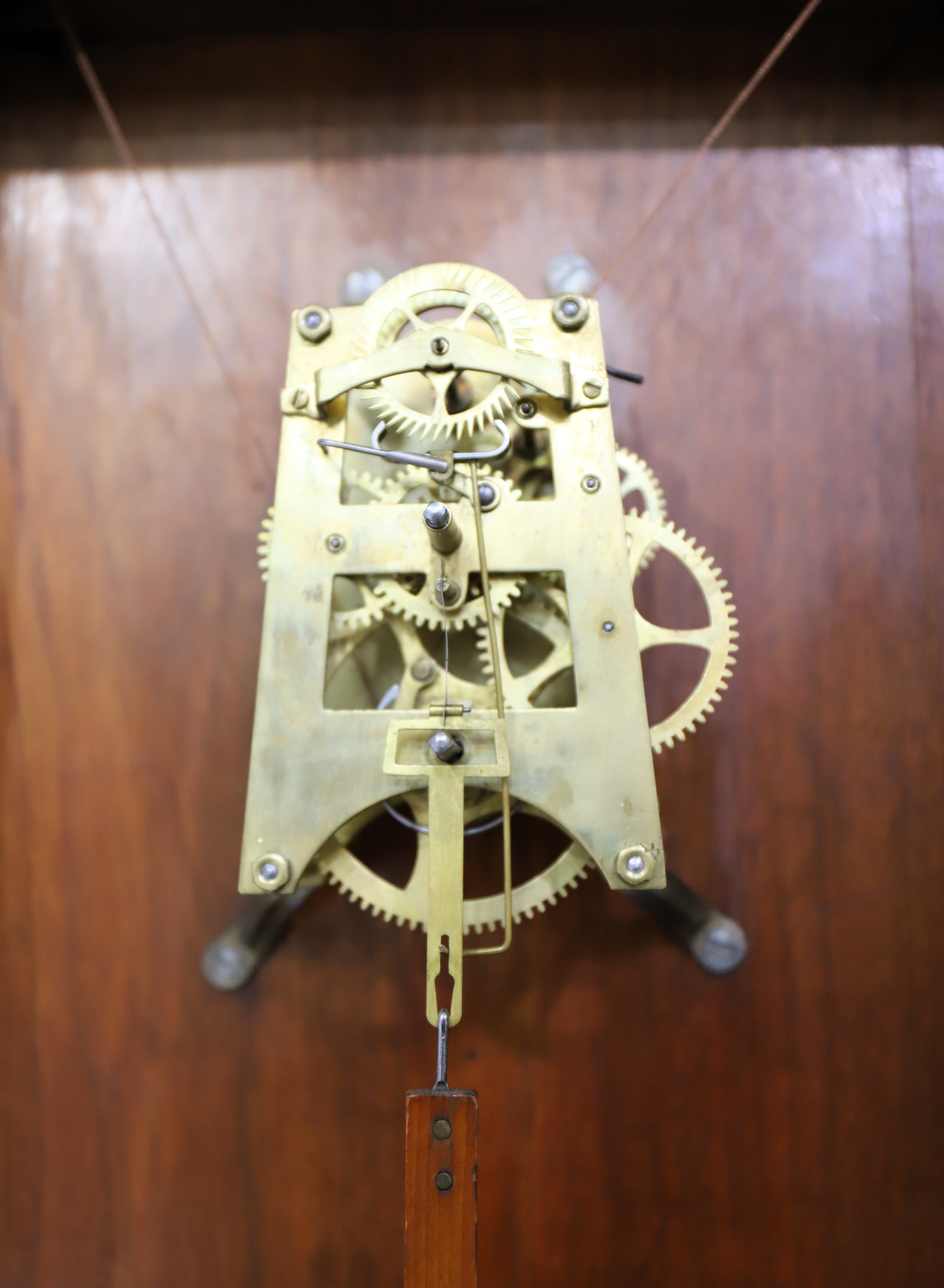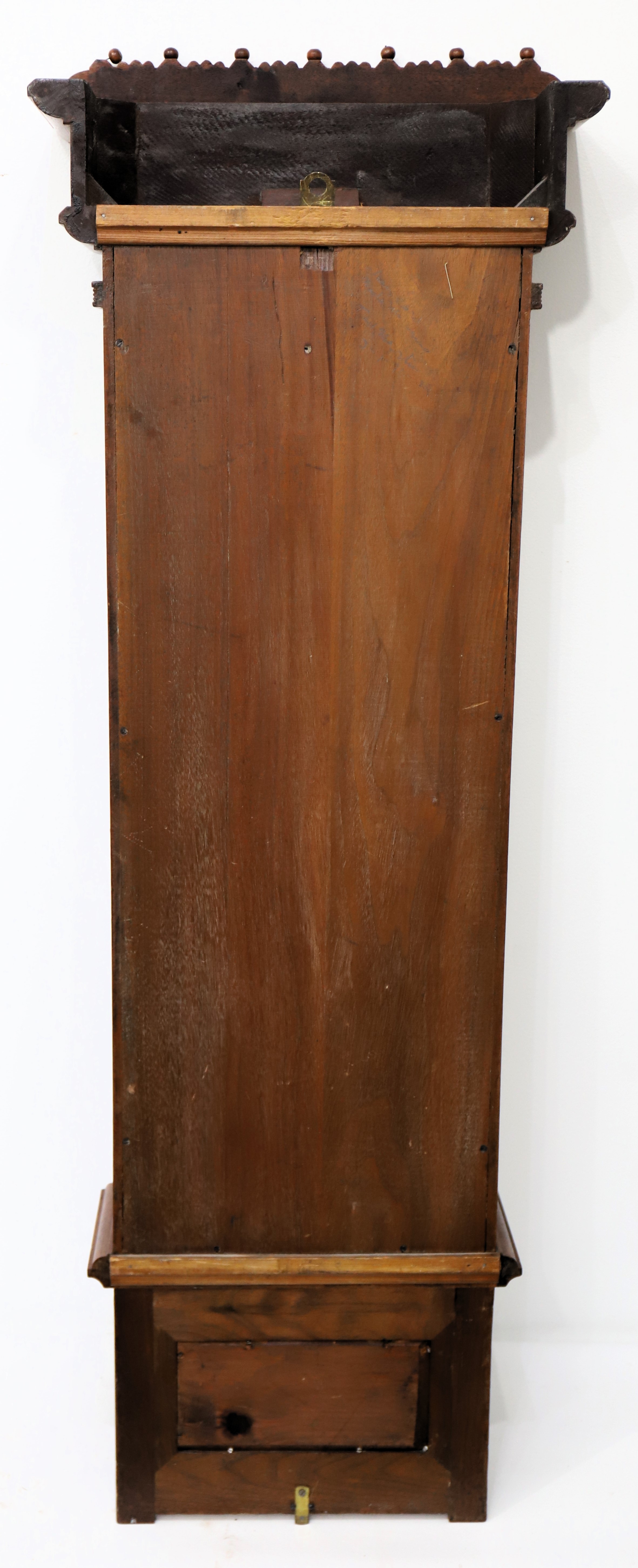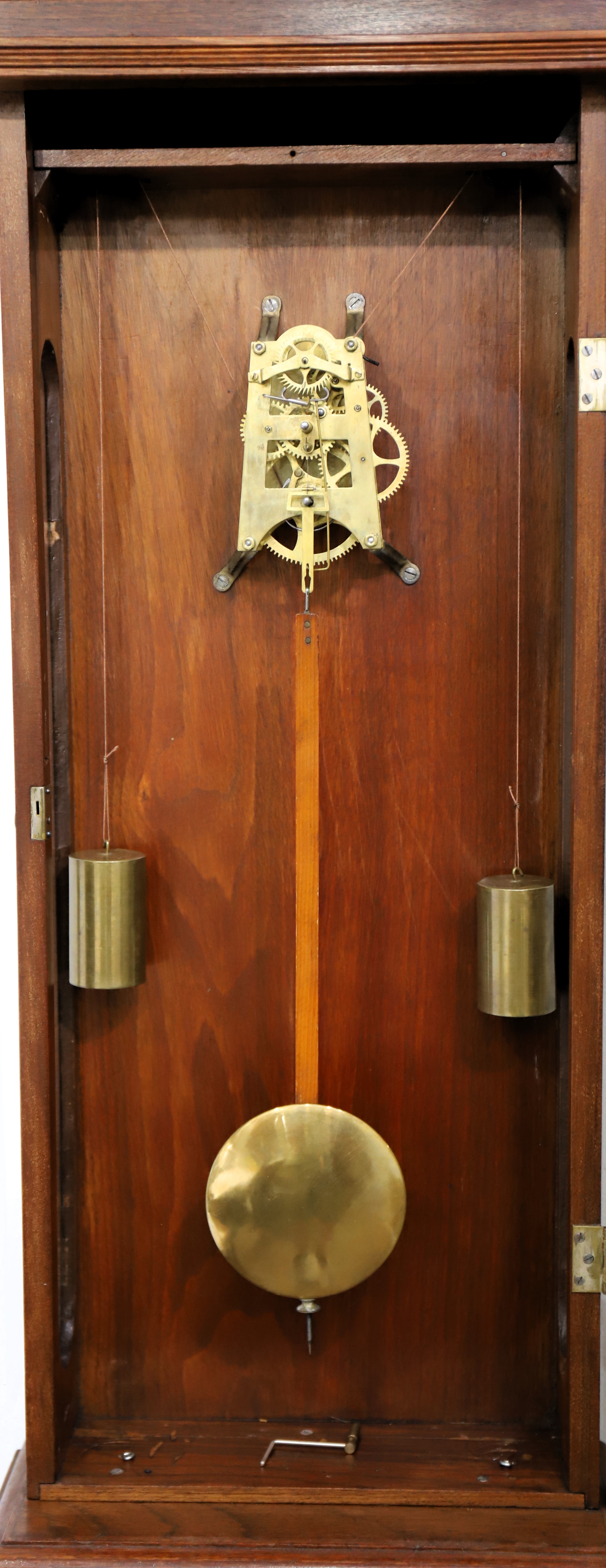 50-inch walnut case in beautiful condition with three original glasses and putty. The finish is clean and all parts are original. The paper dial is original as well, with some wear and considerable toning. The hands are period, the seconds bit a replacement. The movement is unusual in that it is driven by two small weights that run down both sides; both wind from a single arbor. It