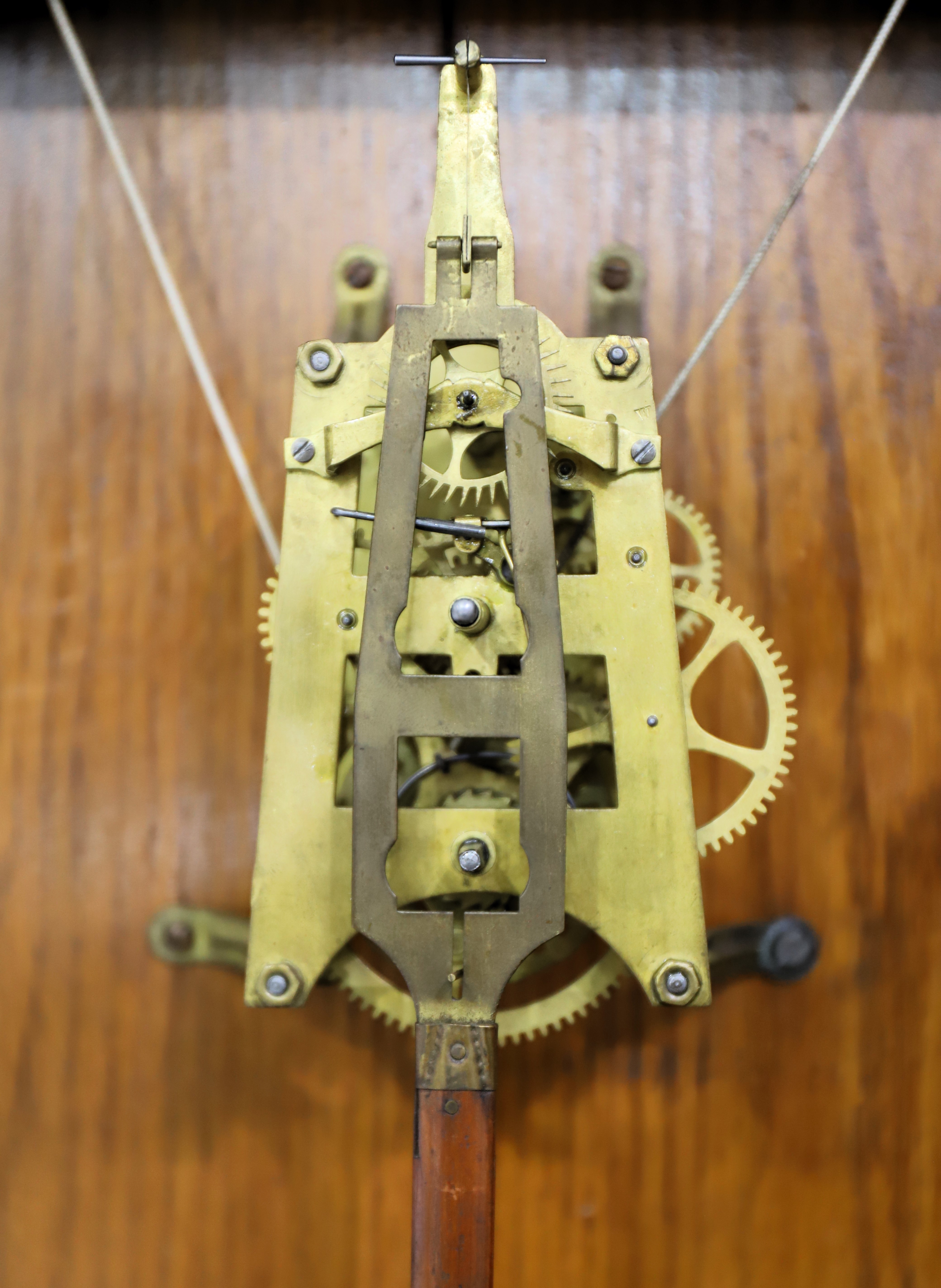 by two brass weights on each side that I don’t believe are original. The pendulum stick and bob are likely original; there is